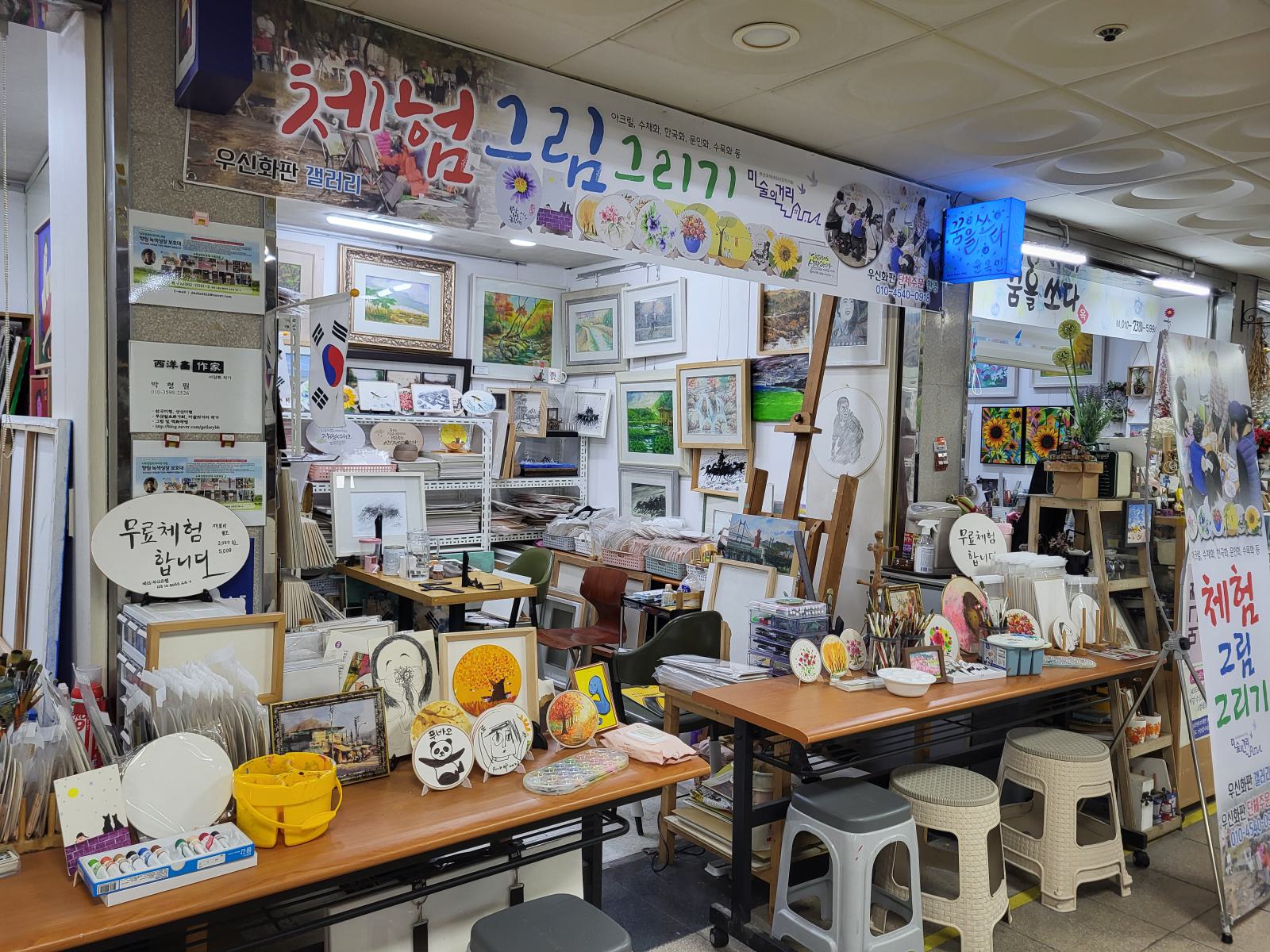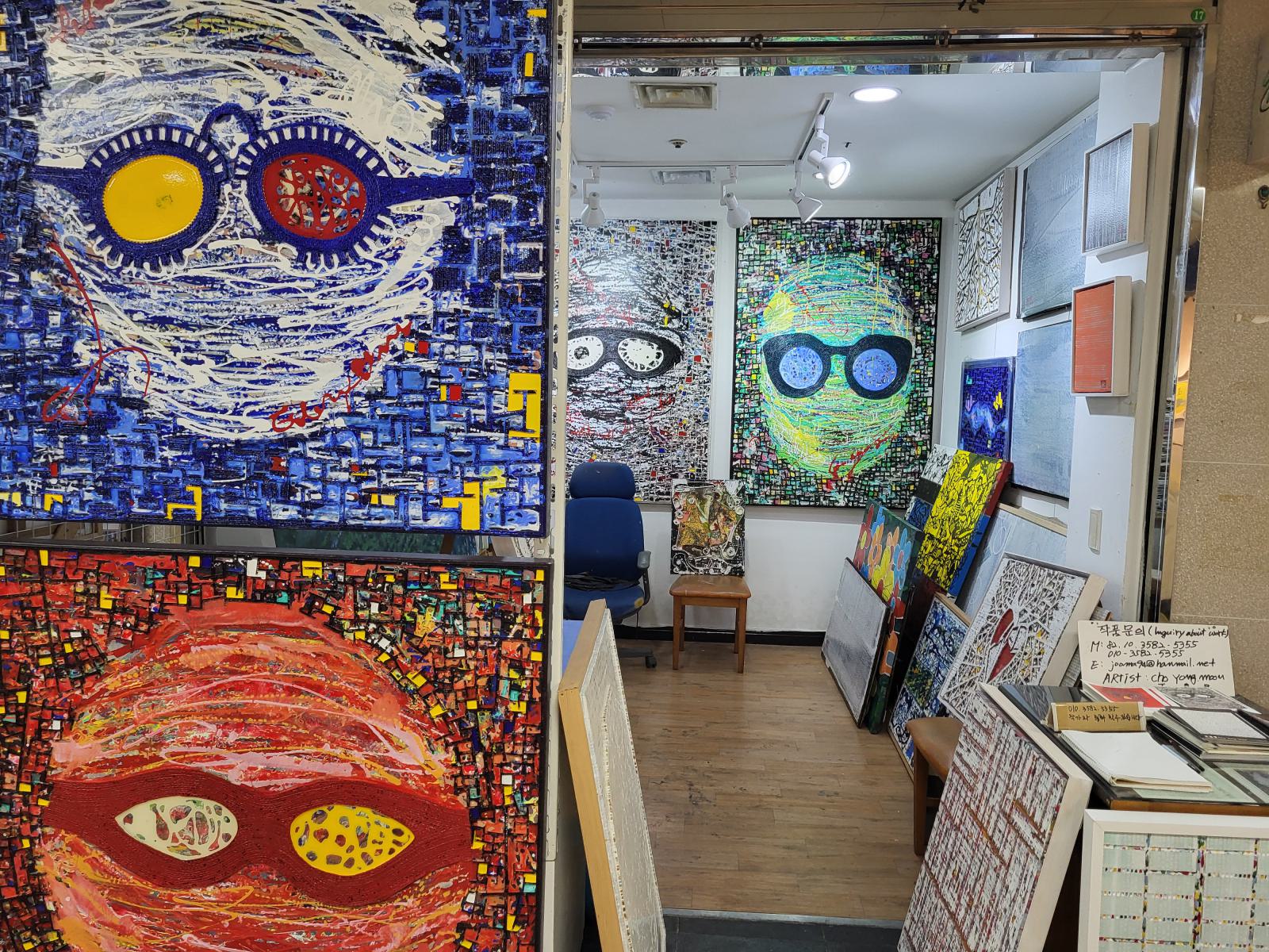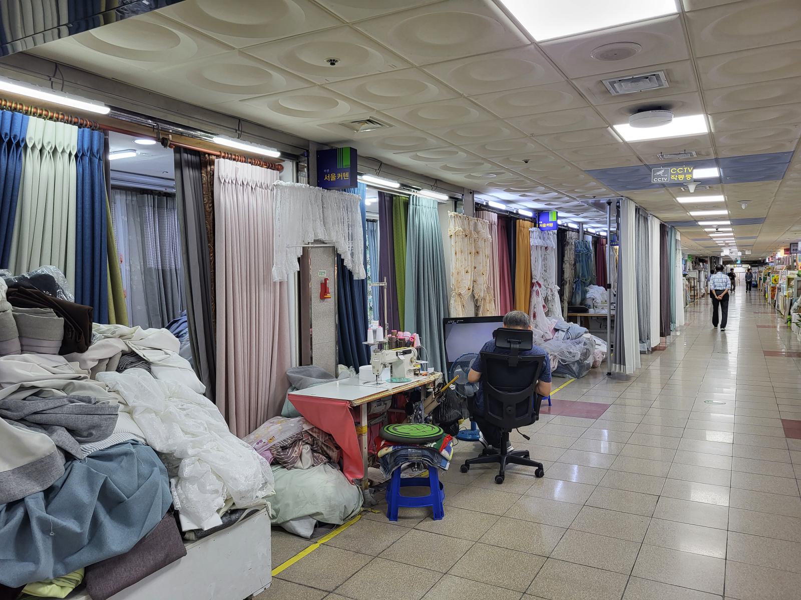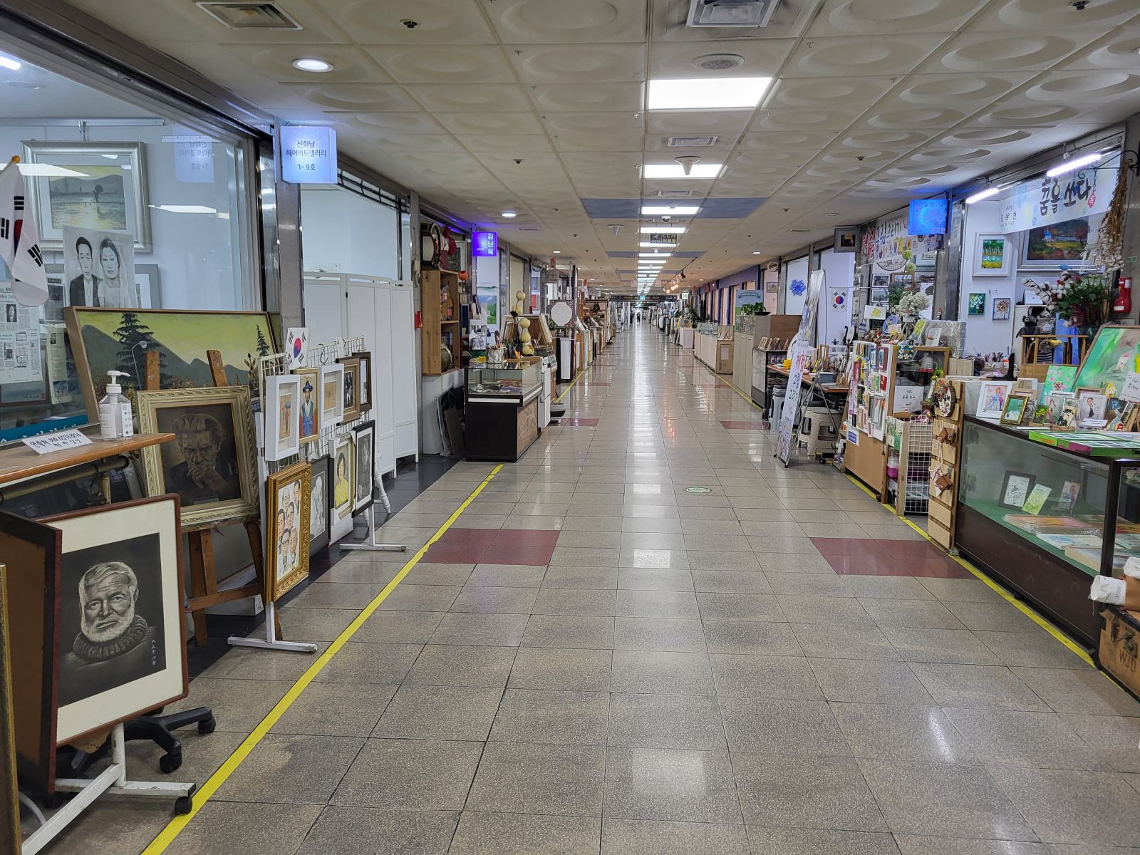 Ein paar Meter die Straße hoch führt eine Treppe in einen klimatisierten unterirdischen Gang. Art Street stand oben auf einem Wegweiser, wir vermuteten eine Kunstgalerie. Die fanden wir zunächst auch, sogar mehrere, in unterschiedlichen Stilen. Allerdings war nur wenig besonderes dabei. Daneben gab es Läden mit Dekoartikeln und mehrere Gardinenstände, wo auch gleich jemand mit Nähmaschine saß. Alle Läden waren offen, aber außer bei den Gardinen gab es keine Menschen, nur Telefonnummern, falls man etwas kaufen will. Es dauerte eine Weile, bis wir verstanden, dass wir nicht in einer Kunstausstellung, sondern sowas wie dem koreanischen Ikea gelandet waren.