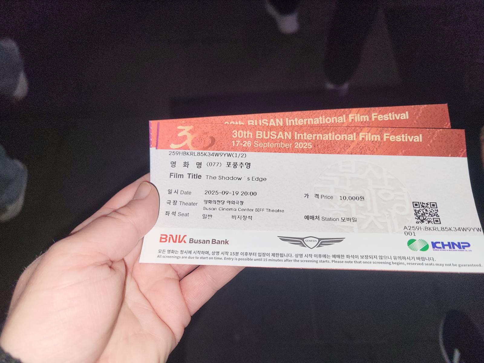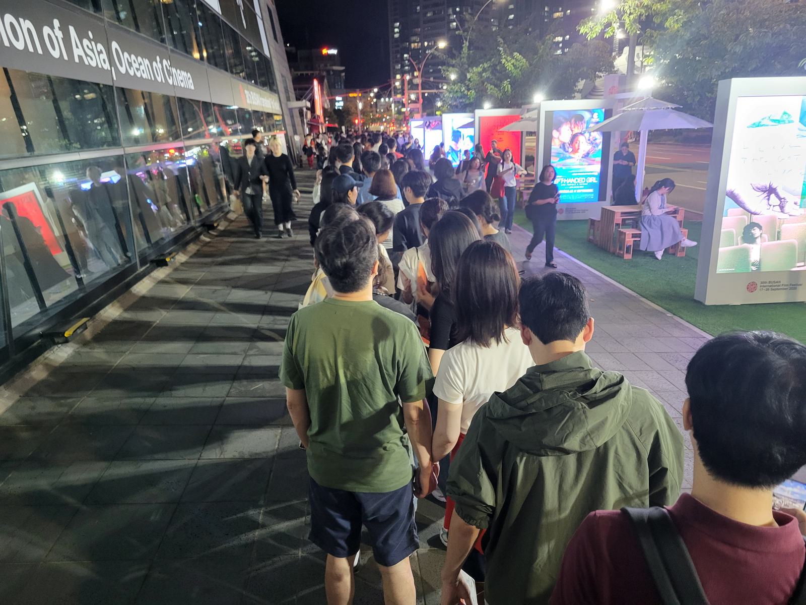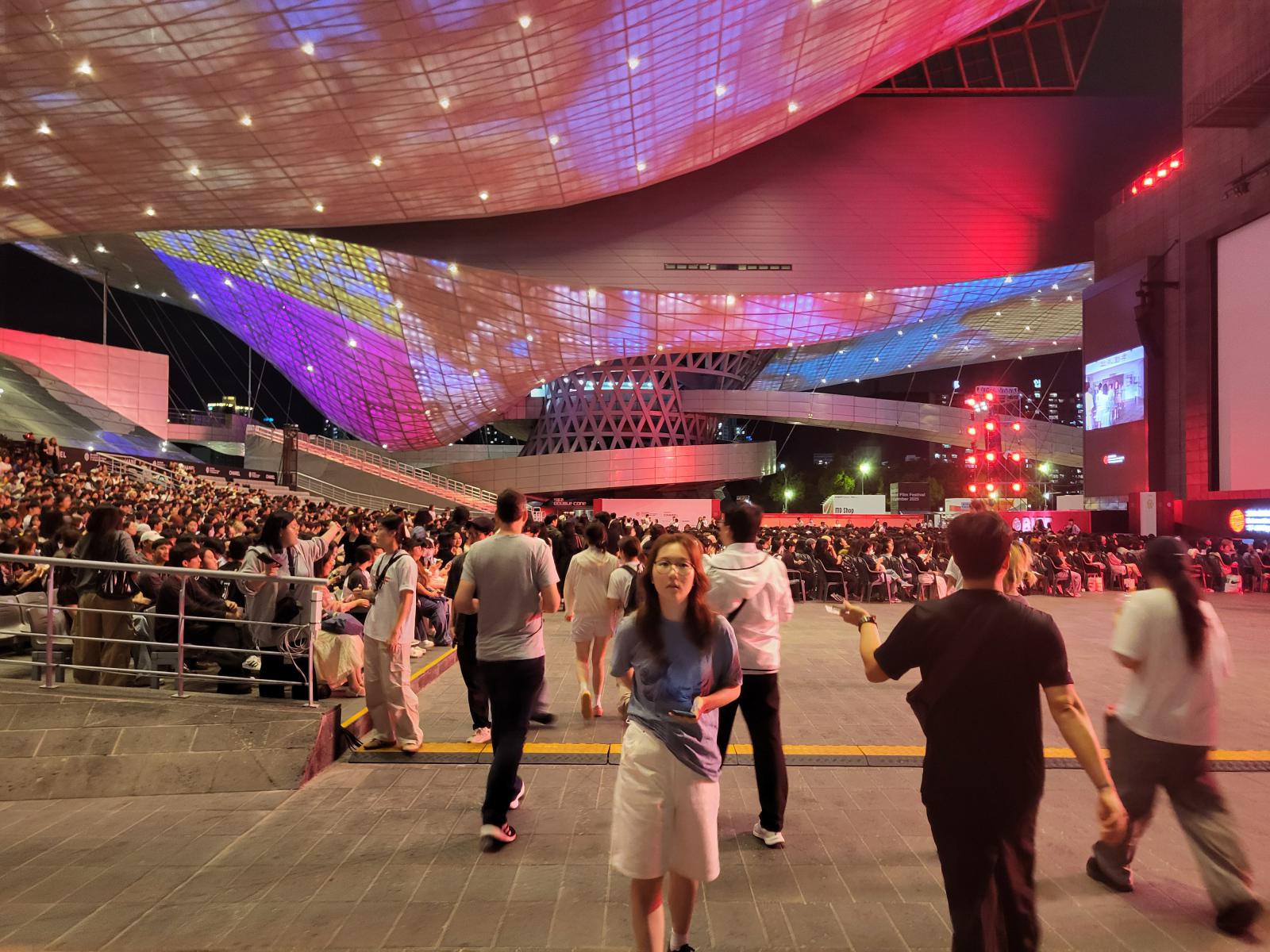 Erstmal mussten wir wieder anstehen um unsere Karten abzuholen. Es gibt in Korea keine Onlinetickets, man muss die Tickets immer selbst abholen. Eigentlich ein guter Weg, um teure Weiterverkäufe auszuschließen, aber wir mussten in dem Gewusel erstmal den Ticketschalter finden und dann das Kino. BIFF Theater, das gab es garnicht. Wir fragten und wurden in die nächste Schlange verwiesen, gut 200 Meter lang, dann um die Ecke des Festivalgeländes herum und dort nochmal durch vier Lanes. Was soll das denn für ein Kino sein? Plötzlich waren wir drin und sprachlos. Mindestens 5000 Leute passen in diese Anlage. Unter einem endlosen, wild geschwungenen Dach hängen nebeneinander drei Leinwände, eine so groß wie bei uns ein ganzes Kinogebäude.