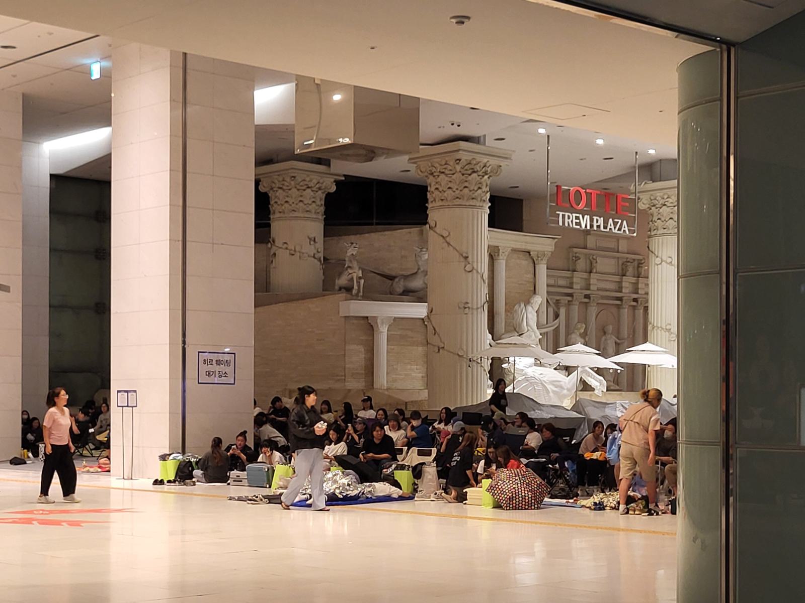 Auf dem Rückweg folgten wir wieder der Masse, auf seltsamen Schleichwegen, die sich tatsächlich als Abkürzung zur U-Bahn entpuppten. Dort angekommen sahen wir das nächste Level des beliebten koreanischen Hobbys, Schlange stehen: in der Schlange vor einer Lotte Mall übernachten.