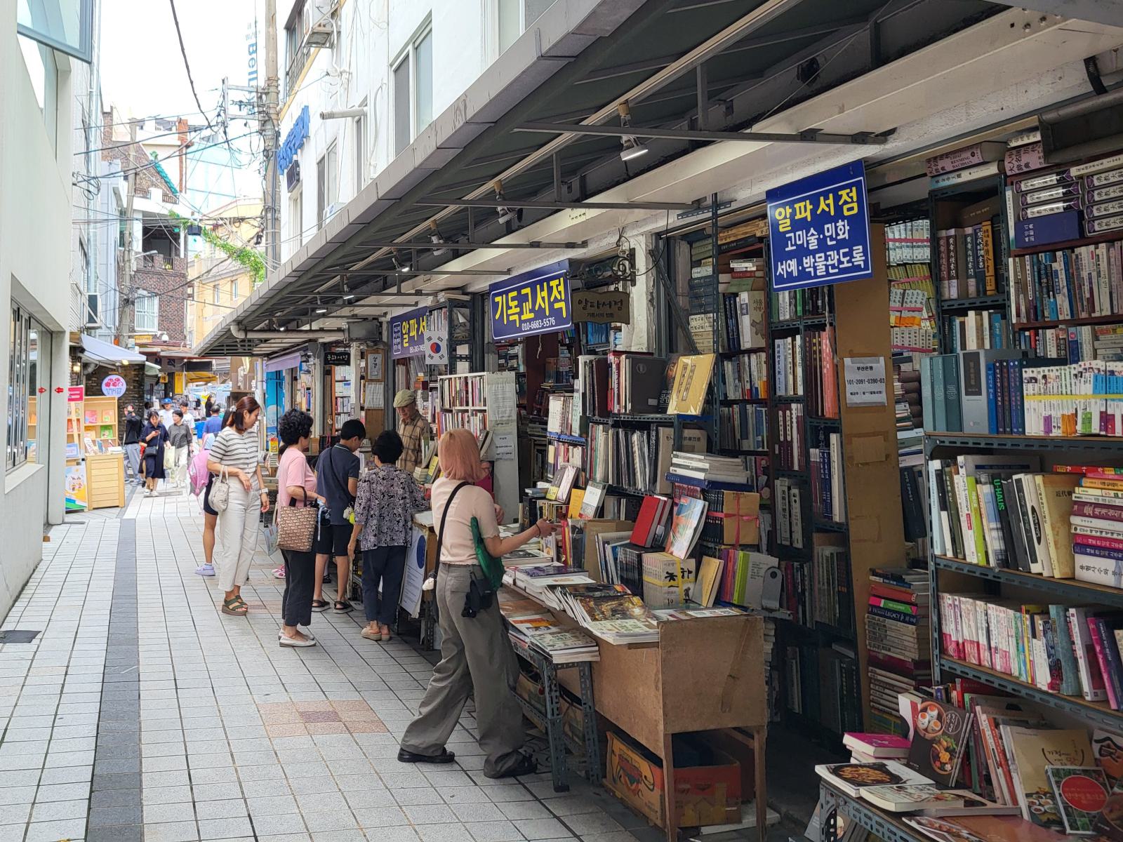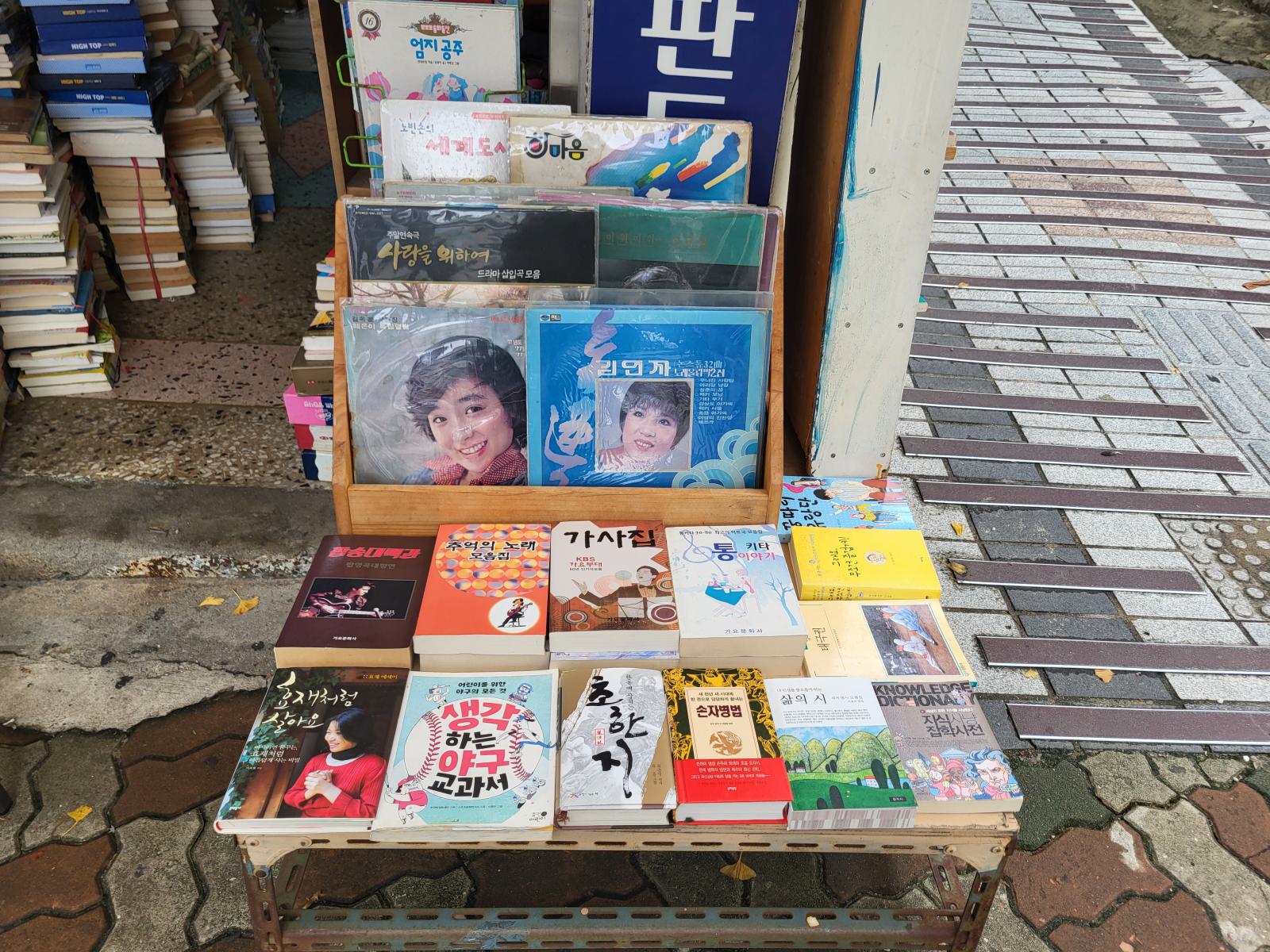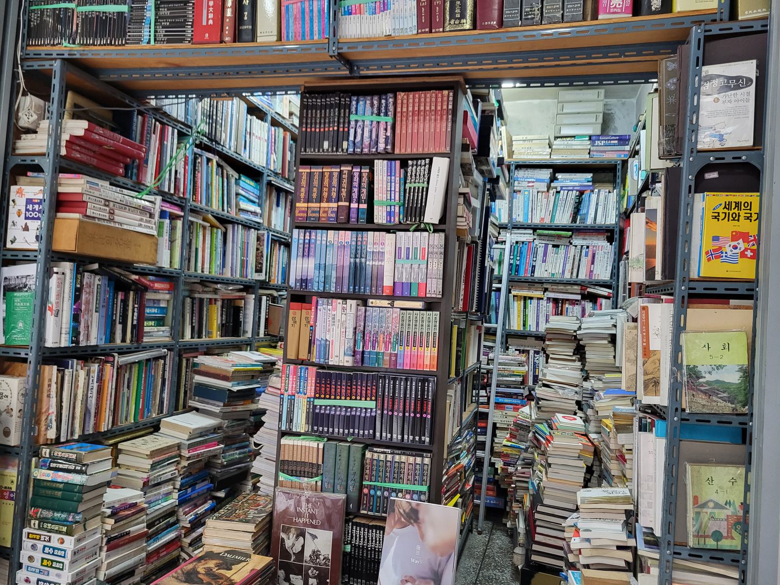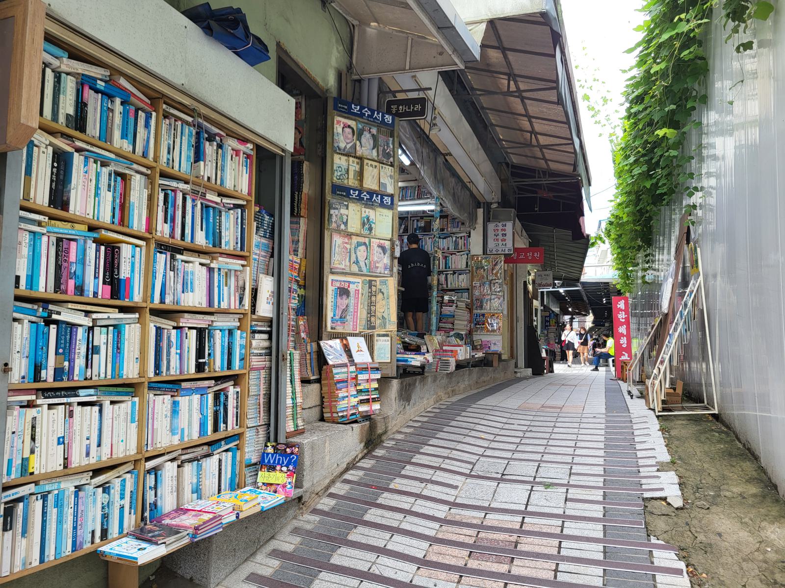 Am Rand des Marktes, an der nächsten Hauptstraße liegt die Bookstreet. Große Buchläden fassen in Korea scheinbar auch keinen Fuß. Eine schmale, von Bücherstapeln gesäumte Gasse schlängelt sich den Berg hoch. Manche Stände gehen in kleine Ladennischen über, in denen man leicht unter Büchern begraben werden kann. Wo es einen zweiten Stock gibt, sind auch die Treppen zugestopft. Alte Bücher lagern draußen, neuere manchmal drin, mehr Logik oder Ordnung konnten wir nicht erkennen. Was, wenn man ein Buch von ganz unten braucht oder überhaupt was bestimmtes sucht?