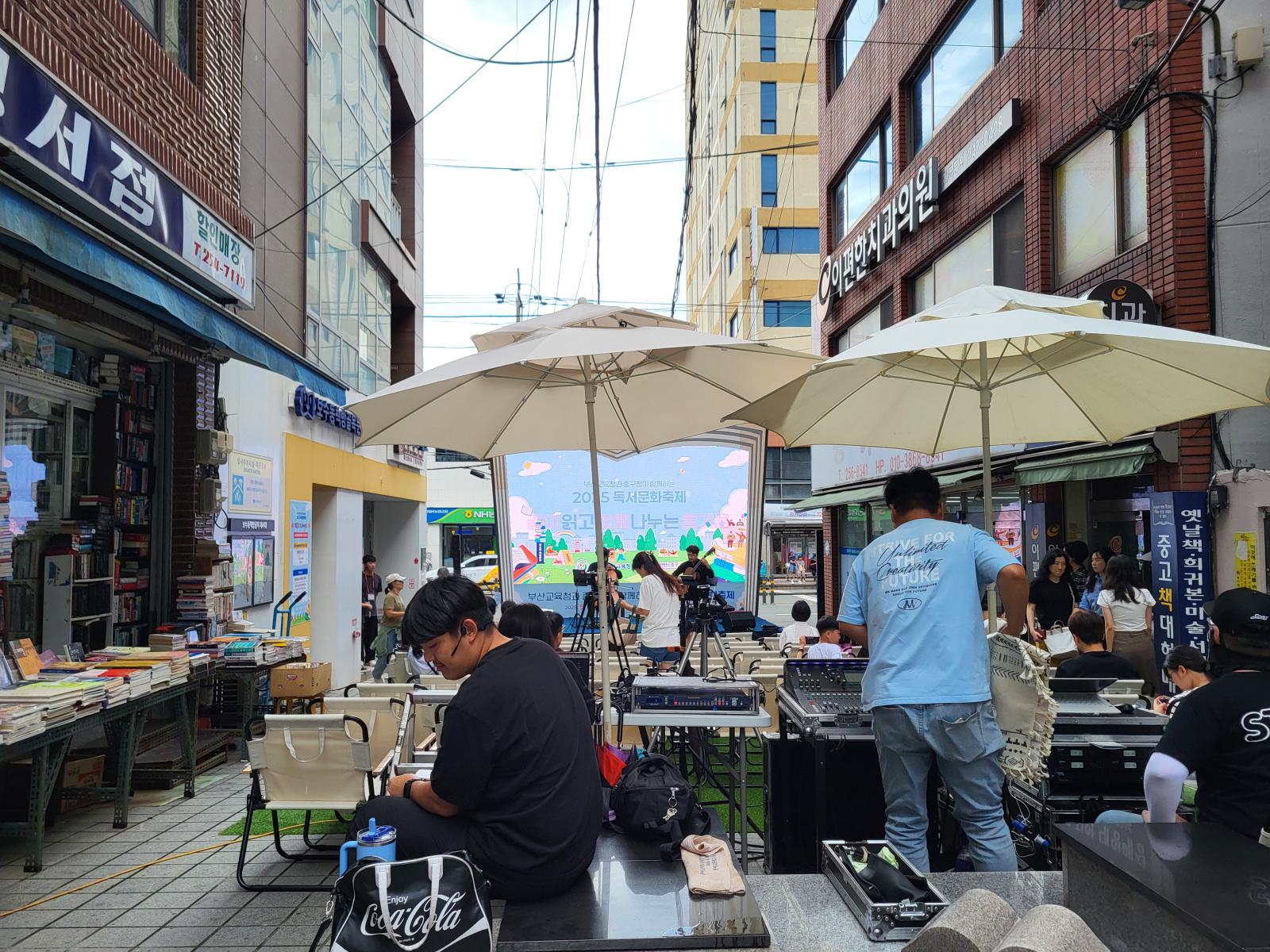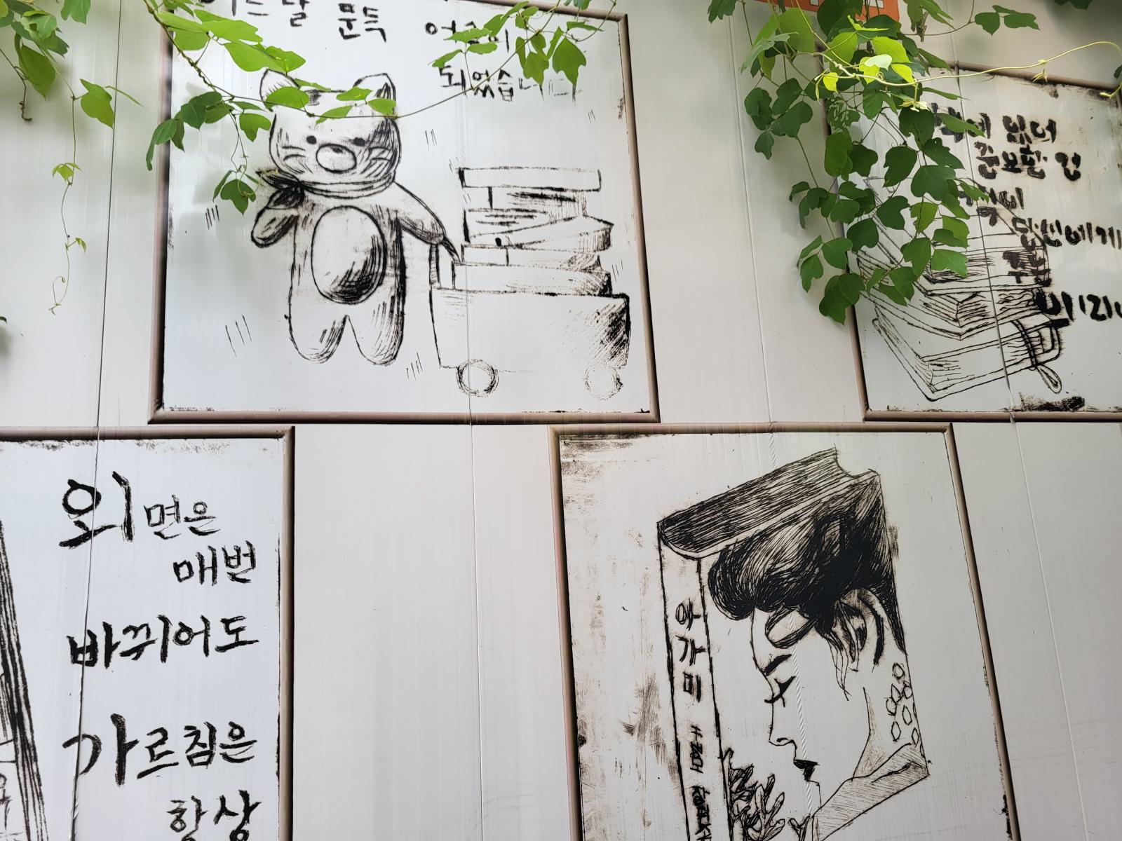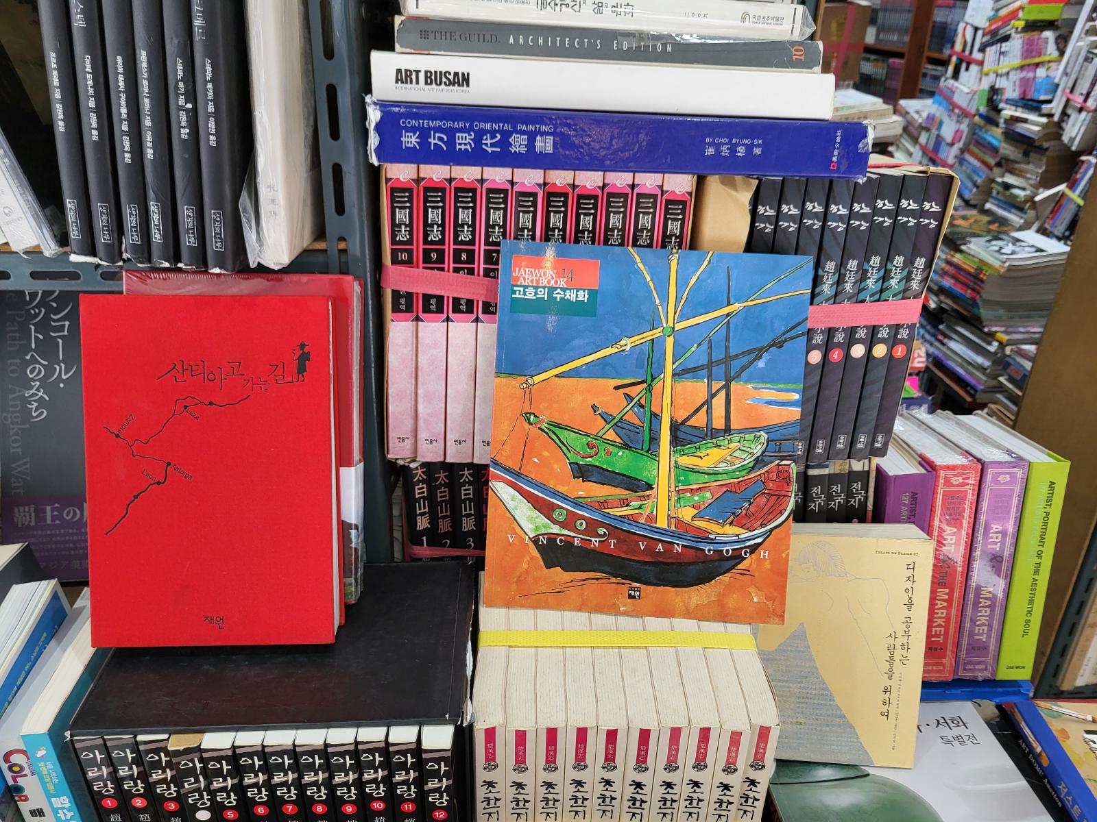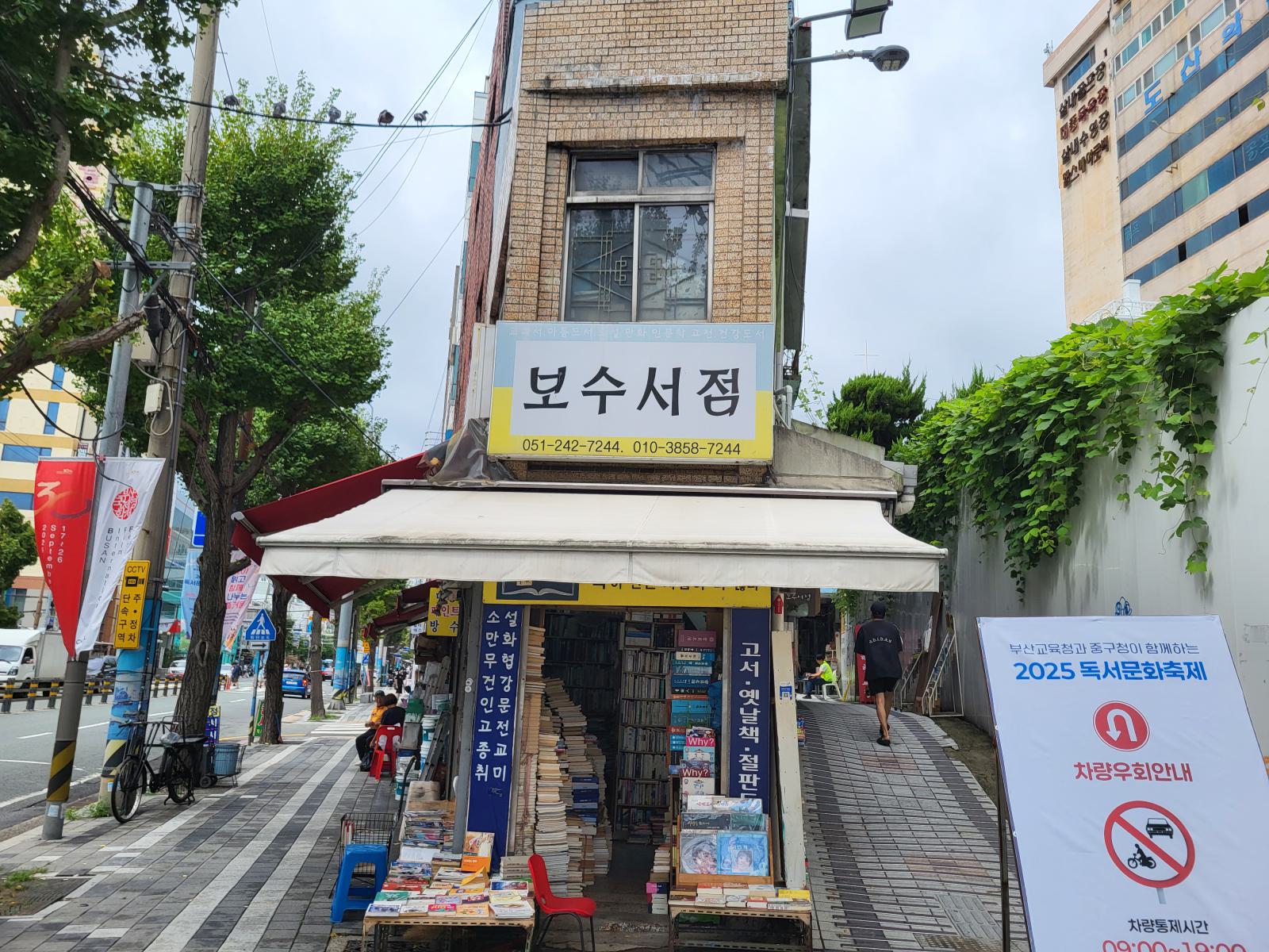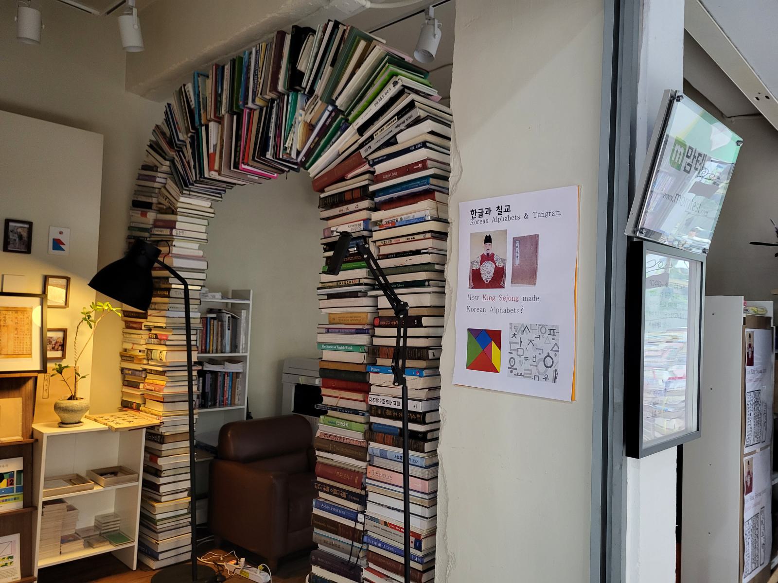 Am Rand des Marktes, an der nächsten Hauptstraße liegt die Bookstreet. Große Buchläden fassen in Korea scheinbar auch keinen Fuß. Eine schmale, von Bücherstapeln gesäumte Gasse schlängelt sich den Berg hoch. Manche Stände gehen in kleine Ladennischen über, in denen man leicht unter Büchern begraben werden kann. Wo es einen zweiten Stock gibt, sind auch die Treppen zugestopft. Alte Bücher lagern draußen, neuere manchmal drin, mehr Logik oder Ordnung konnten wir nicht erkennen. Was, wenn man ein Buch von ganz unten braucht oder überhaupt was bestimmtes sucht?