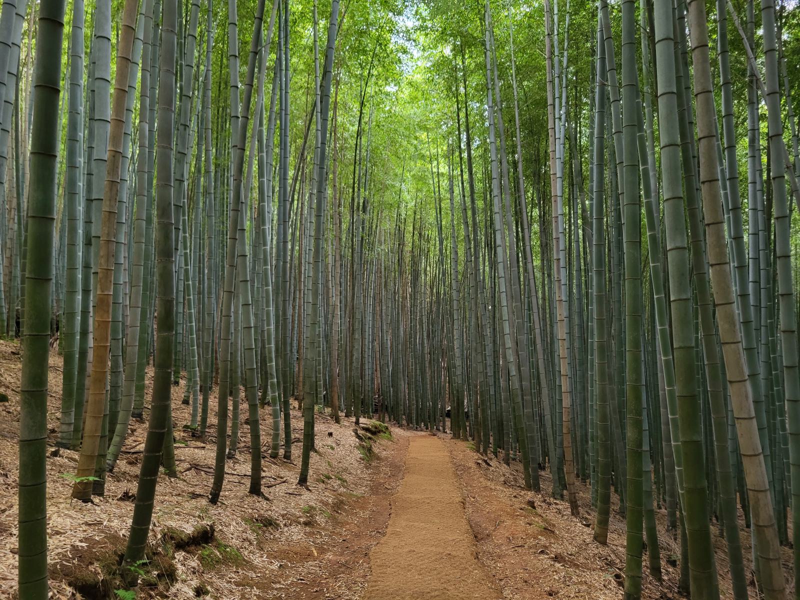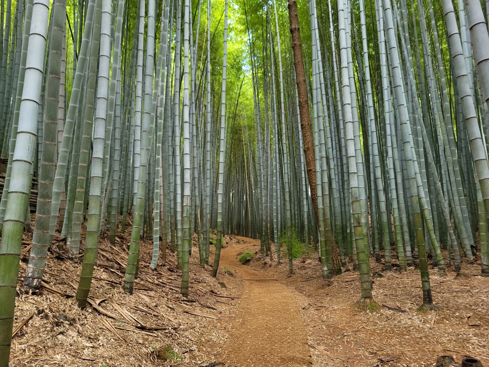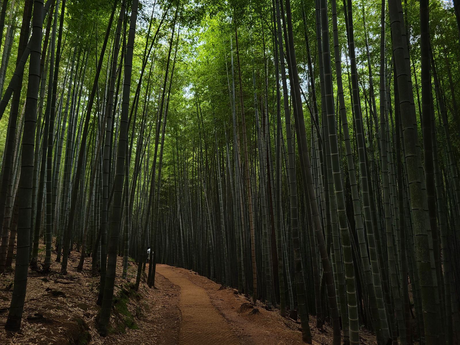 Die meisten Leute wollten nur zur Filmlocation und kehrten hier um, dabei führte der Rundweg auf einem schmalen Pfad erst jetzt in den schönsten Teil. Ein unwirklicher Zauberwald erwartete uns. Der Bambus war hier so hoch und dicht, dass es ganz dunkel wurde, und der Pfad war so kurvig, dass wir die wenigen anderen Personen sofort aus den Augen verloren. Die Halme schluckten jedes Geräusch, nur das Rauschen und Klappern des Waldes selbst blieb übrig, keine Stimmen, keine Schritte. Der Pfad führte nach unten und immer tiefer hinein. Unten setzten wir uns auf eine Bank, lauschten dem Klappern und genossen die verwunschene Atmosphäre.