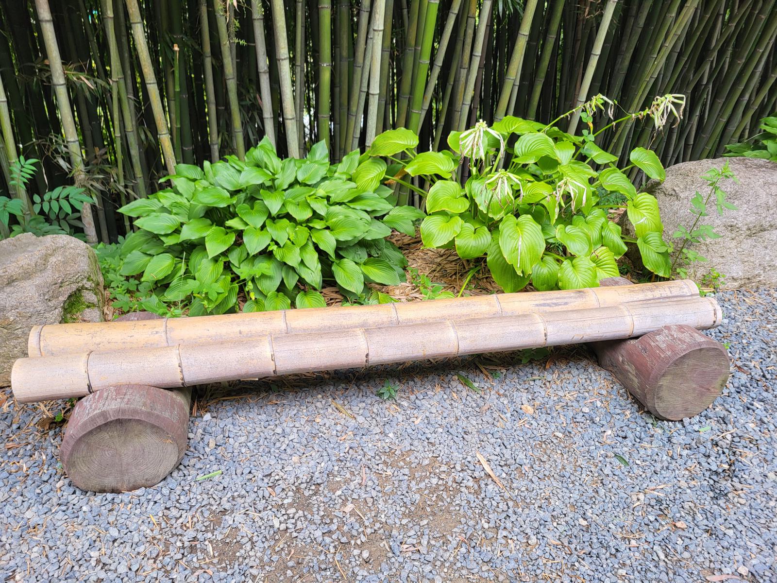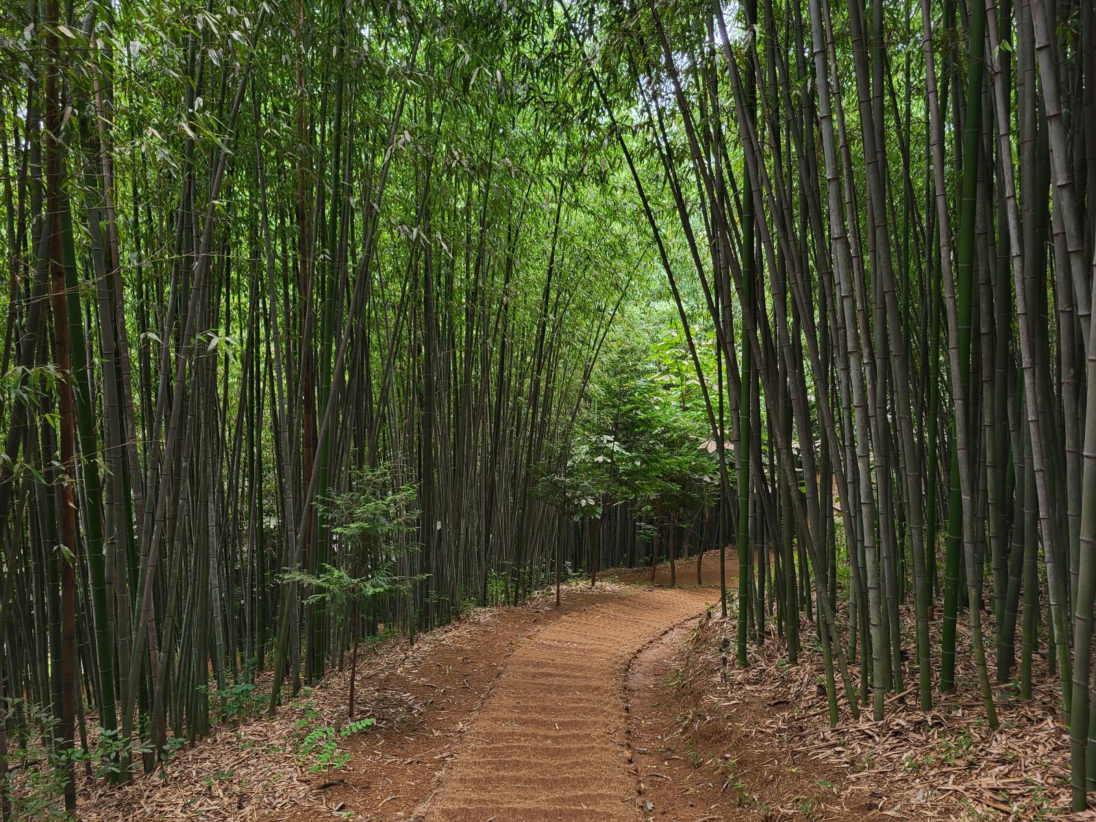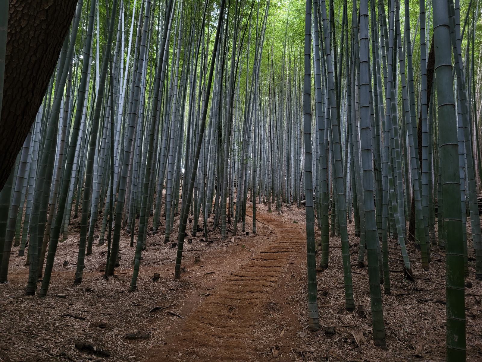 Die meisten Leute wollten nur zur Filmlocation und kehrten hier um, dabei führte der Rundweg auf einem schmalen Pfad erst jetzt in den schönsten Teil. Ein unwirklicher Zauberwald erwartete uns. Der Bambus war hier so hoch und dicht, dass es ganz dunkel wurde, und der Pfad war so kurvig, dass wir die wenigen anderen Personen sofort aus den Augen verloren. Die Halme schluckten jedes Geräusch, nur das Rauschen und Klappern des Waldes selbst blieb übrig, keine Stimmen, keine Schritte. Der Pfad führte nach unten und immer tiefer hinein. Unten setzten wir uns auf eine Bank, lauschten dem Klappern und genossen die verwunschene Atmosphäre.
