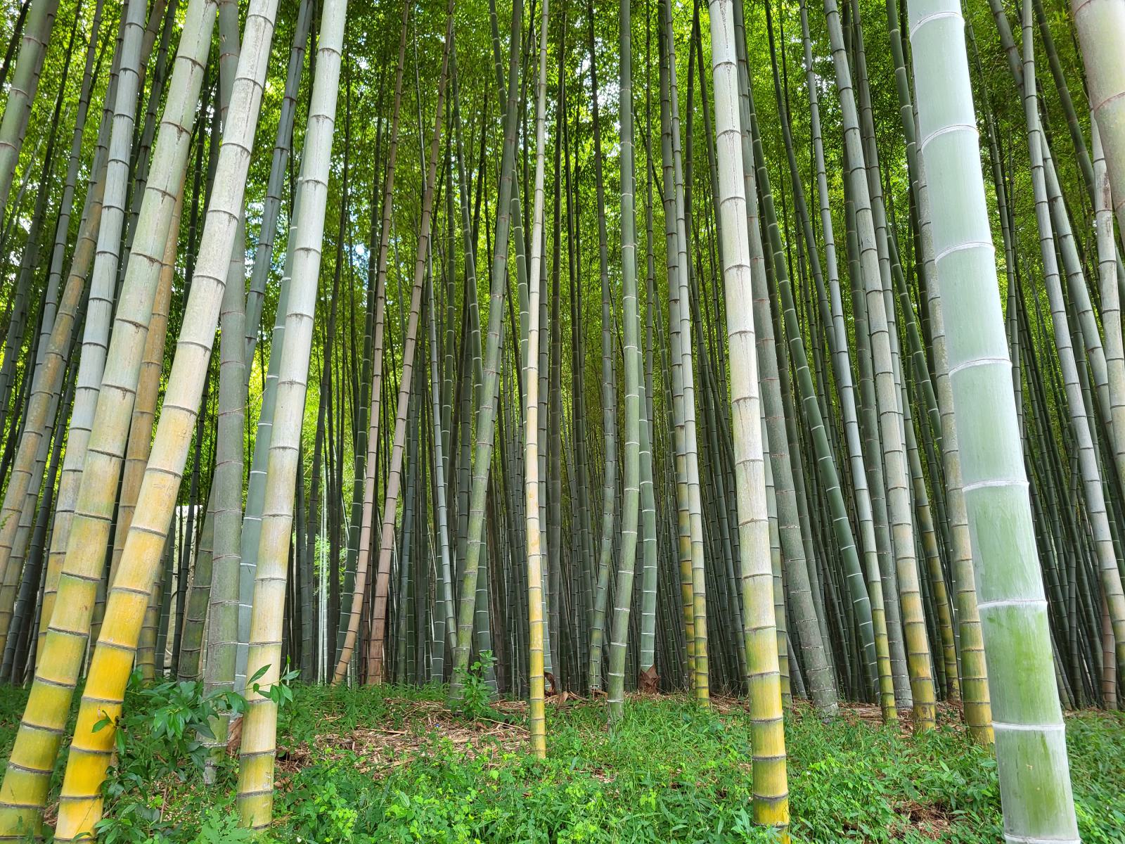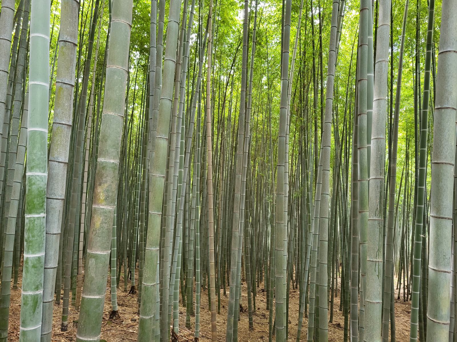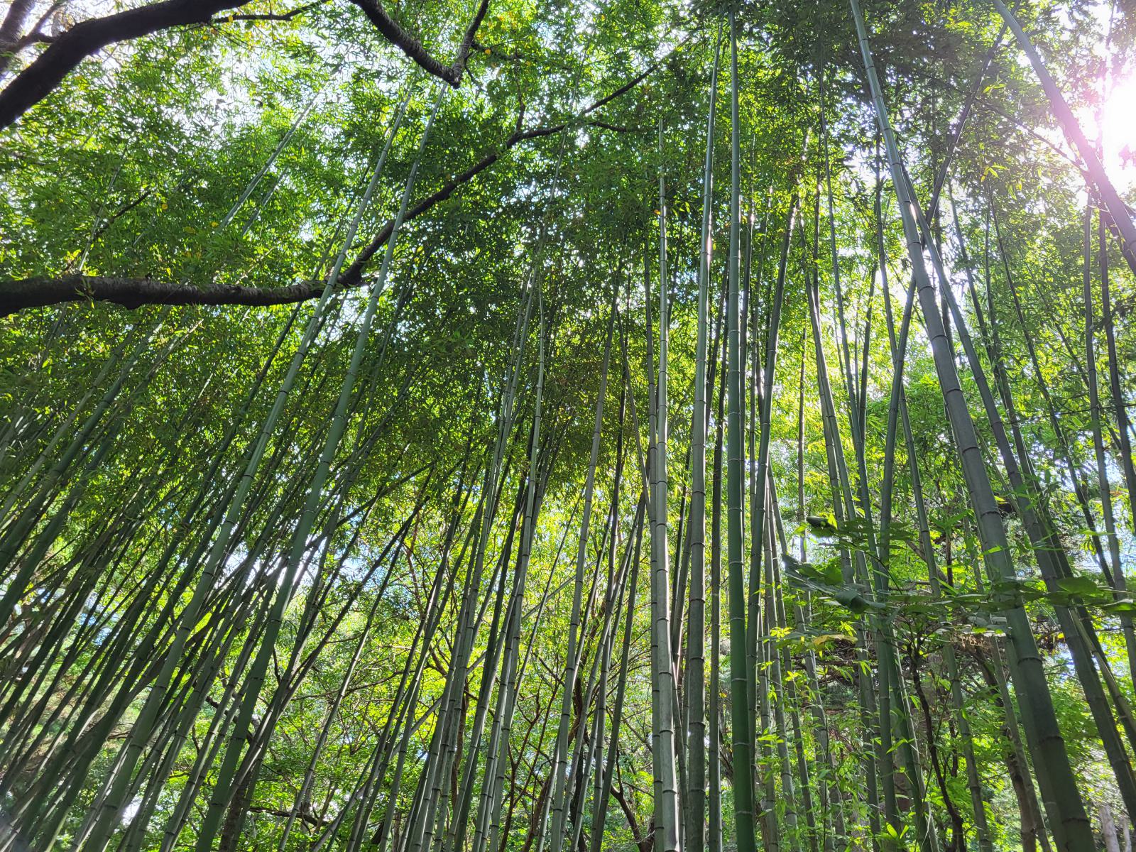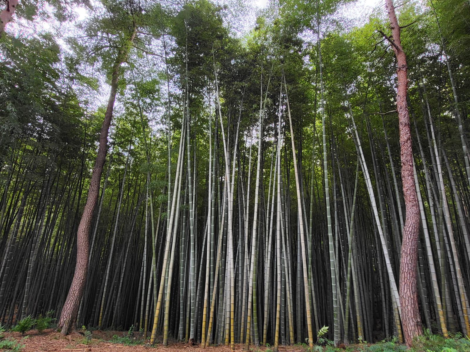Der Eingang liegt an einer idyllischen Quelle. Im Wald gibt es noch andere alte Bäume, so kamen wir erst ein Stück durch einen Pinienwald, bis der Bambus auf der anderen Seite des Weges begann. Endlos tief schien es zwischen den grün-grauen Halmen hinein zu gehen und der Spaziergang wurde von ständigem Geklapper begleitet. So dicht ist der Wald, dass die Halme bei jedem Windhauch zusammenstoßen.
