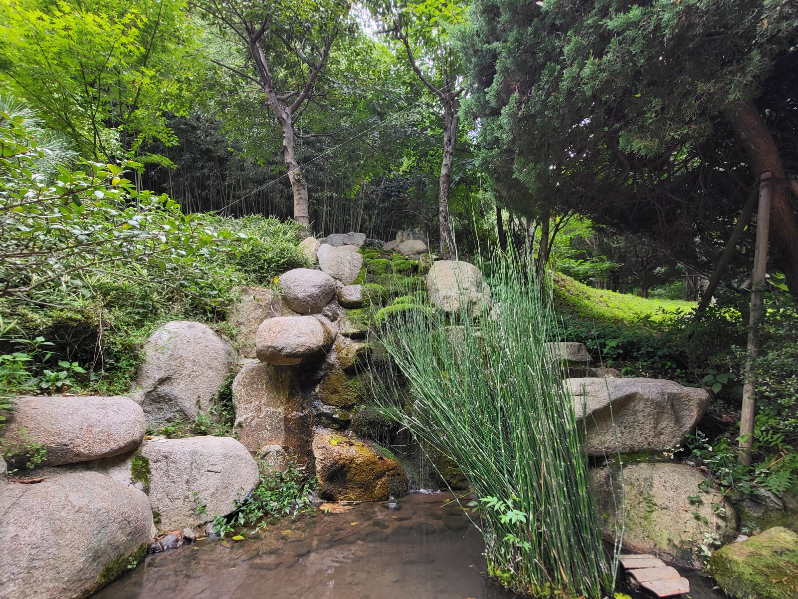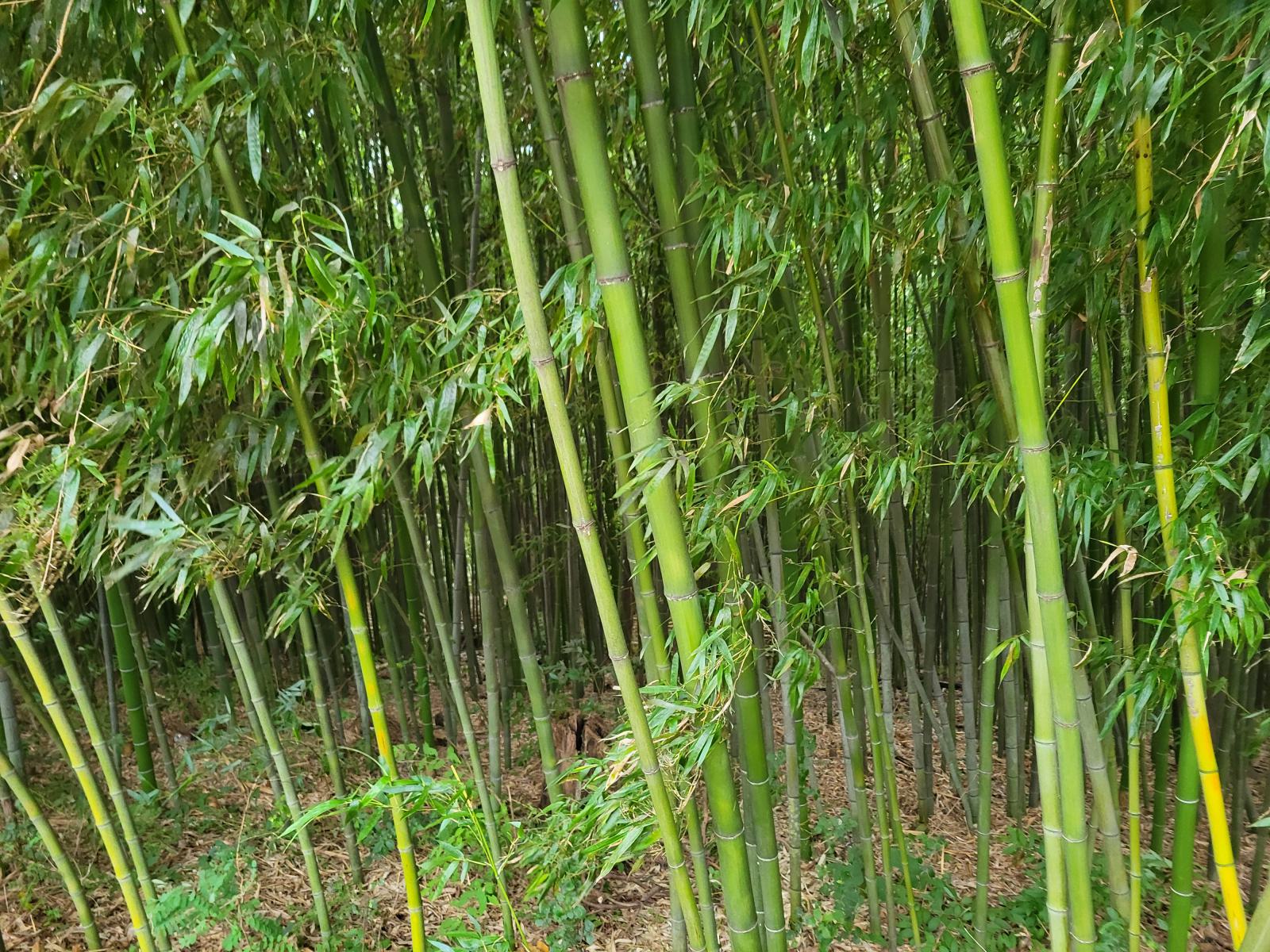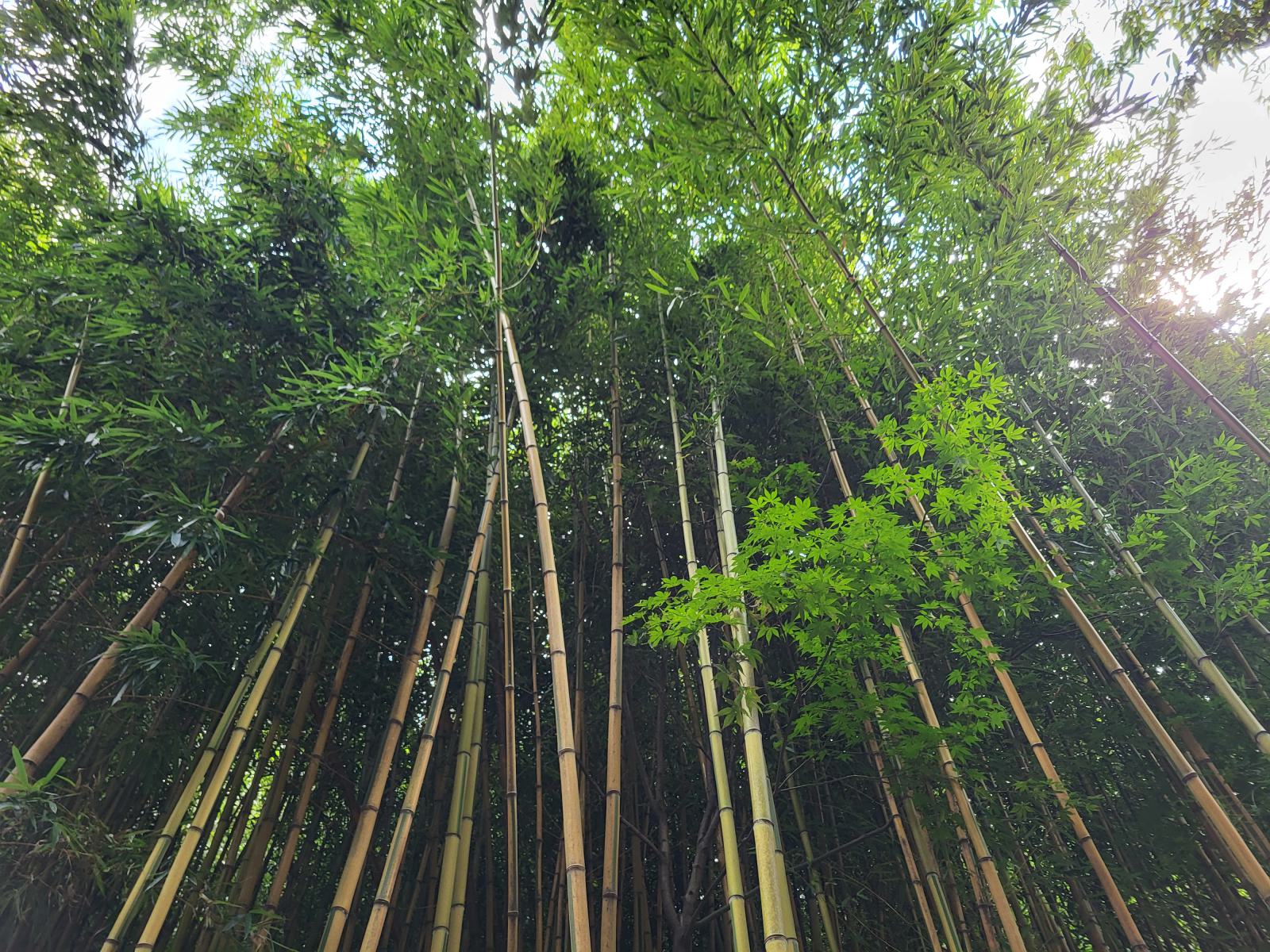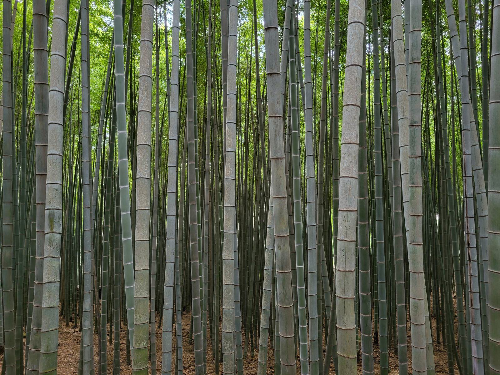 Der Eingang liegt an einer idyllischen Quelle. Im Wald gibt es noch andere alte Bäume, so kamen wir erst ein Stück durch einen Pinienwald, bis der Bambus auf der anderen Seite des Weges begann. Endlos tief schien es zwischen den grün-grauen Halmen hinein zu gehen und der Spaziergang wurde von ständigem Geklapper begleitet. So dicht ist der Wald, dass die Halme bei jedem Windhauch zusammenstoßen.