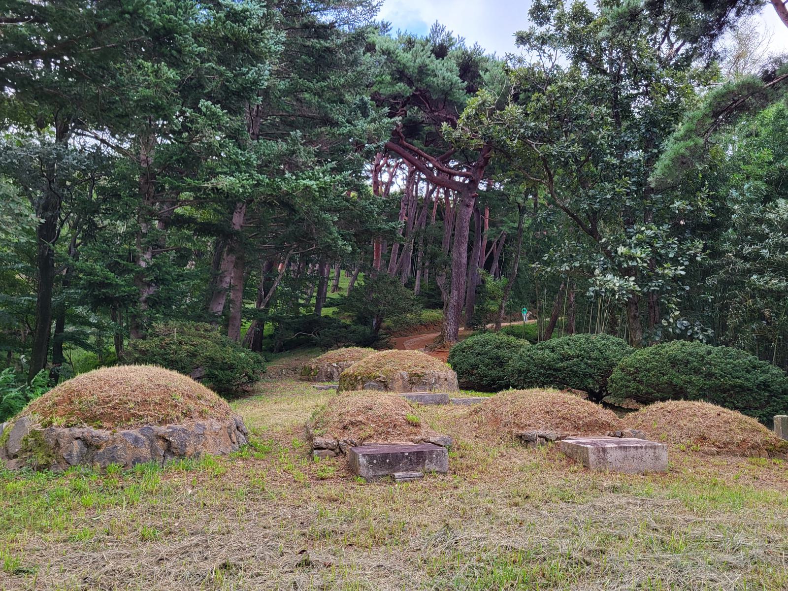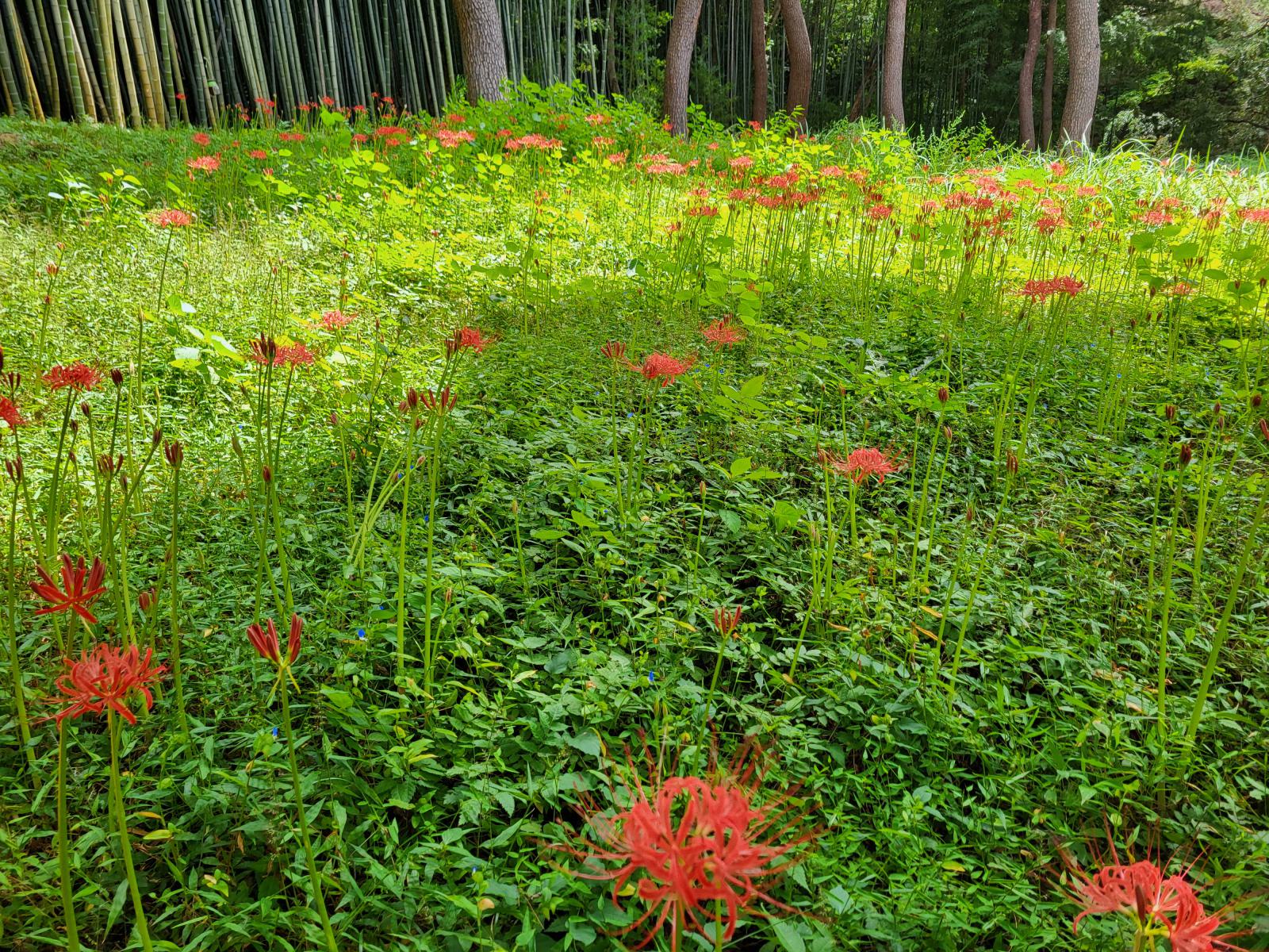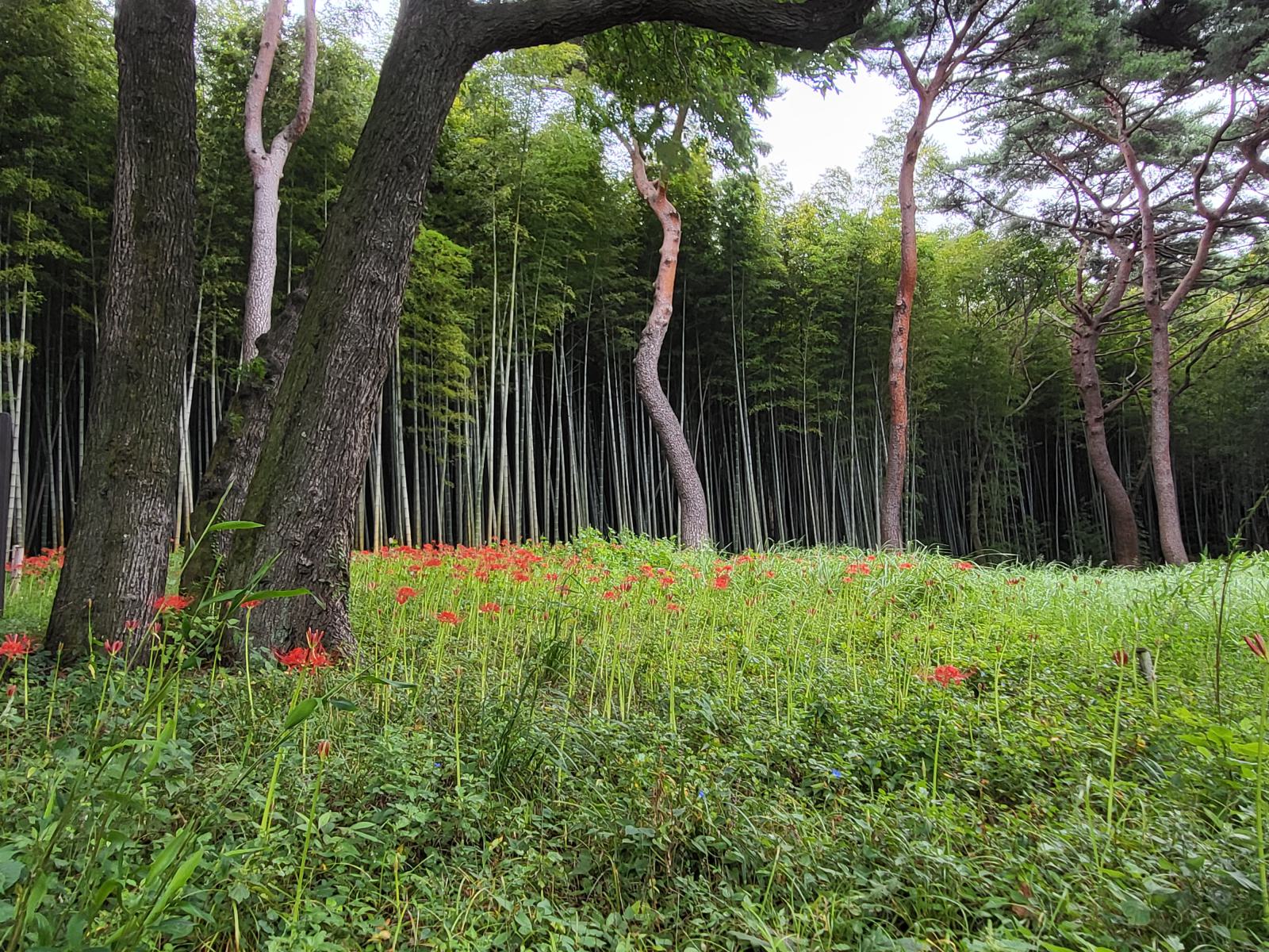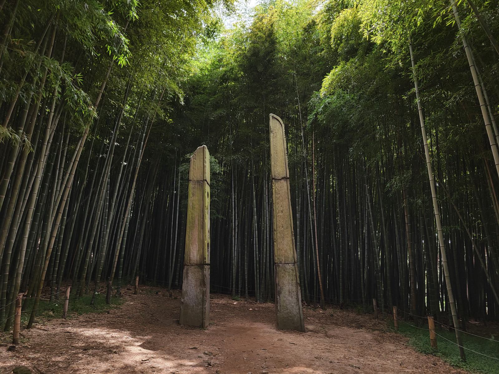 Weiter oben kamen wir an kleinen Hügelgräbern vorbei und durch ein Tannenwäldchen, dahinter wuchs eine andere Bambusart. Hier waren zwei Steinsäulen von einem Filmdreh übrig geblieben, ein beliebter Fotospot. Davor lag eine kleine Lichtung mit einem roten Blütenteppich.