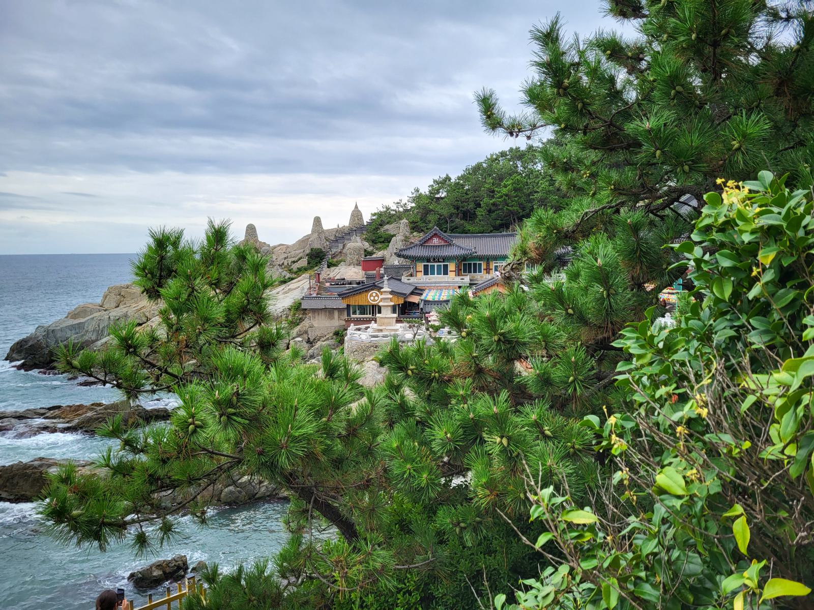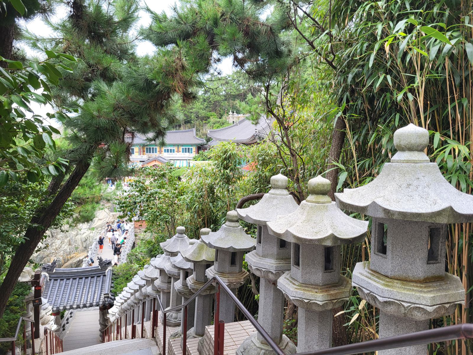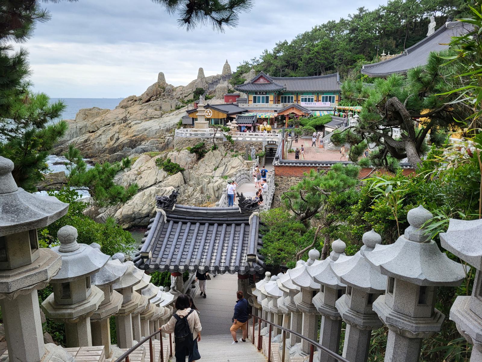 Über Treppen, von Bambus und Steinlaternen gesäumt und durch einen Felsentunnel ging es noch weiter nach unten bis zum Meer, wo wir vor dem Tempel erstmal zu besagtem Aussichtsfelsen abbogen und den herrlichen Anblick genossen. Gelb bemalt und mit einer steinernen Brücke verziert thront der Tempel in der felsigen Bucht, darüber ein großer Buddha. Im Hintergrund führt ein Pfad vorbei an einfachen Ziegelpagoden zum Kloster in ein Pinienwäldchen.