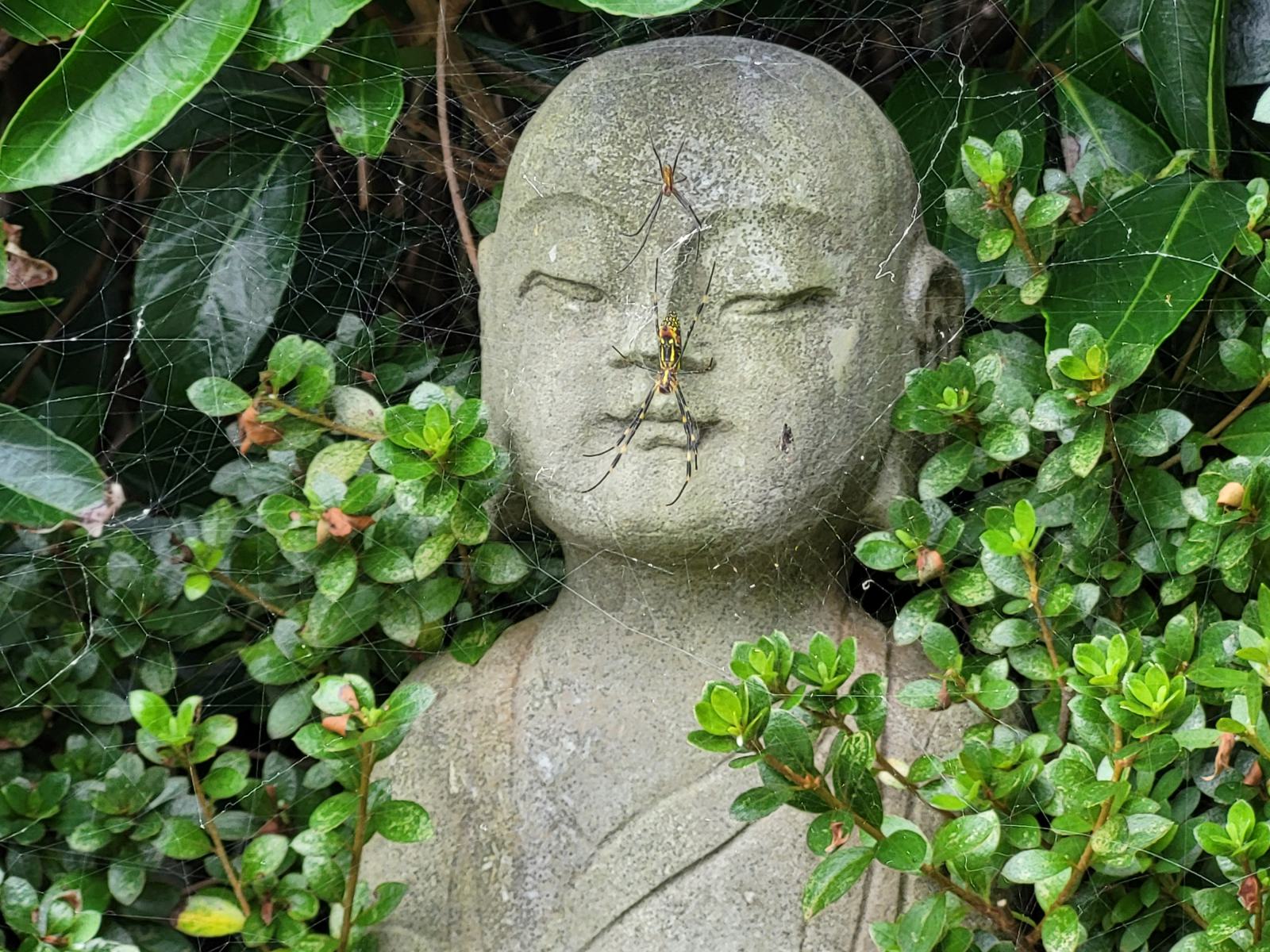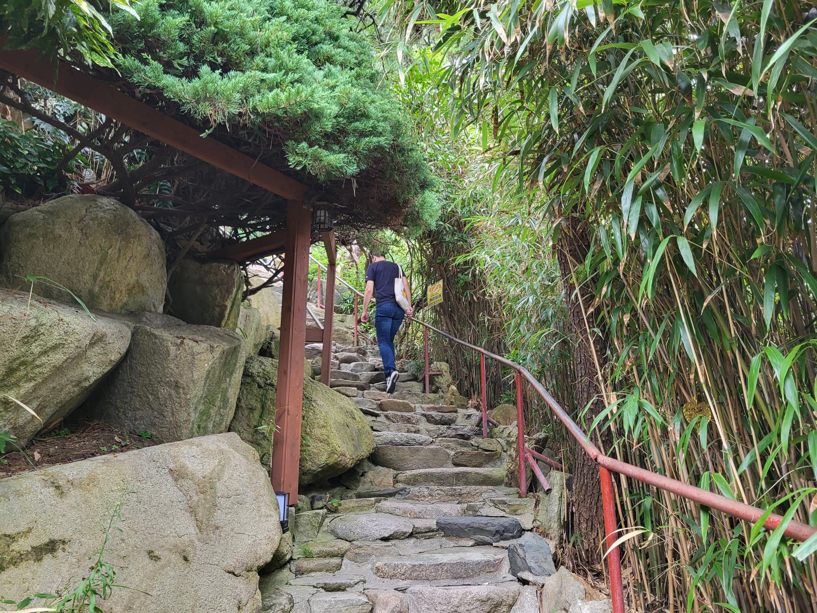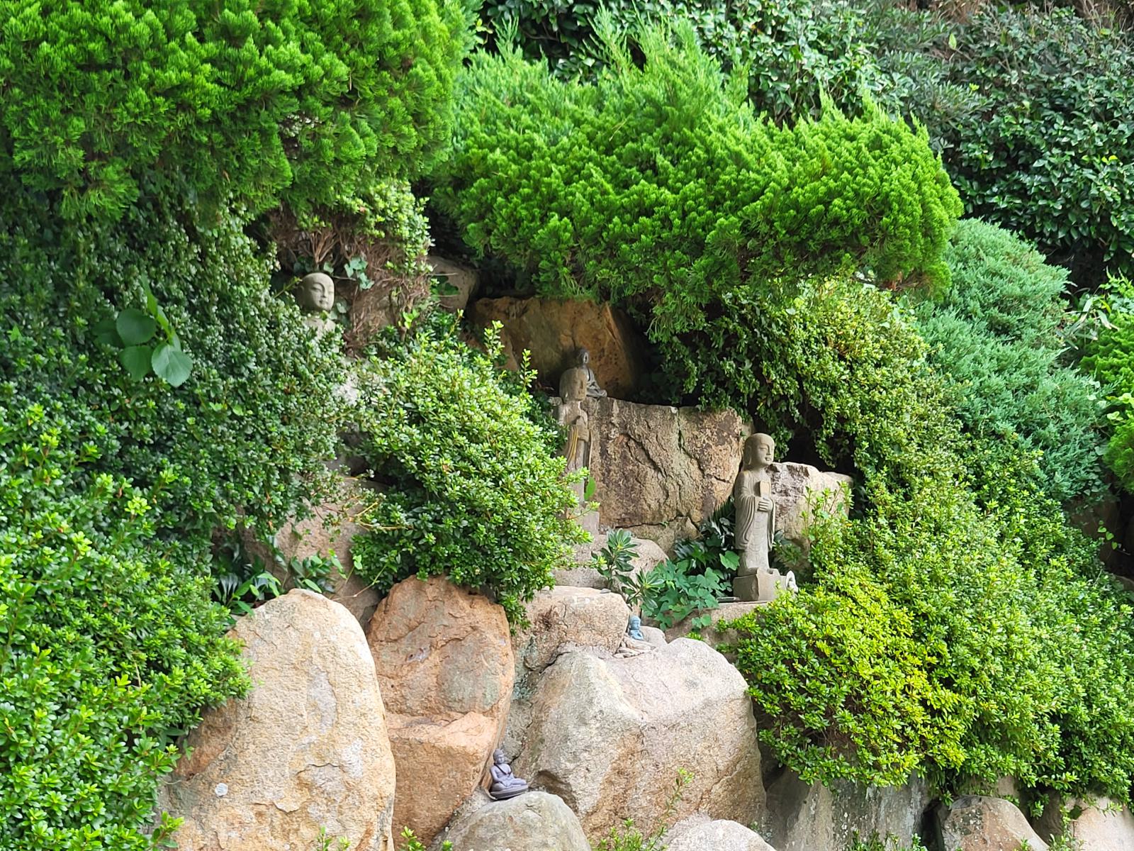 Über Treppen, von Bambus und Steinlaternen gesäumt und durch einen Felsentunnel ging es noch weiter nach unten bis zum Meer, wo wir vor dem Tempel erstmal zu besagtem Aussichtsfelsen abbogen und den herrlichen Anblick genossen. Gelb bemalt und mit einer steinernen Brücke verziert thront der Tempel in der felsigen Bucht, darüber ein großer Buddha. Im Hintergrund führt ein Pfad vorbei an einfachen Ziegelpagoden zum Kloster in ein Pinienwäldchen.