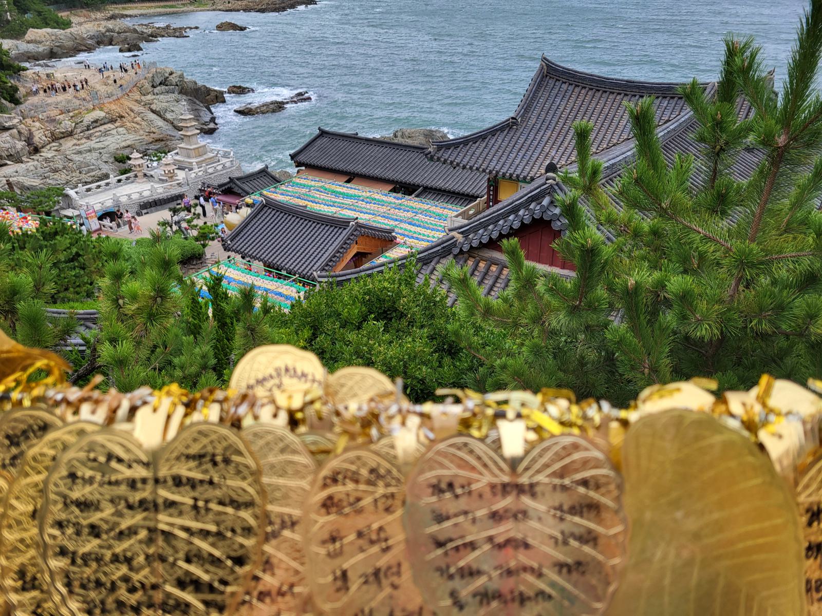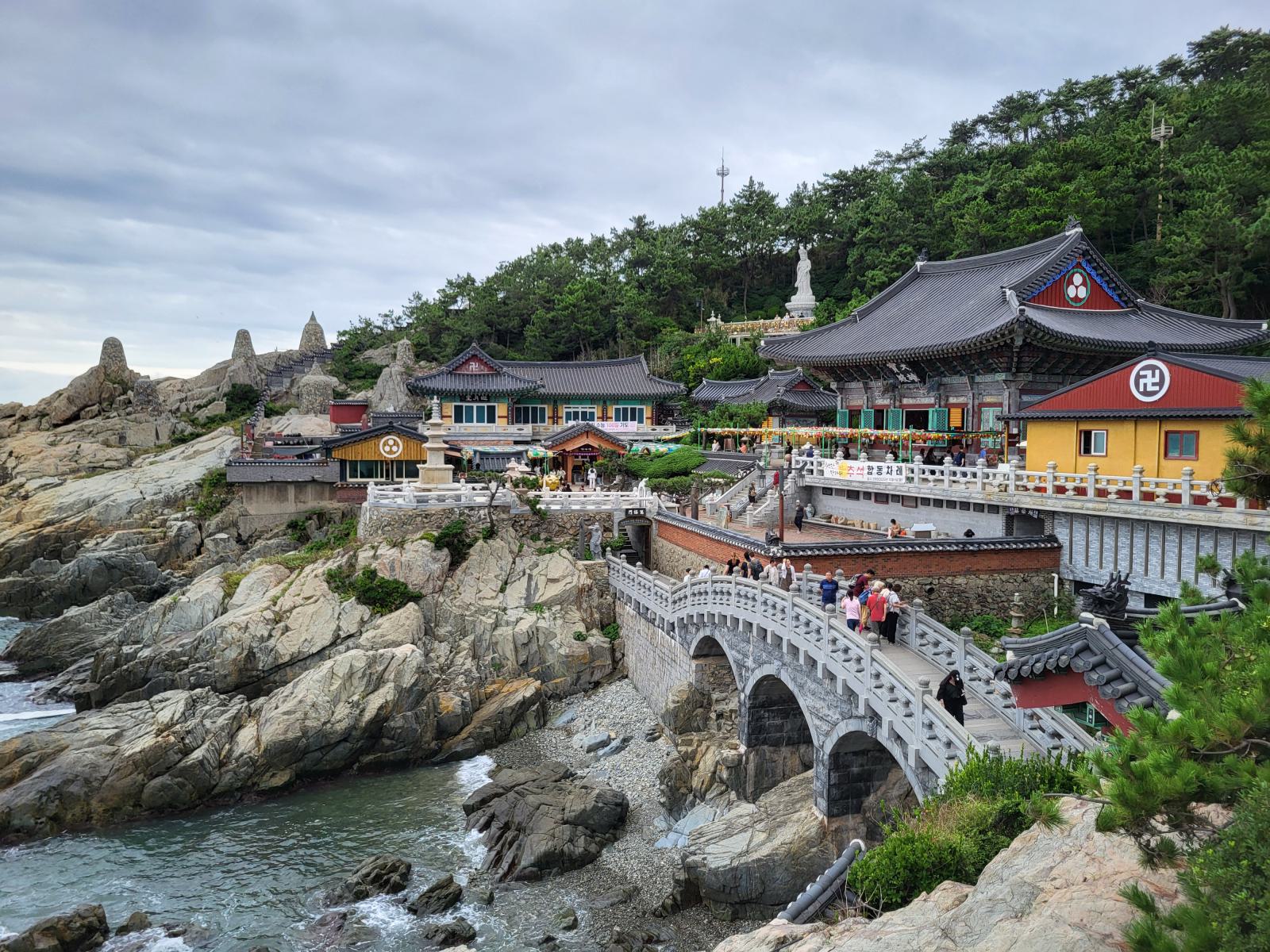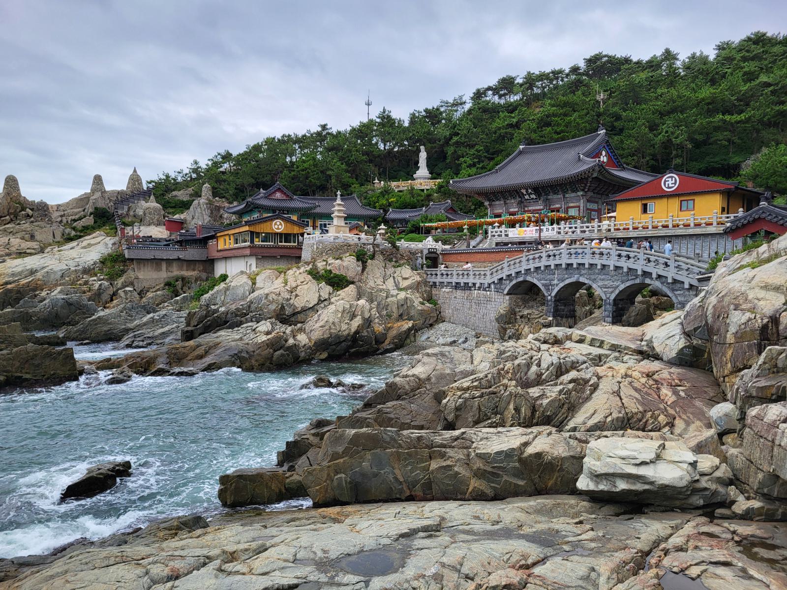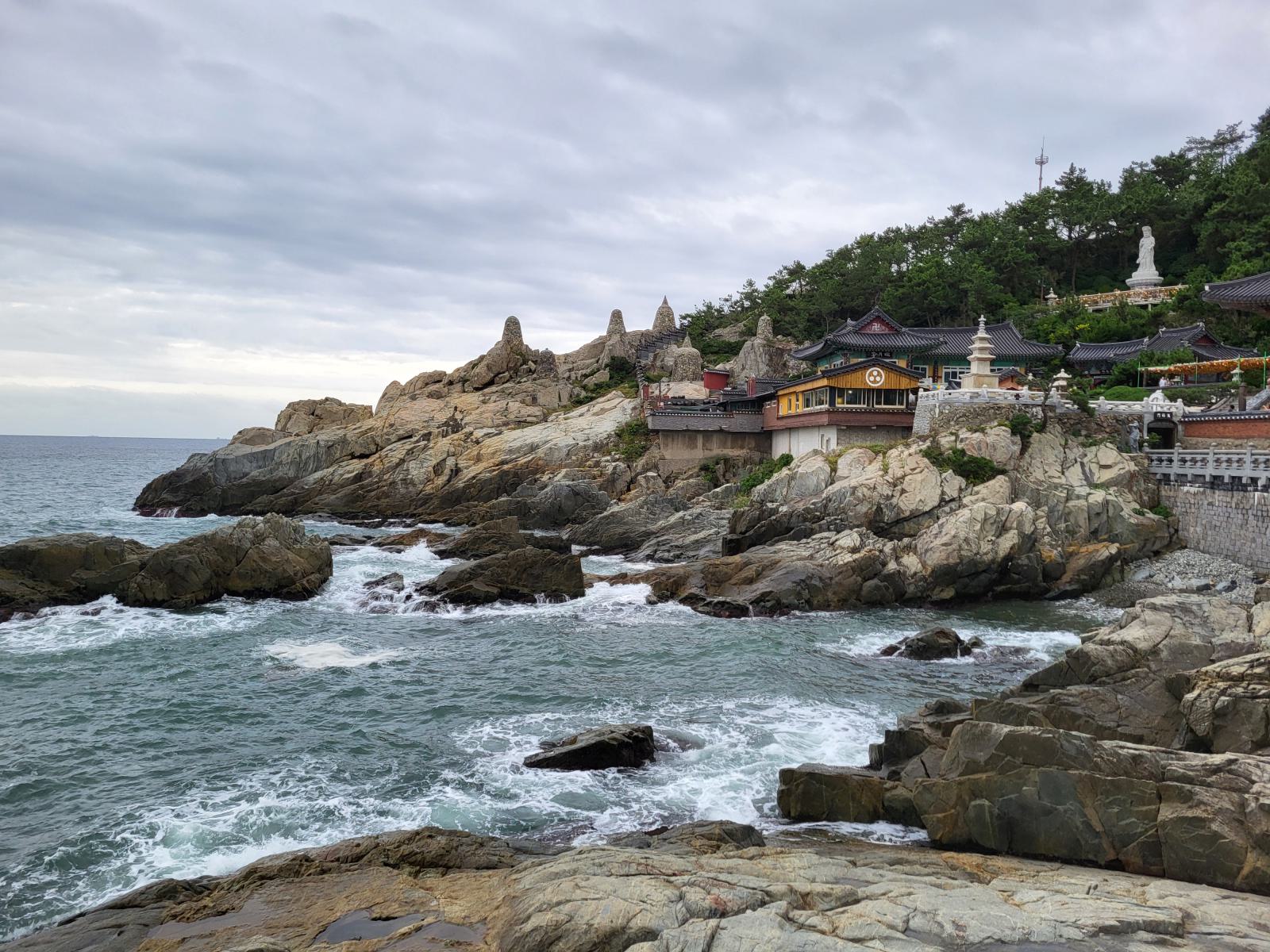 Busans Hauptsehenswürdigkeit ist vermutlich der Haedong Yonggungsa Tempel in Haehundae, am anderen Ende der Stadt. Mit dem Taxi waren wir eine Stunde unterwegs, die Wege in dieser Stadt sind weit. Der Tempel schmückt sich mit dem Titel, der schönste des Landes zu sein, die Touristenmassen kassieren allerdings die komplette Atmosphäre. Schön ist er trotzdem, besonders von den benachbarten Felsen aus betrachtet, wie er sich in die schroffe Landschaft klammert und den Wellen trotzt.