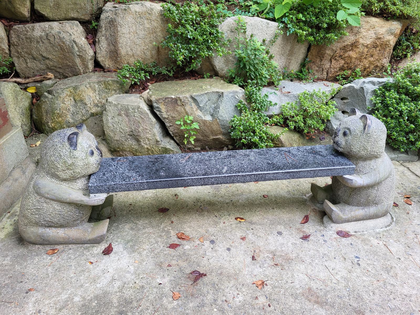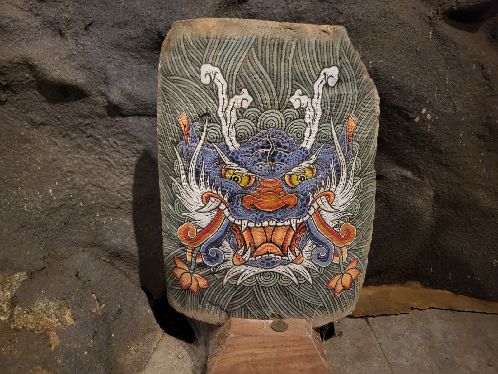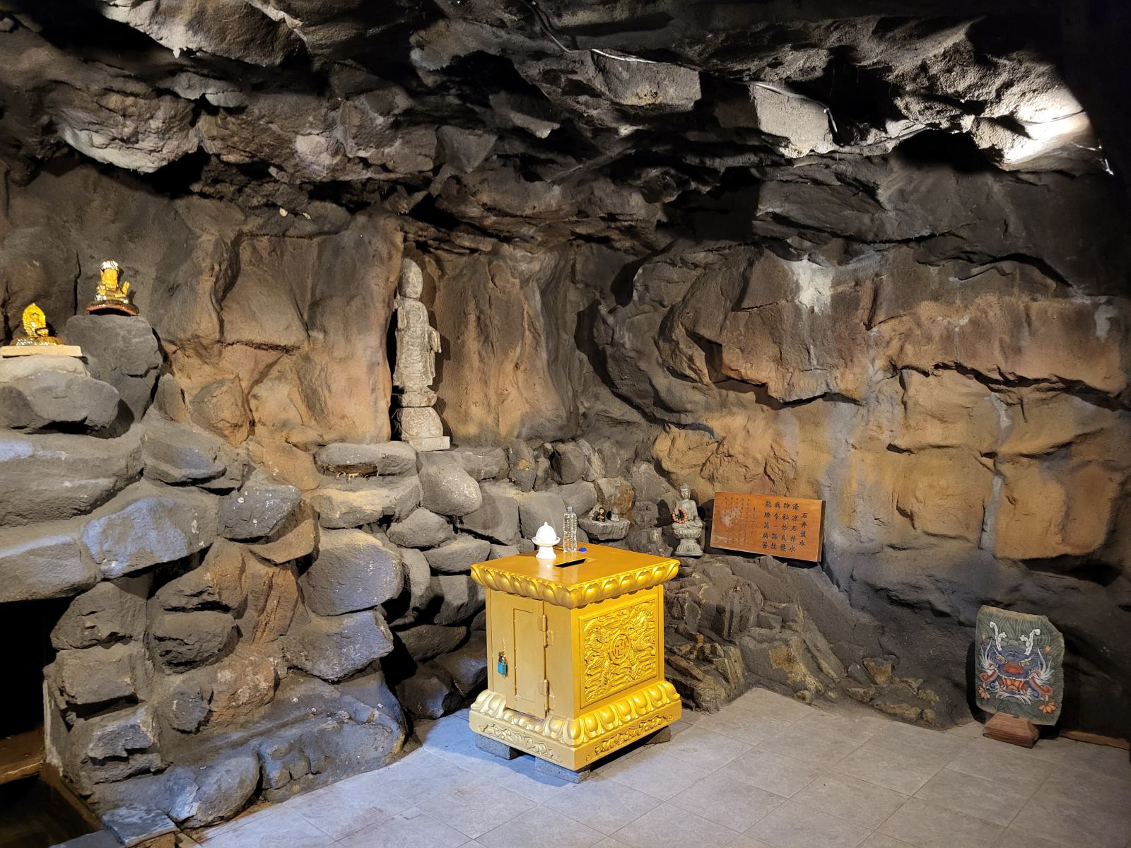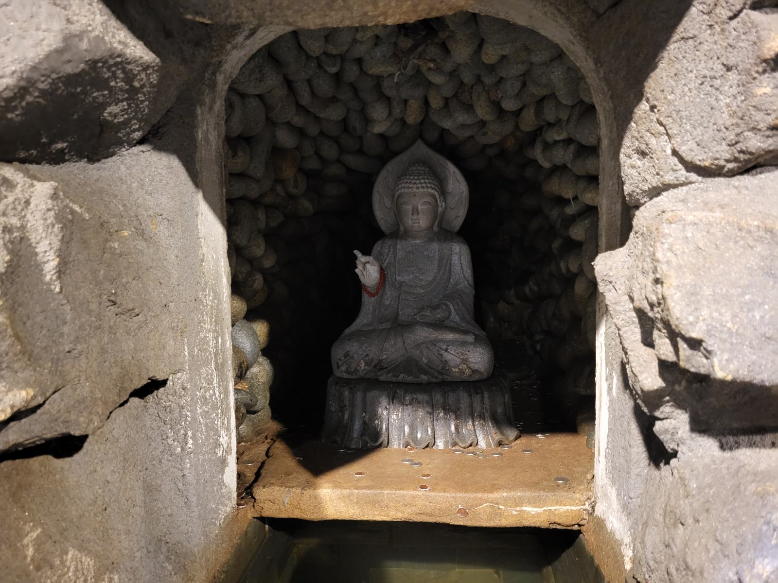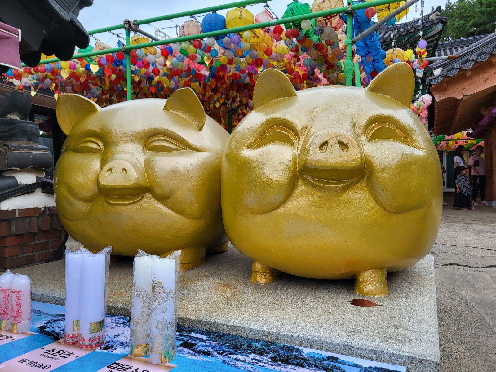 Den Hof dekorieren zwei fette Glücksschweine und eine Treppe führt nach unten in eine geheimnisvolle Grotte mit heiliger Quelle. Dahinter entdeckten wir ein Café.