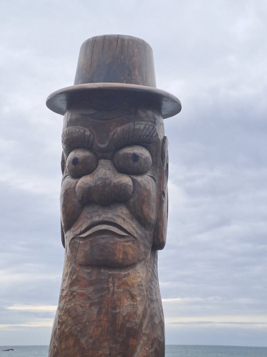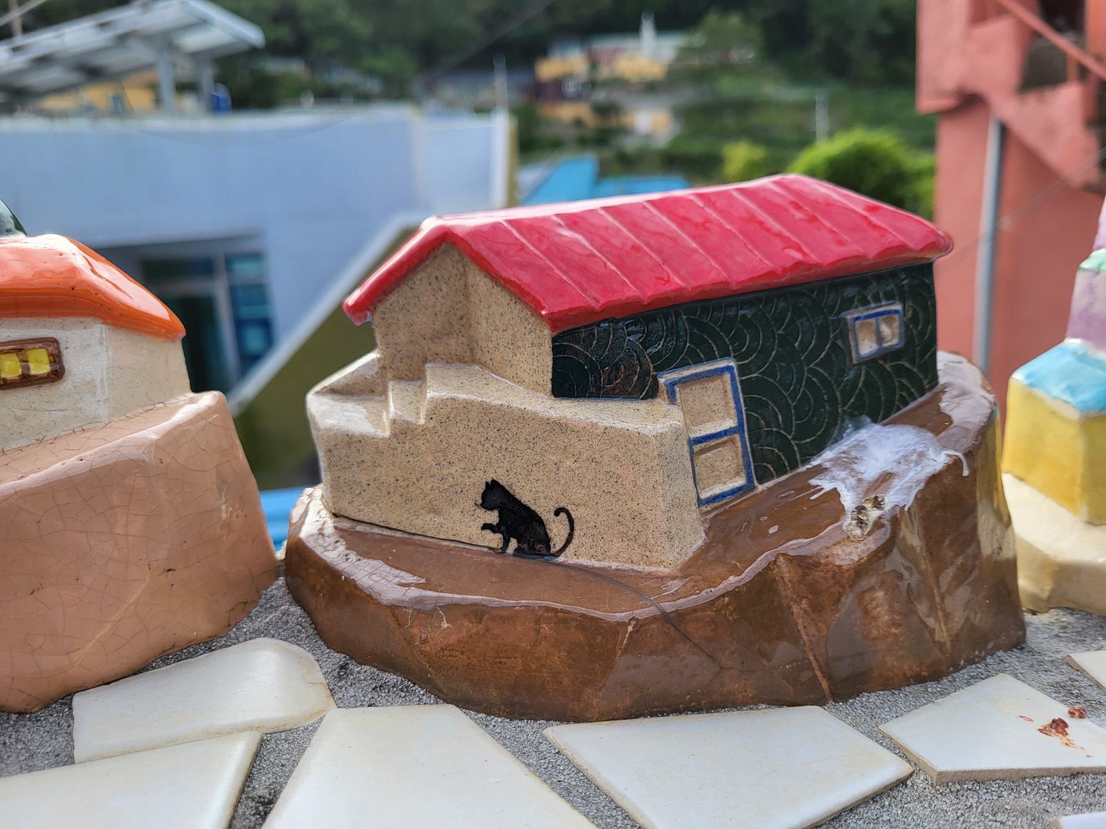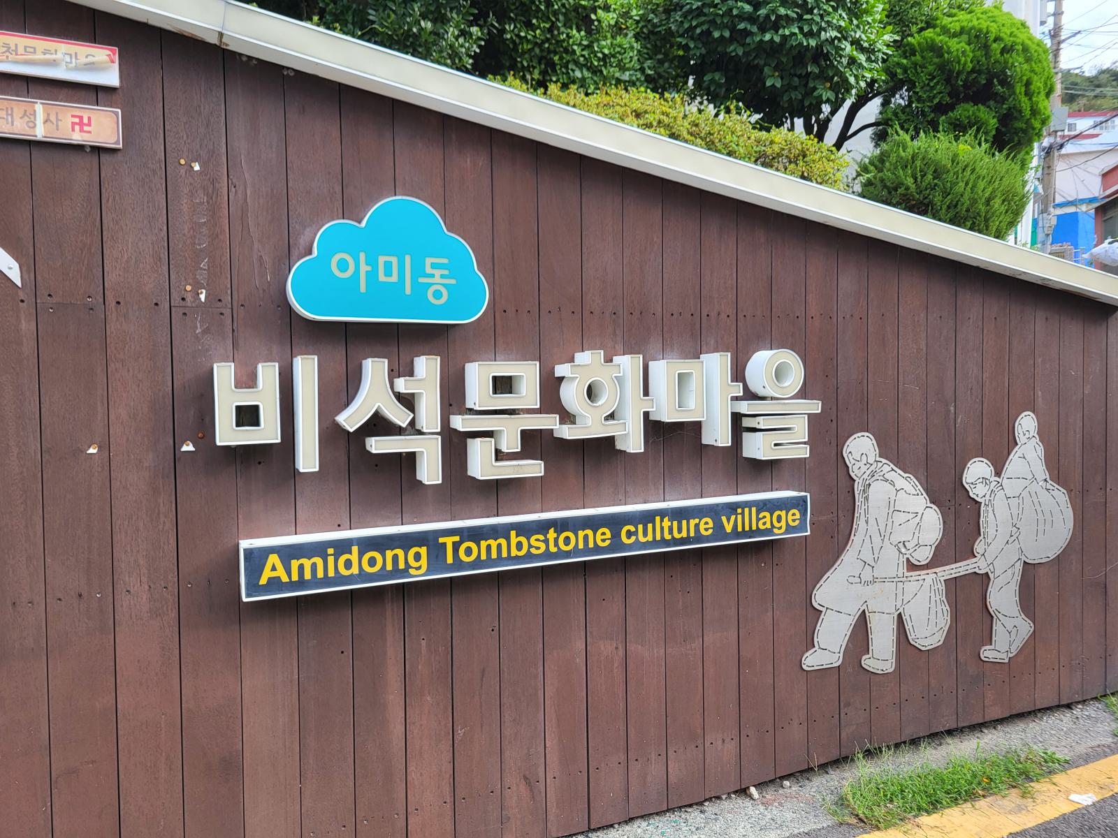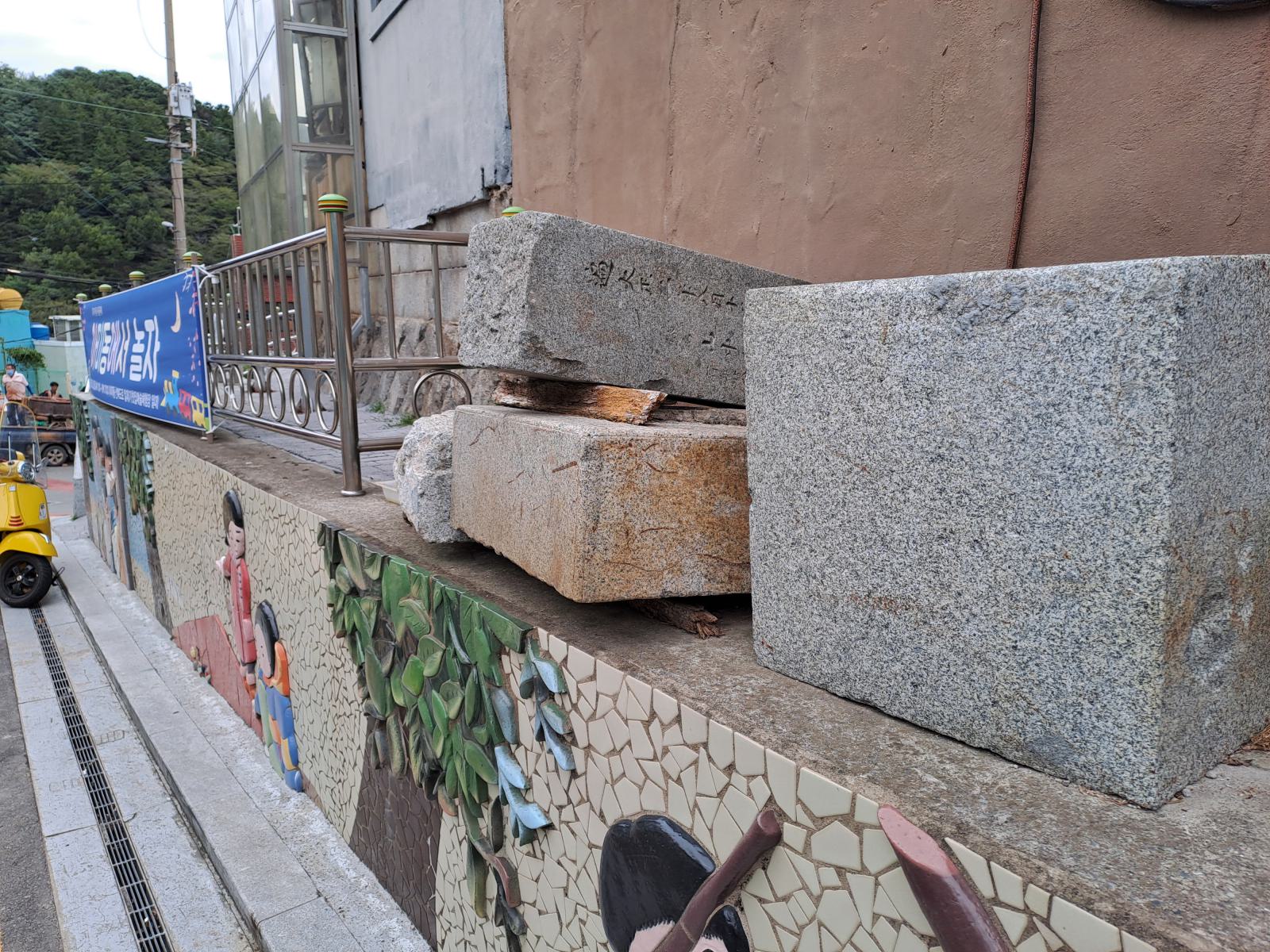In den Bergen um die Innenstadt gibt es mehrere solcher alten Stadtviertel. Über einen Hügel ging es direkt zum nächsten. Das war eigentlich viel interessanter, genauso schön, aber völlig frei von Touristen, Tombstone Village. Die Einwohner fanden hier damals einen Friedhof der japanischen Besatzer vor und damit praktisches Baumaterial. Die Grabsteine hatten für sie keine Bedeutung und wurden kurzer Hand zu Treppen und Mauerteilen. Noch heute kann man sie zwischen und an den Häusern erkennen. Teilweise sind sogar noch Inschriften und Verzierungen zu sehen. Auch hier trafen wir hauptsächlich auf ältere Leute. An der breiteren Hauptstraße erzählte eine Fotoausstellung von der Geschichte des Dörfchens und am Oberen Rand gibt es eine fast unverbaute Aussichtsterrasse. Auf der Suche nach den interessantesten Steinen verliefen wir uns bald getrennt im Gassen- und Treppenlabyrinth, trafen uns aber unten wieder.