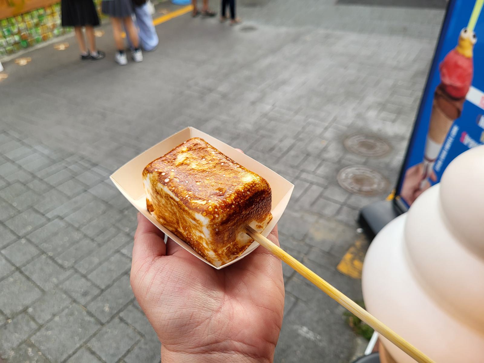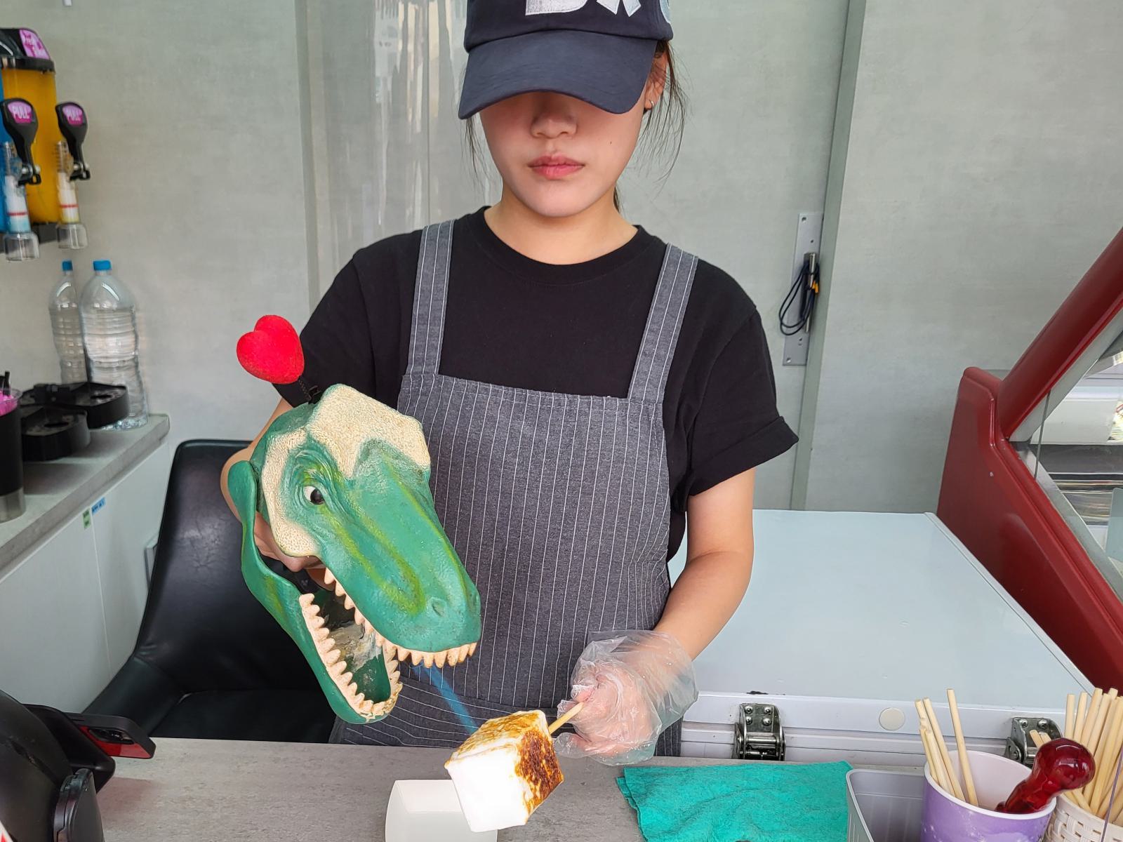 Um wieder aus dem Labyrinth hinaus zu finden, hielten wir uns an die Treppen nach oben. Zeit für einen Snack. An der Tourimeile gab es das beliebte Eis im gerösteten Marshmallow, hier mit Dinosaurierbrenner. Es schmeckte wie Schokoeis mit Zuckerwatte und war überraschend lecker.