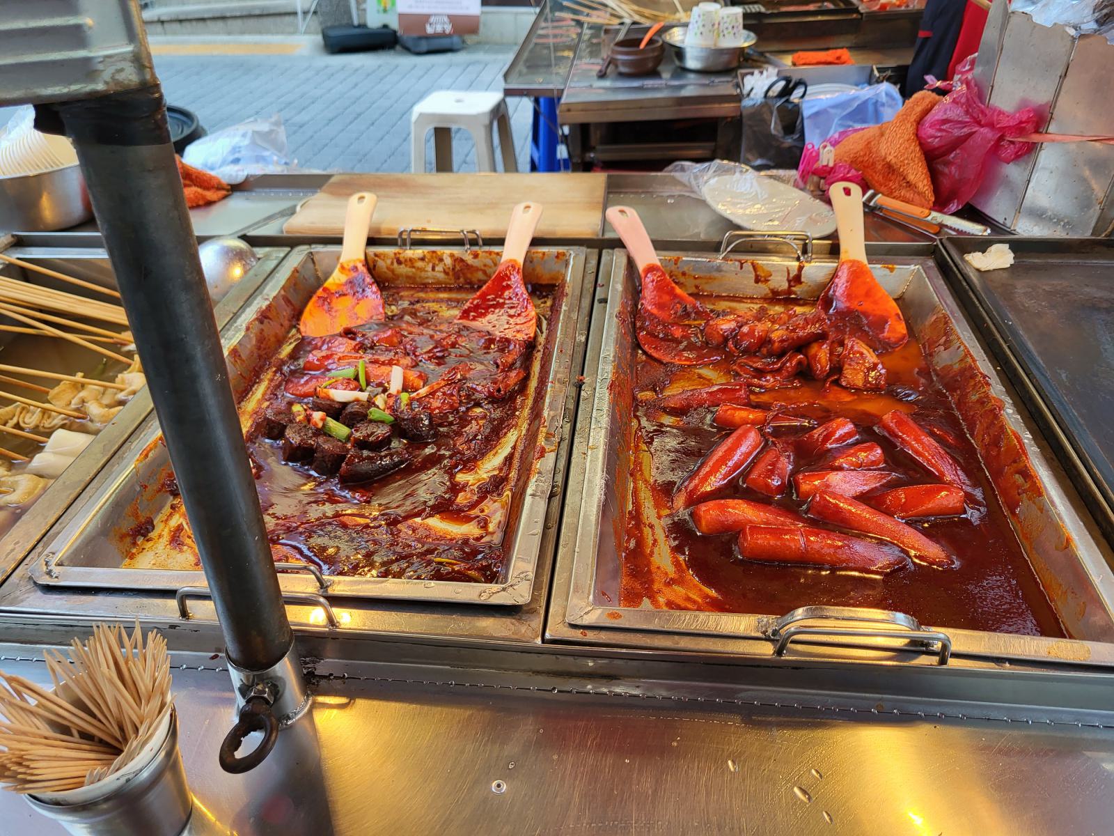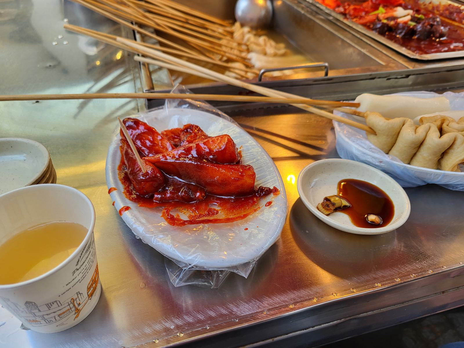 Obwohl wir einen U-Bahn-Eingang direkt vor der Tür hatten, wohnten wir genau zwischen zwei Stationen, die über einen unterirdischen Markt verbunden waren. Vermutlich verläuft der Markt sogar über alle Stationen. Hier gab es neben Ramsch und Snacks auch Kleidung und Campingbedarf. Rein in die Station war leicht, rausfinden eine ganz andere Sache. Jede U-Bahn Station hat eigene Nummern für die Ausgänge, der Markt allerdings auch. Heute landeten wir an der Straße mit den Essensständen vom ersten Abend und wollten noch ein paar Teigtaschen mitnehmen. So nicht, wir sollten uns setzen und alles probieren, bezahlt wurde pauschal. Für 4000 Won, ca 2,50€, wurden wir mit Fishcake, Reiskuchen und Suppe vollgestopft. Eigentlich wollten wir abends noch Fisch essen, aber daraus wurde jetzt erstmal nichts.
