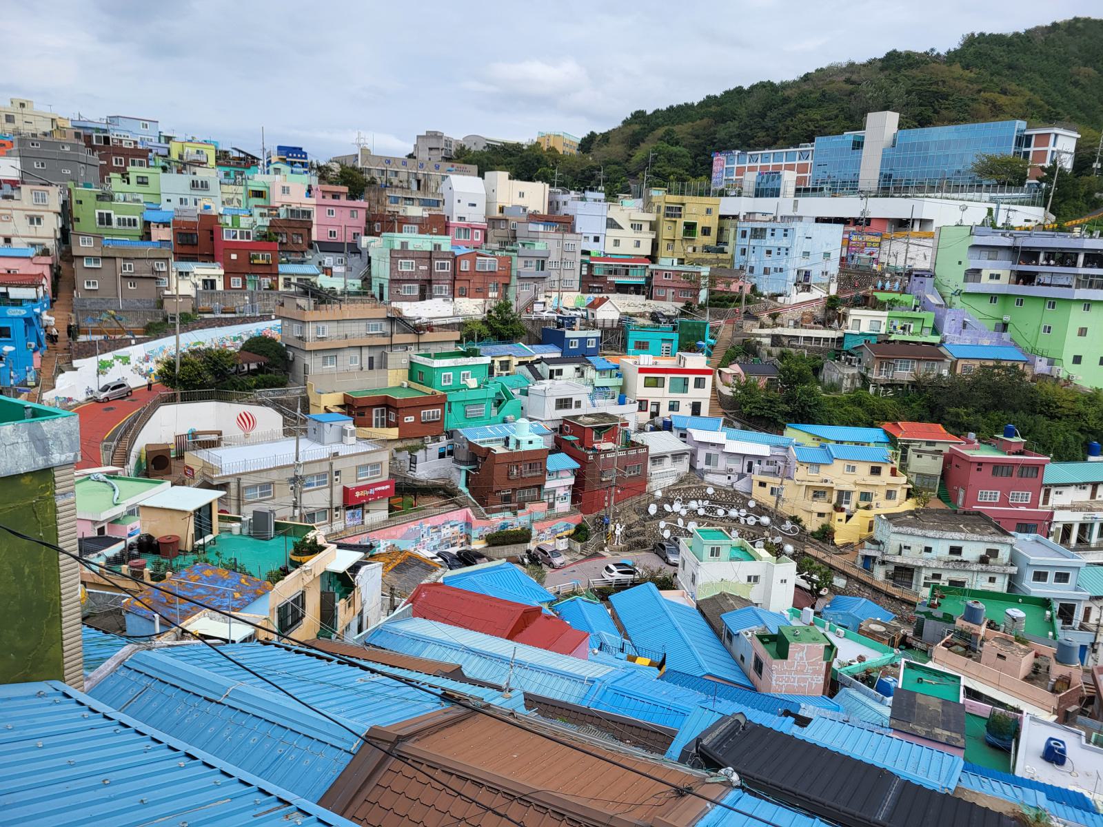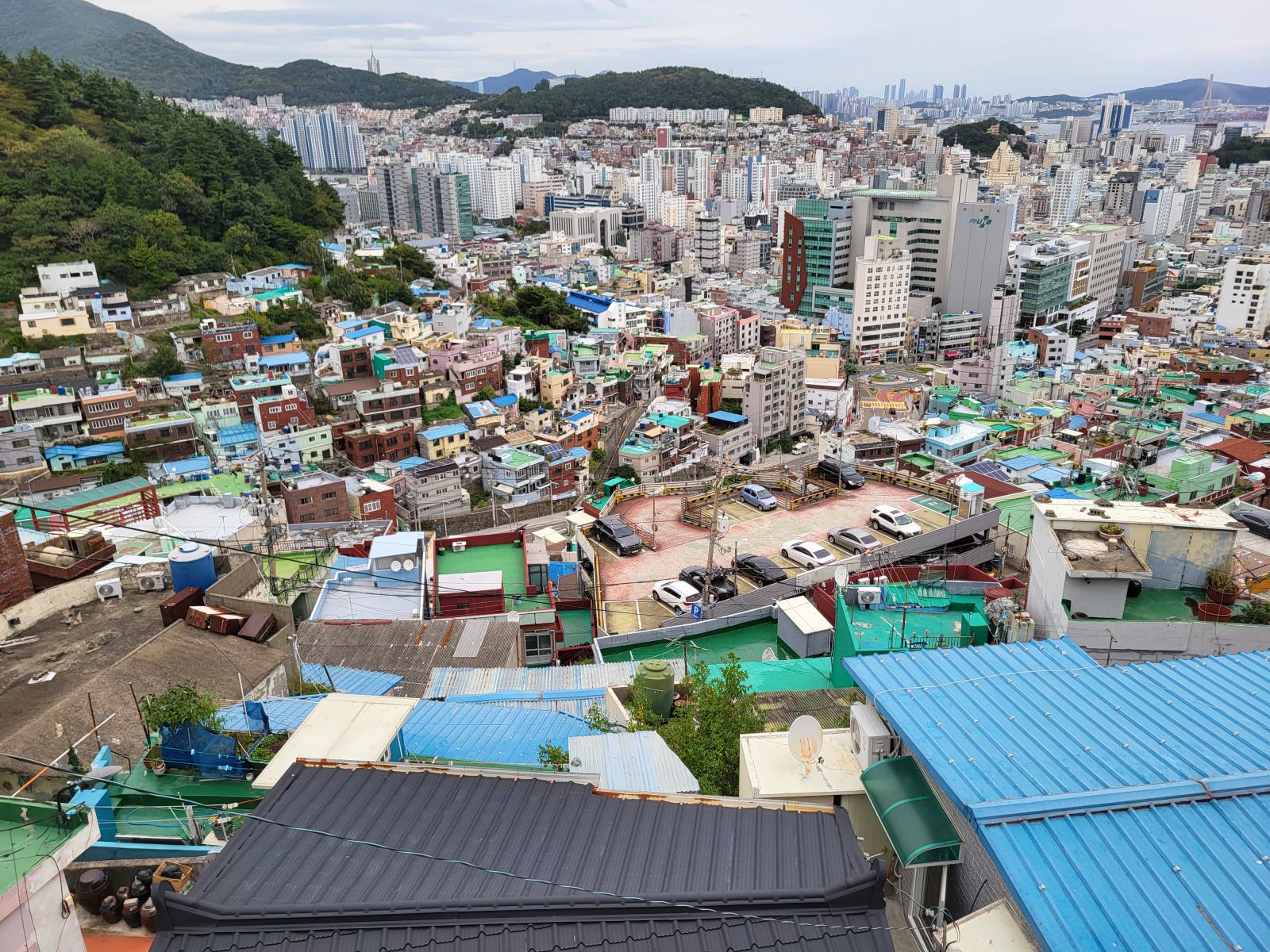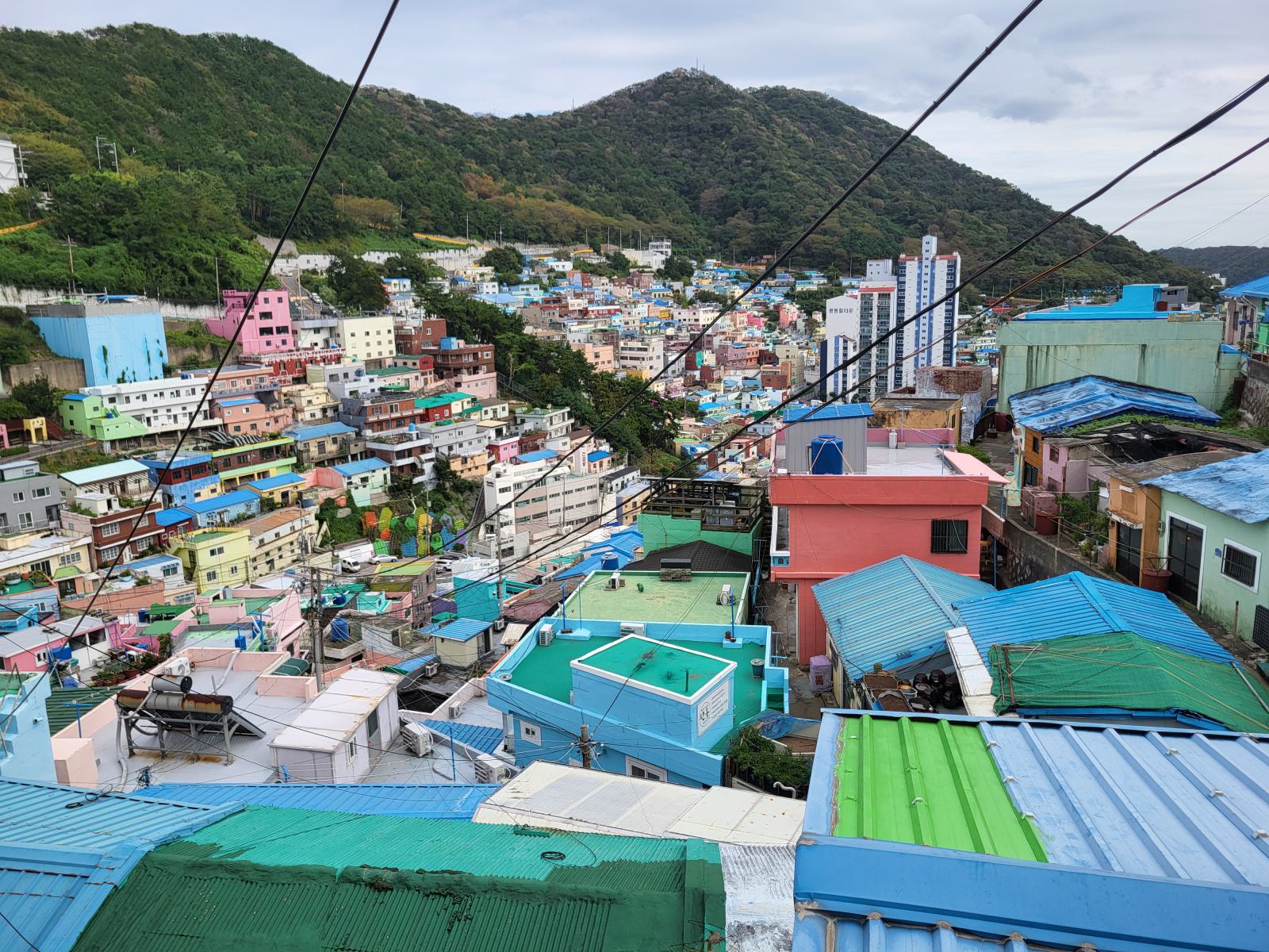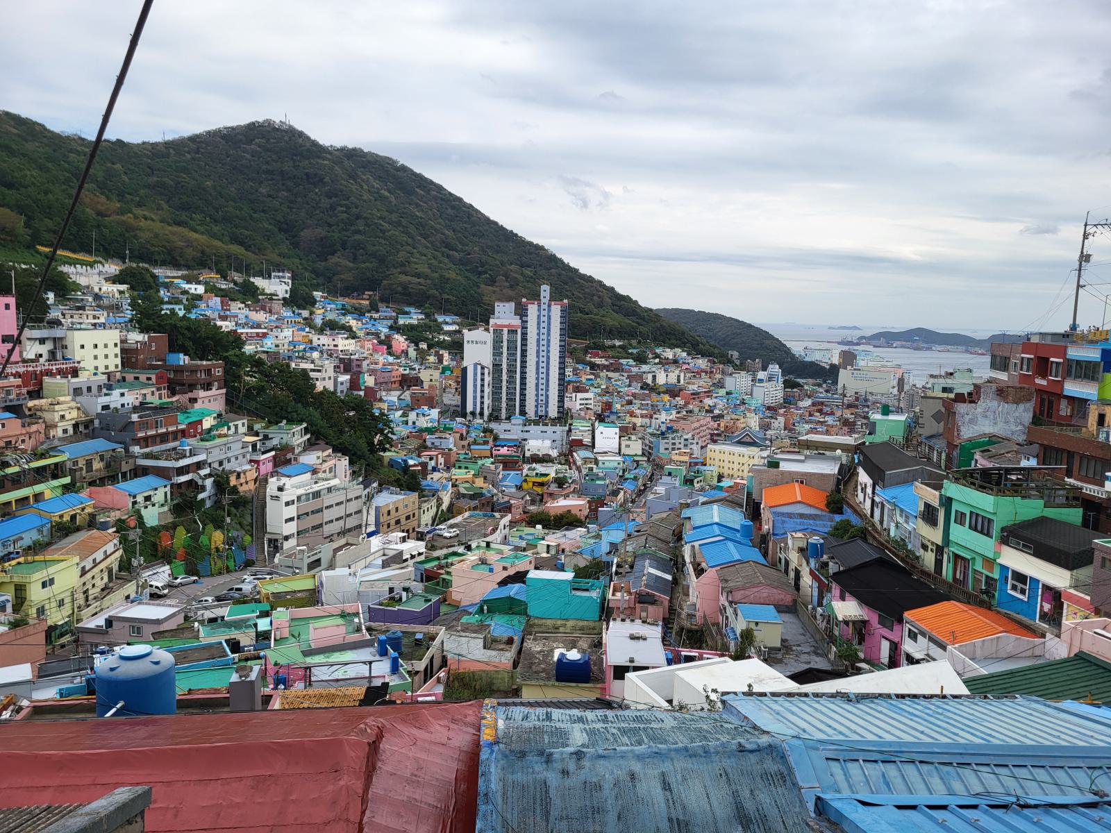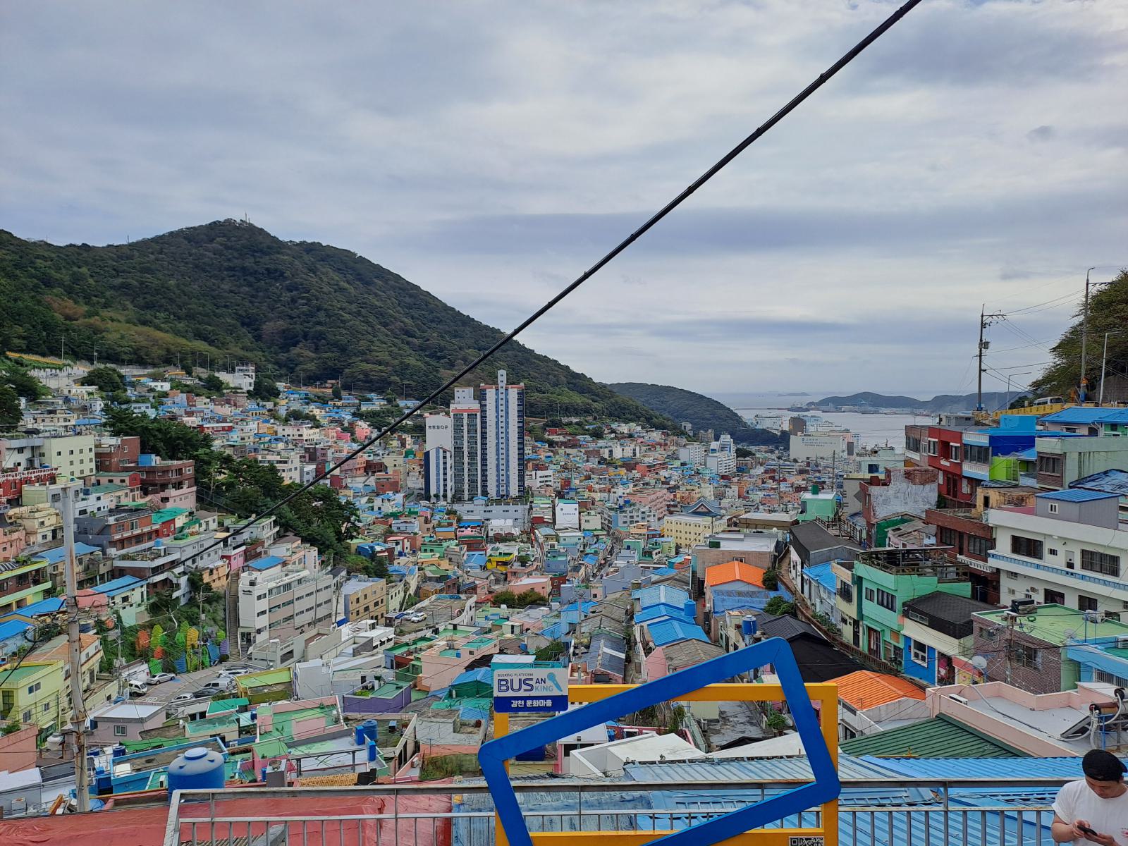 Zeit für einen kalten Kaffee, wir bestellten uns Gebäck mit roter Bohne dazu und setzten uns ins Fenster mit Blick auf Meer und Tempel und überlegten, was wir mit dem Rest des Tages anfangen wollten. Ganz in der Nähe liegt der Blueline Park, aber es gab gar keine Tickets mehr. Wir kauften schnell welche für morgen und fuhren zurück nach Süden, wir hatten ja noch Pläne von gestern, Gamcheon Village. Rückblickend muss man sagen, das ging so weiter in Busan, immer mit etwas Verzug. Die Wege in der Stadt sind einfach weit und die Möglichkeiten für einen guten Tag scheinbar unendlich. So langsam bekammen wir eine Idee davon, warum Busan so polarisiert. Hat man Zeit, ist es wunderschön, hat man keine, kann man eigentlich auch gleich wieder abreisen.