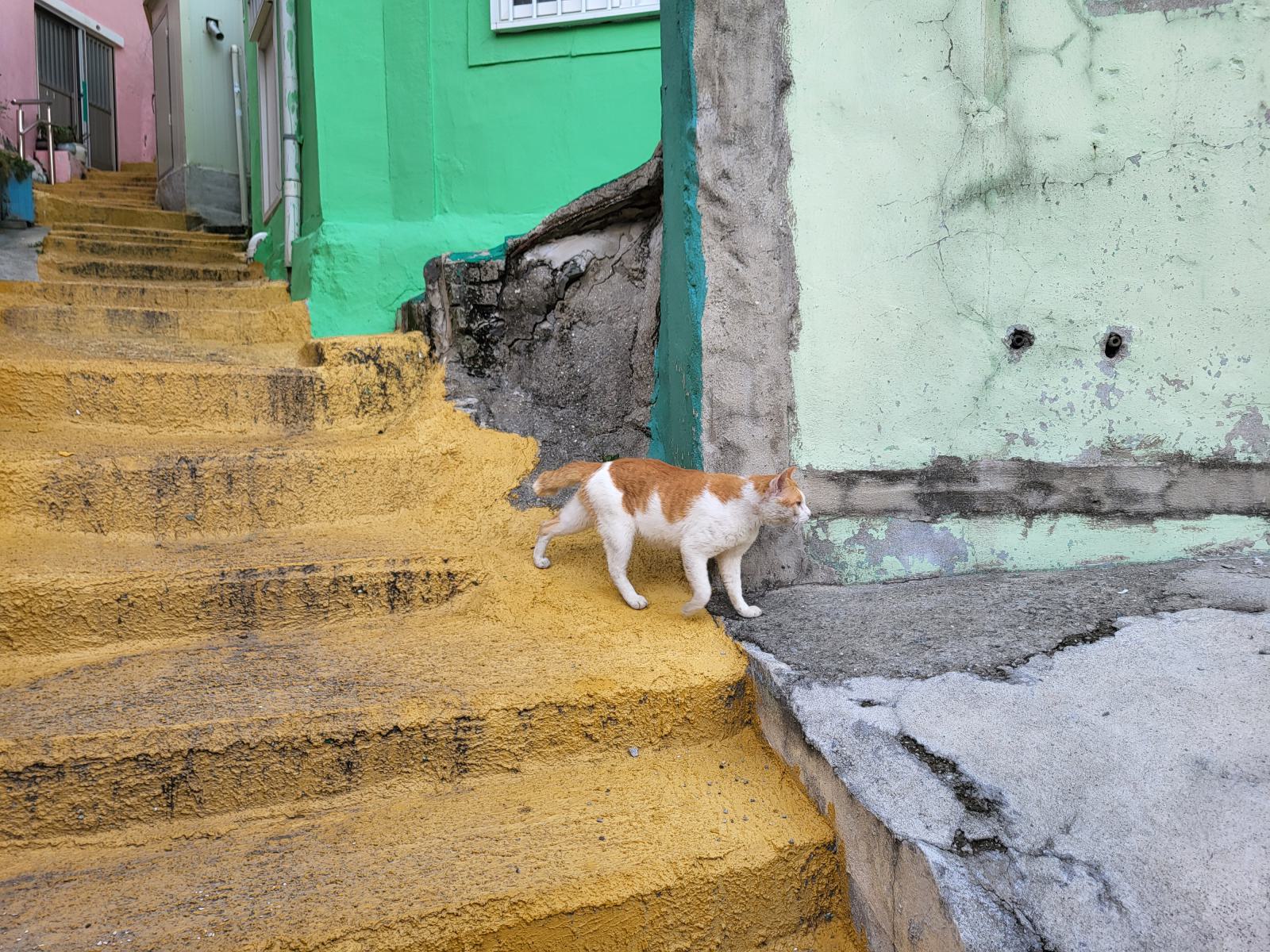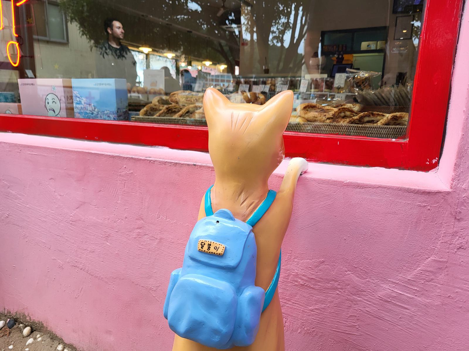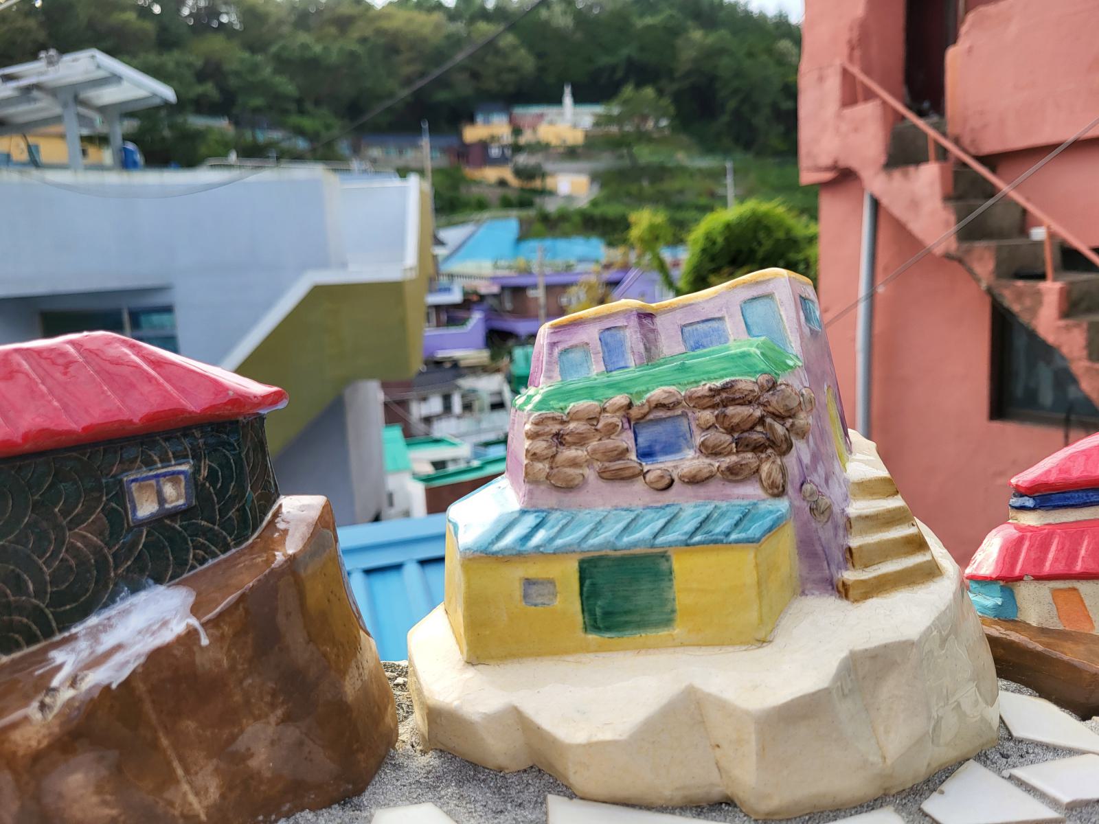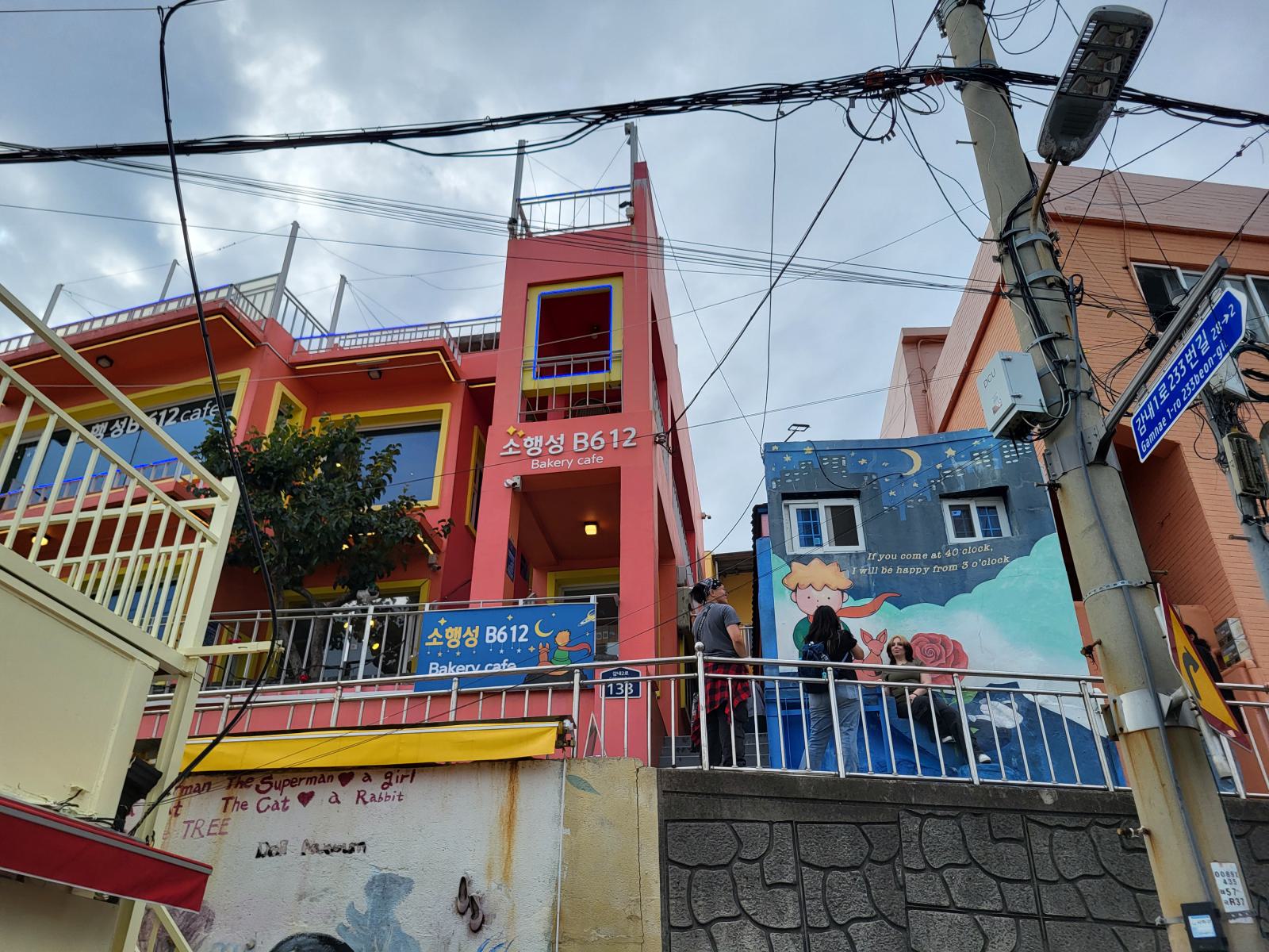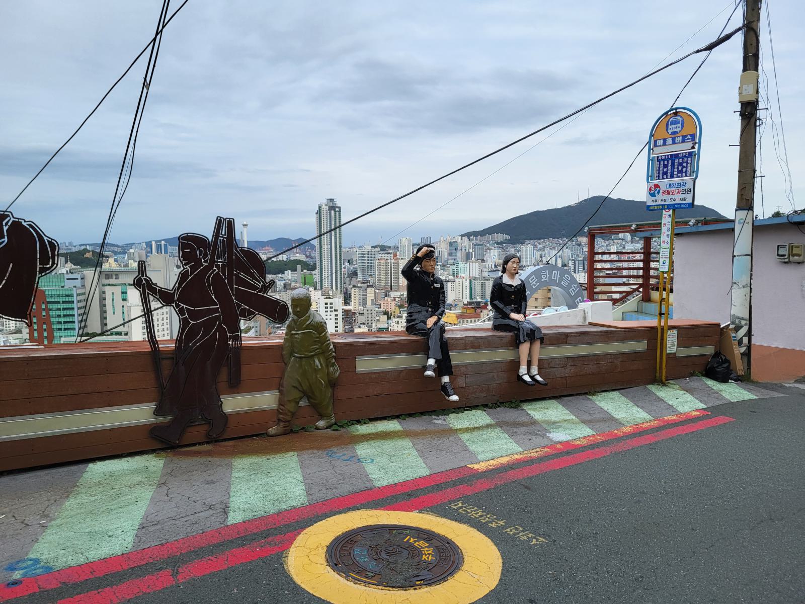 Zeit für einen kalten Kaffee, wir bestellten uns Gebäck mit roter Bohne dazu und setzten uns ins Fenster mit Blick auf Meer und Tempel und überlegten, was wir mit dem Rest des Tages anfangen wollten. Ganz in der Nähe liegt der Blueline Park, aber es gab gar keine Tickets mehr. Wir kauften schnell welche für morgen und fuhren zurück nach Süden, wir hatten ja noch Pläne von gestern, Gamcheon Village. Rückblickend muss man sagen, das ging so weiter in Busan, immer mit etwas Verzug. Die Wege in der Stadt sind einfach weit und die Möglichkeiten für einen guten Tag scheinbar unendlich. So langsam bekammen wir eine Idee davon, warum Busan so polarisiert. Hat man Zeit, ist es wunderschön, hat man keine, kann man eigentlich auch gleich wieder abreisen.