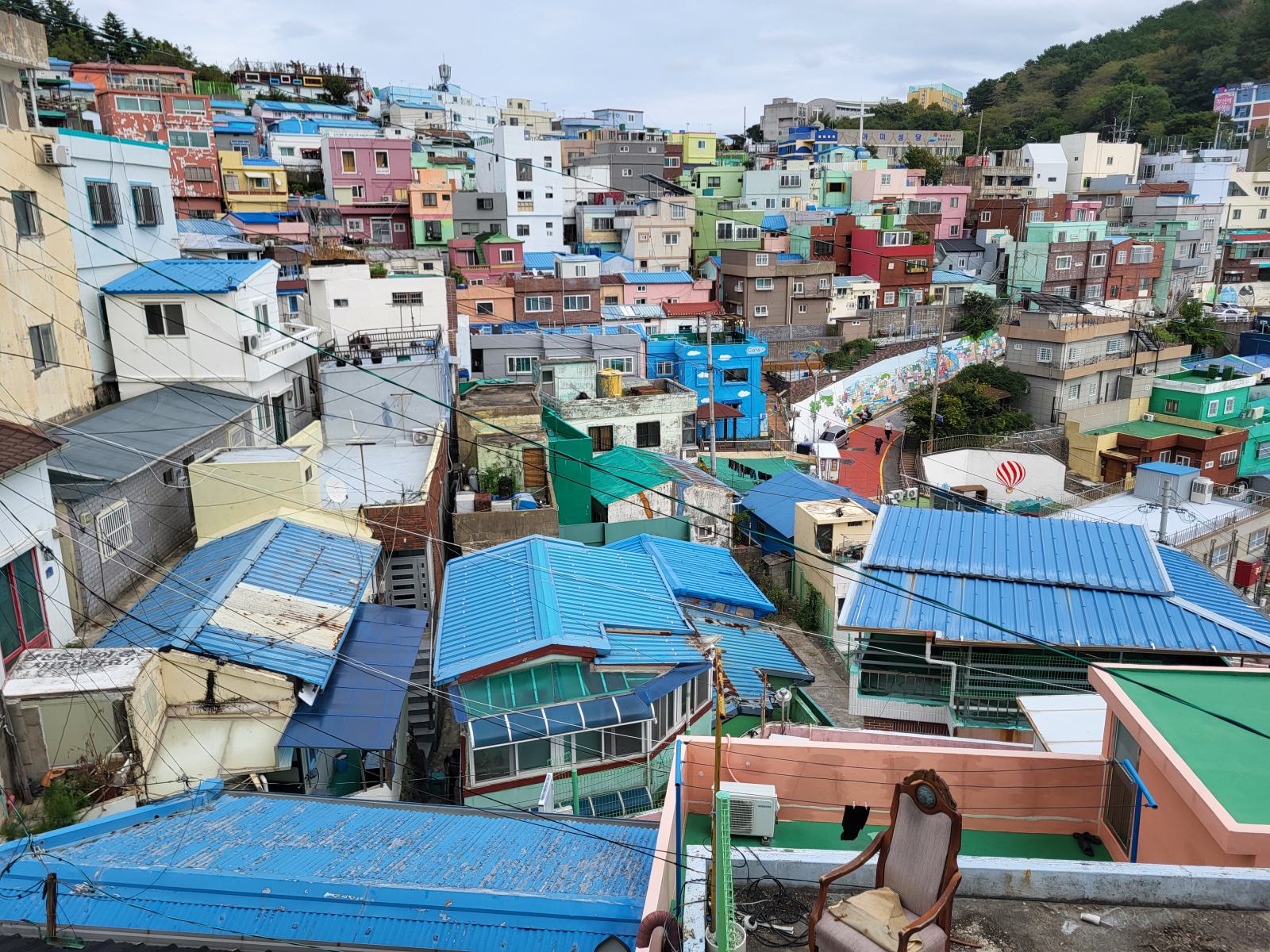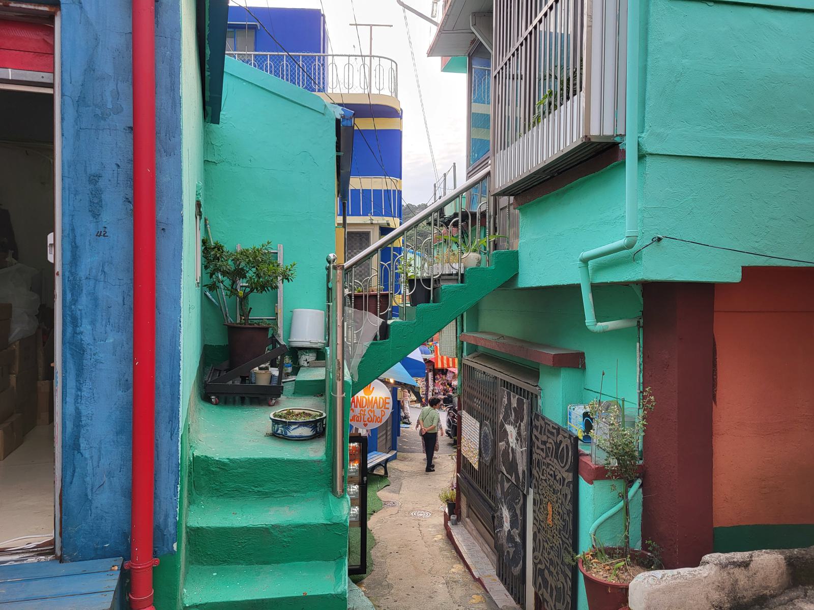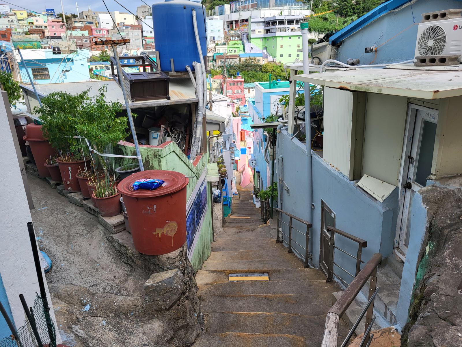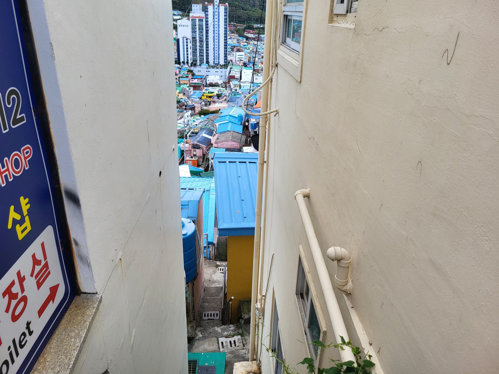 Das Taxi steckte bald hupend in Menschenmassen fest, wir stiegen aus. Vielleicht ist auch Gamcheon die Hauptsehenswürdigkeit. Das Viertel, während des Krieges von Flüchtlingen aus dem Norden erbaut, krallt sich mit seinen kleinen blauen Häusern kilometerweit in den Berg. Ganz oben gibt es die meisten Aussichtspunkte, wunderschön, aber völlig überlaufen. An manchen Aussichtspunkten, wie dem mit dem kleinen Prinzen, bildeten sich lange Schlangen für Fotos, die sogar einen eigenen Ordner erforderten. Durch ein leerstehendes Haus kamen wir eine ruhigere Etage tiefer. Das Haus hatte so niedrige Decken, dass wir nicht aufrecht darin stehen konnten. Damals gab es viel zu wenig Baumaterial und die Menschen brauchten schnell eine Unterkunft.