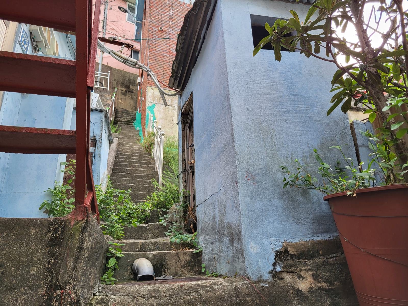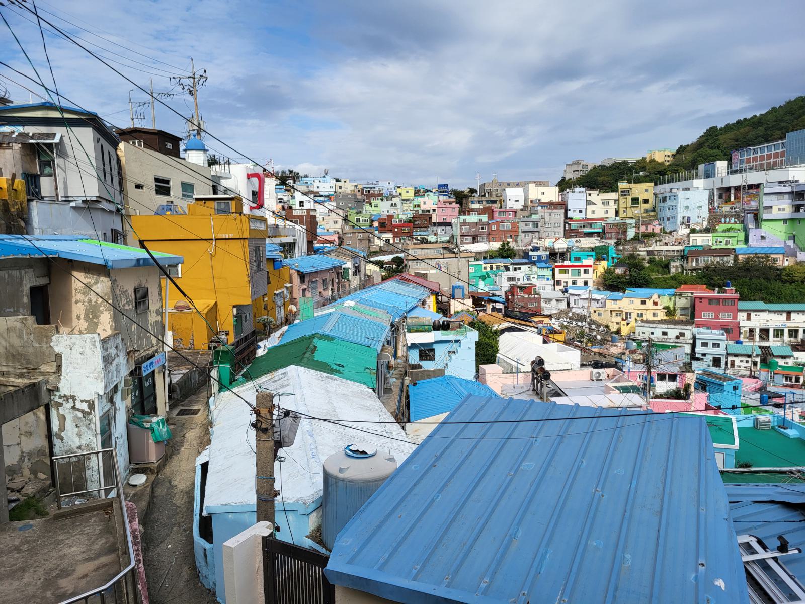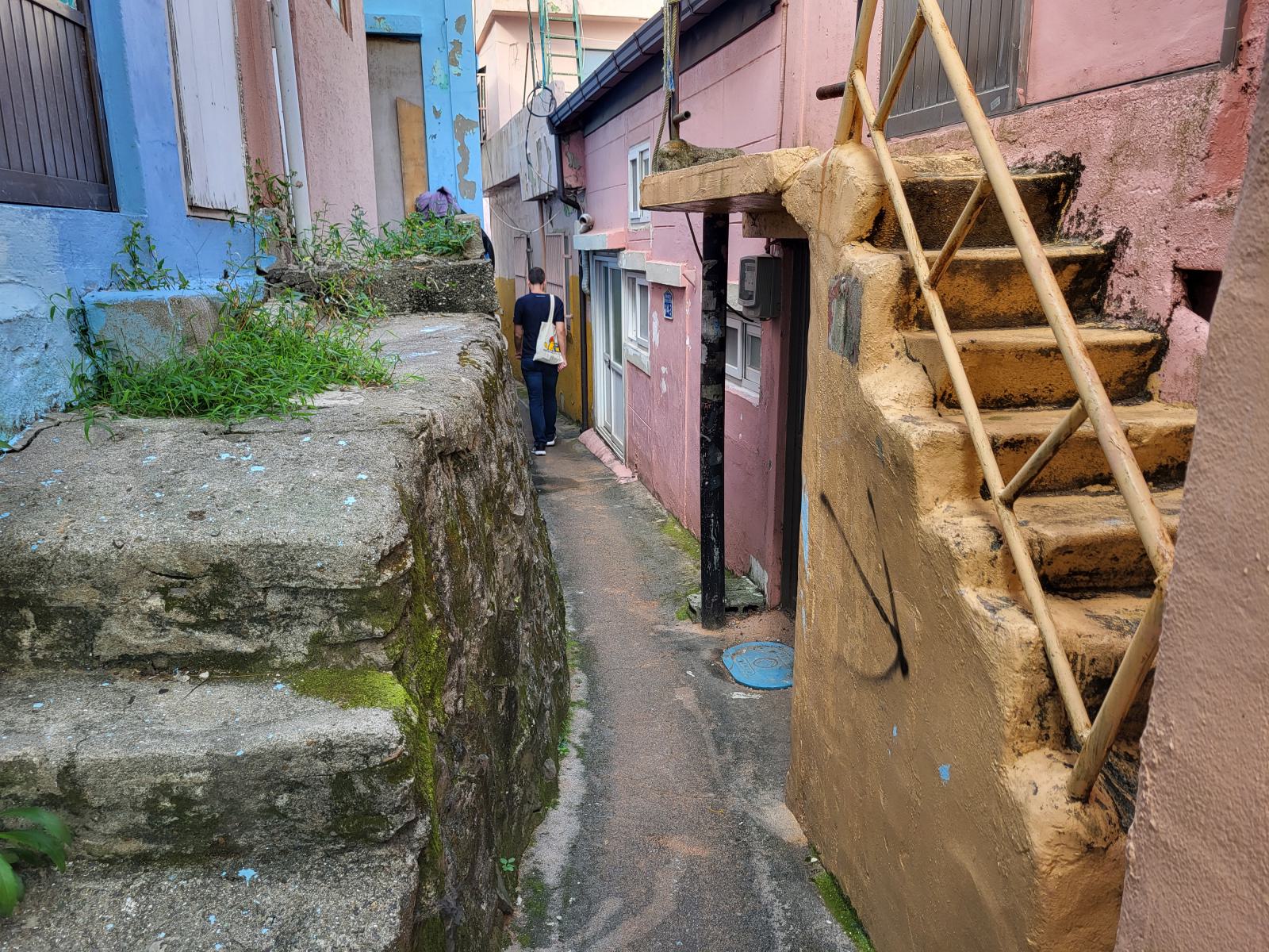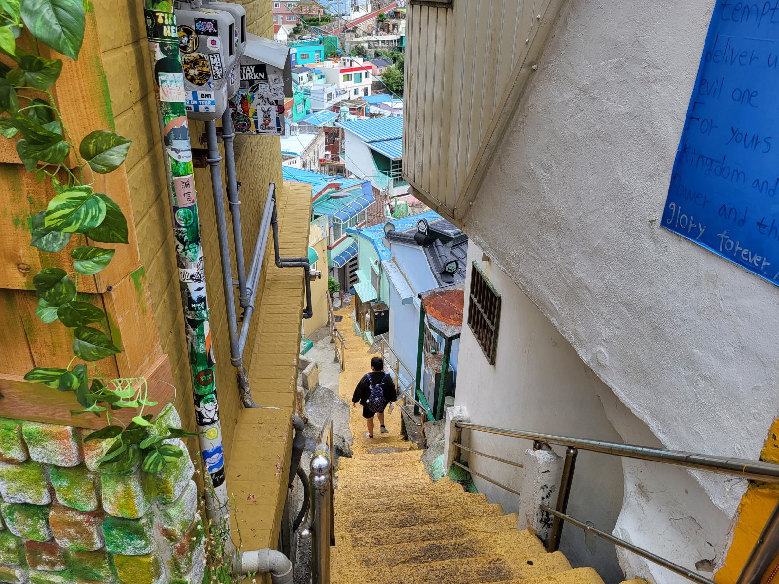 Das Taxi steckte bald hupend in Menschenmassen fest, wir stiegen aus. Vielleicht ist auch Gamcheon die Hauptsehenswürdigkeit. Das Viertel, während des Krieges von Flüchtlingen aus dem Norden erbaut, krallt sich mit seinen kleinen blauen Häusern kilometerweit in den Berg. Ganz oben gibt es die meisten Aussichtspunkte, wunderschön, aber völlig überlaufen. An manchen Aussichtspunkten, wie dem mit dem kleinen Prinzen, bildeten sich lange Schlangen für Fotos, die sogar einen eigenen Ordner erforderten. Durch ein leerstehendes Haus kamen wir eine ruhigere Etage tiefer. Das Haus hatte so niedrige Decken, dass wir nicht aufrecht darin stehen konnten. Damals gab es viel zu wenig Baumaterial und die Menschen brauchten schnell eine Unterkunft.