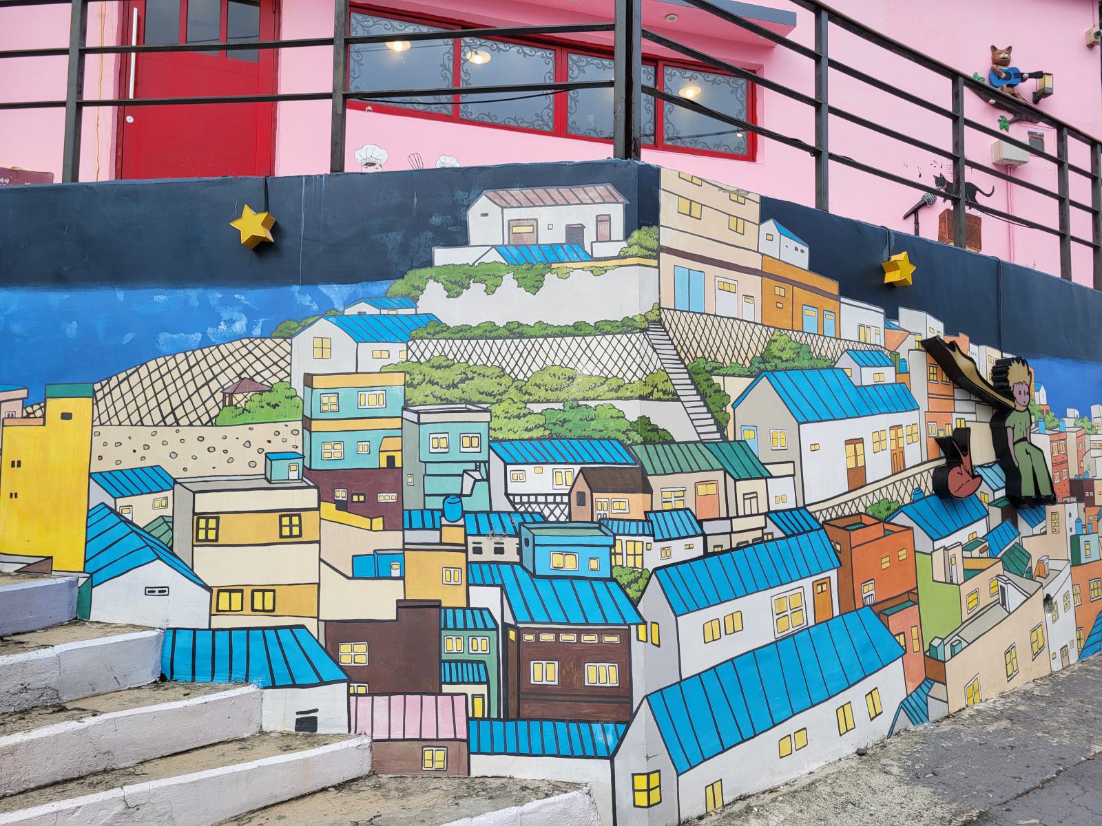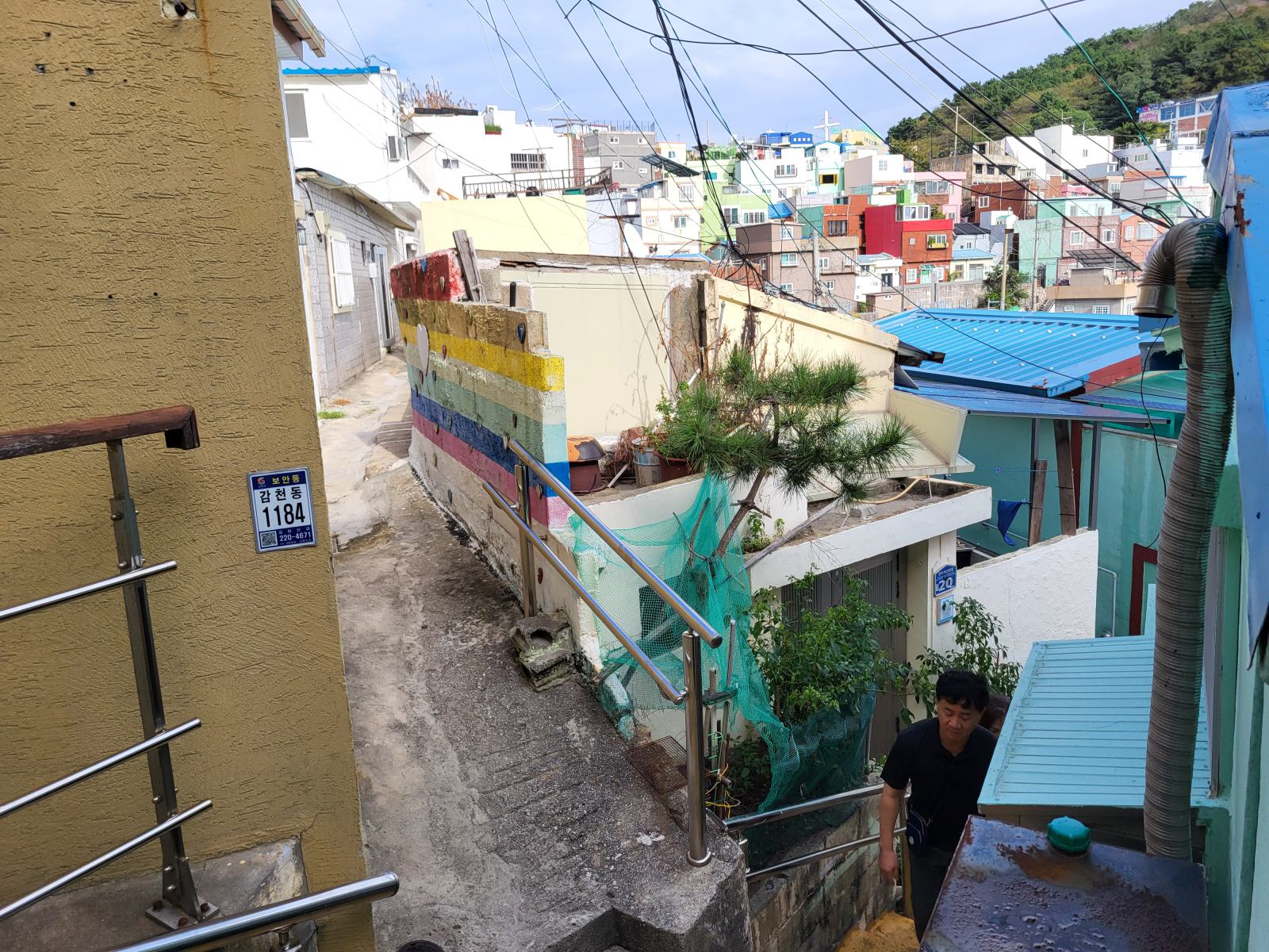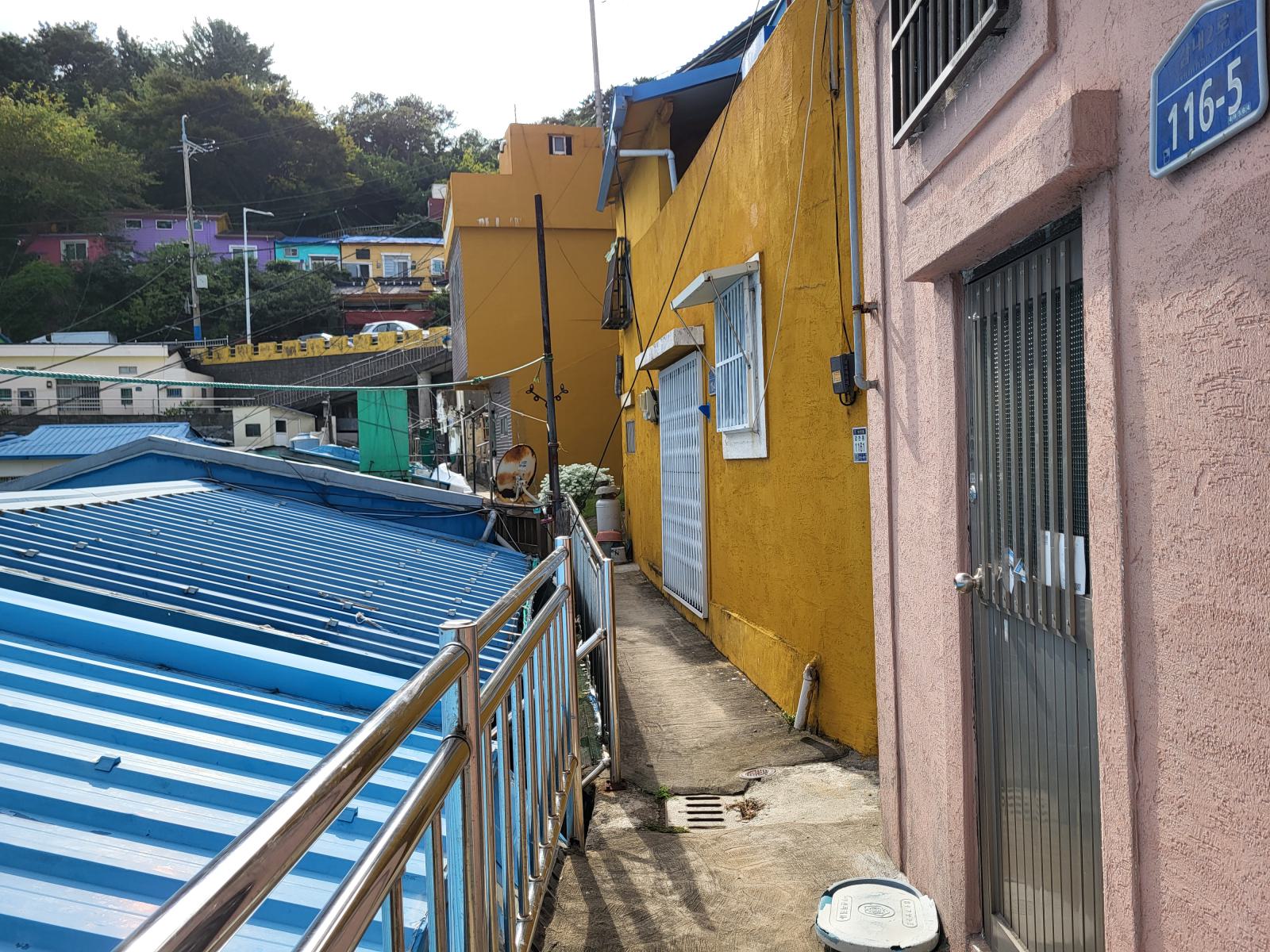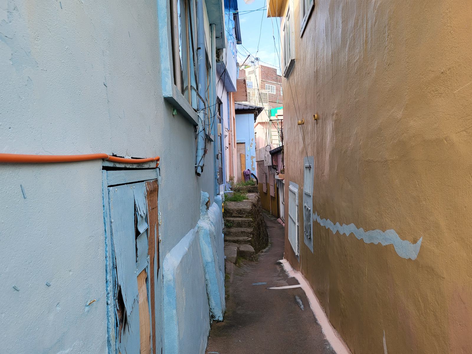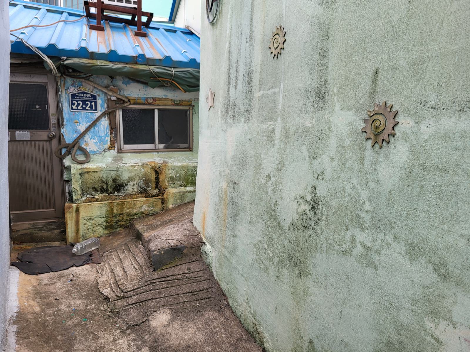 Das Taxi steckte bald hupend in Menschenmassen fest, wir stiegen aus. Vielleicht ist auch Gamcheon die Hauptsehenswürdigkeit. Das Viertel, während des Krieges von Flüchtlingen aus dem Norden erbaut, krallt sich mit seinen kleinen blauen Häusern kilometerweit in den Berg. Ganz oben gibt es die meisten Aussichtspunkte, wunderschön, aber völlig überlaufen. An manchen Aussichtspunkten, wie dem mit dem kleinen Prinzen, bildeten sich lange Schlangen für Fotos, die sogar einen eigenen Ordner erforderten. Durch ein leerstehendes Haus kamen wir eine ruhigere Etage tiefer. Das Haus hatte so niedrige Decken, dass wir nicht aufrecht darin stehen konnten. Damals gab es viel zu wenig Baumaterial und die Menschen brauchten schnell eine Unterkunft.