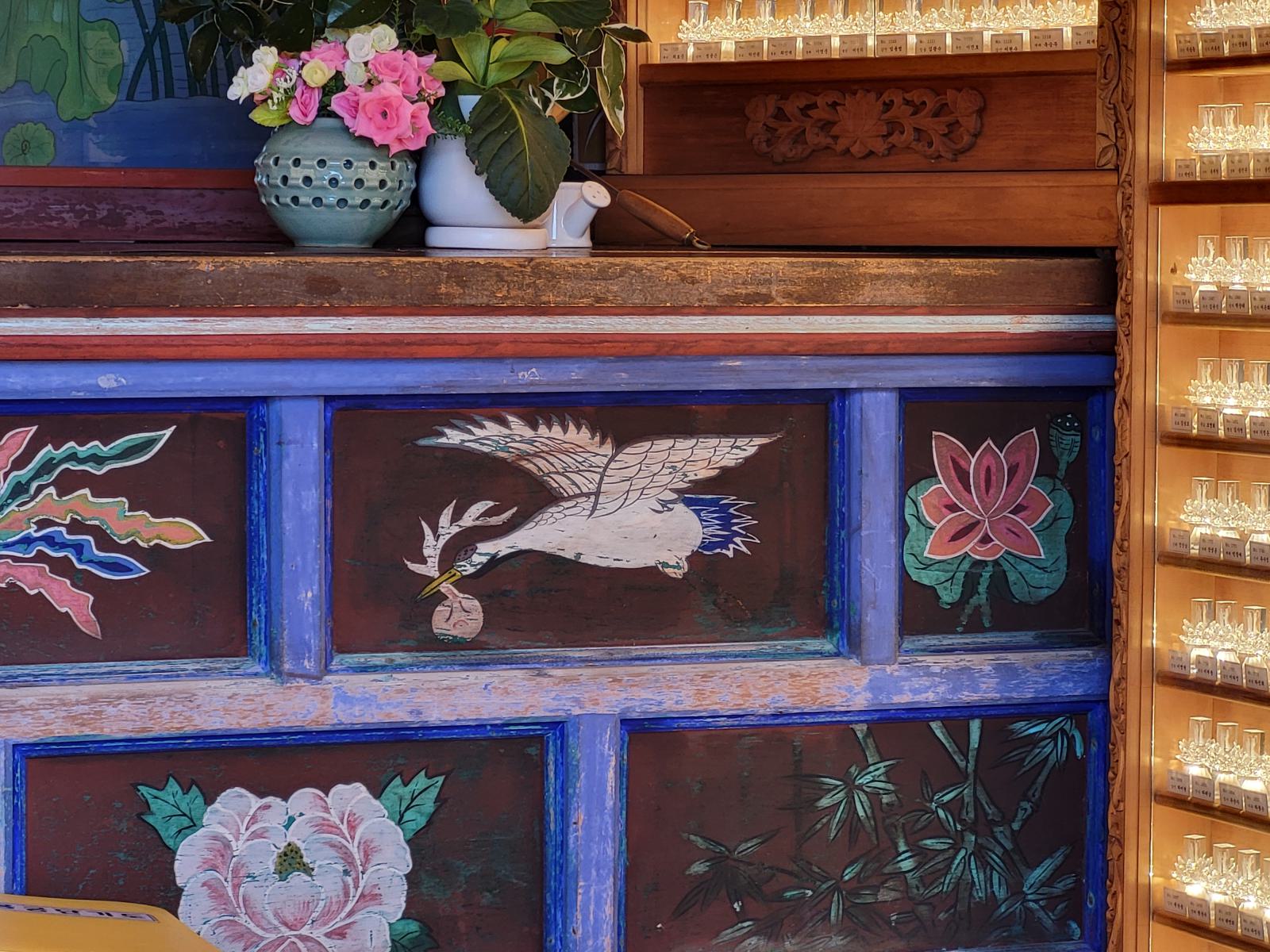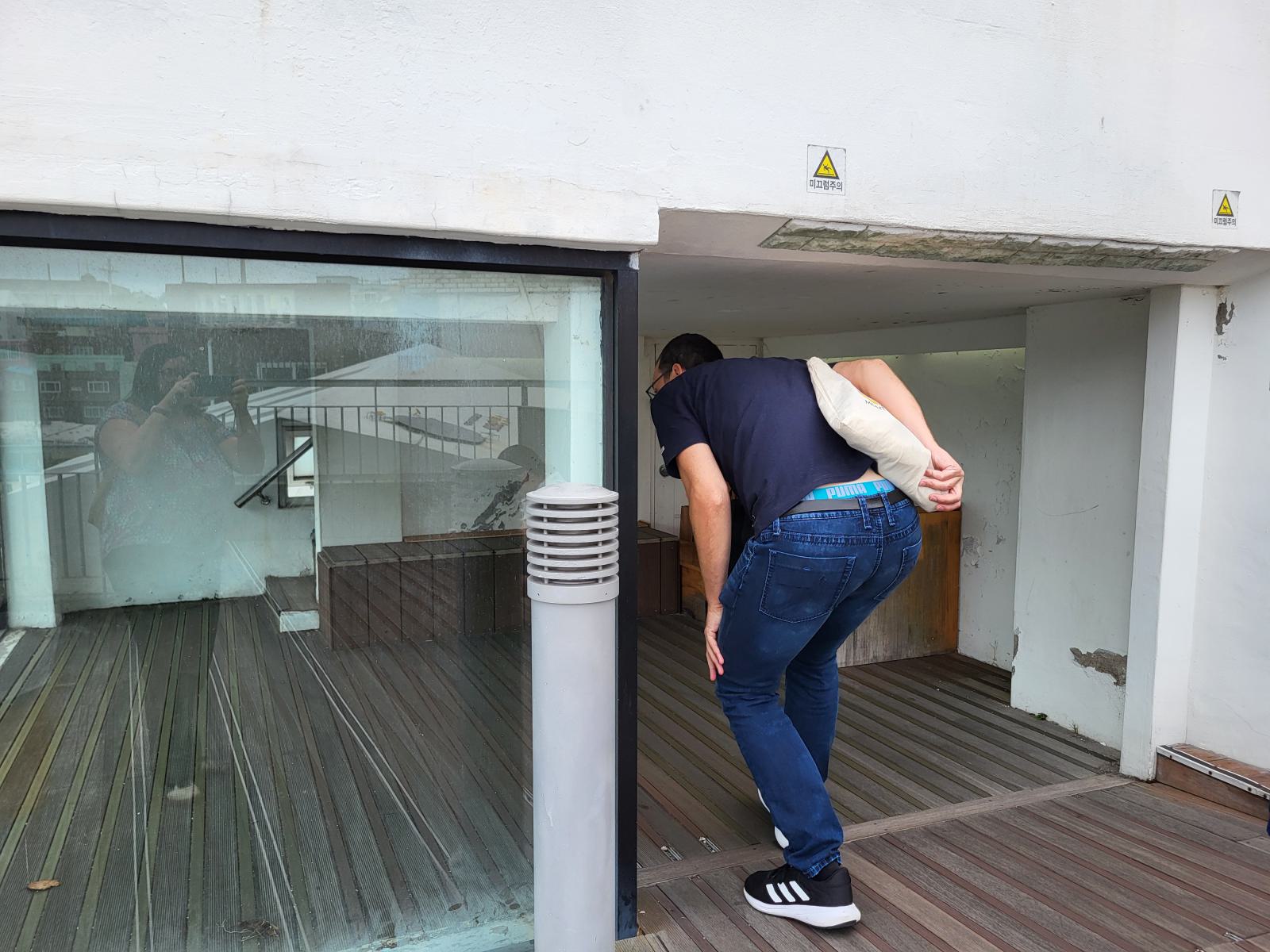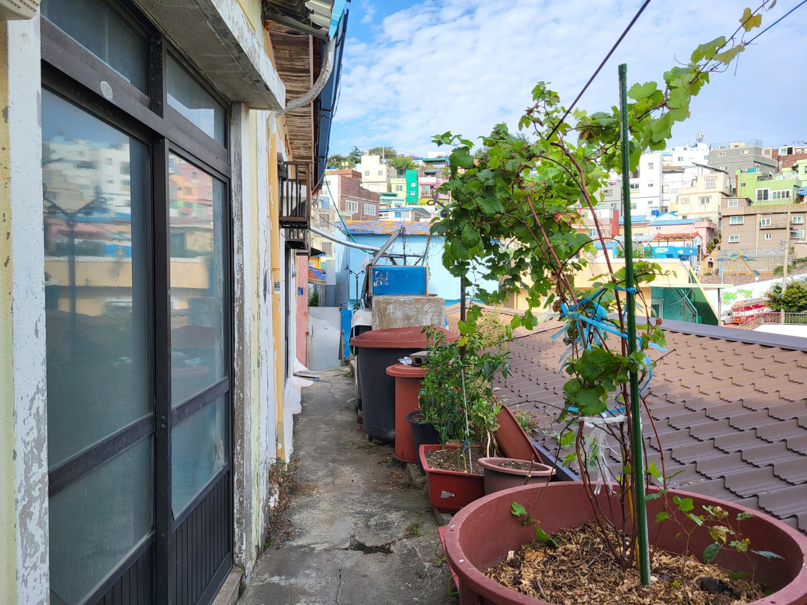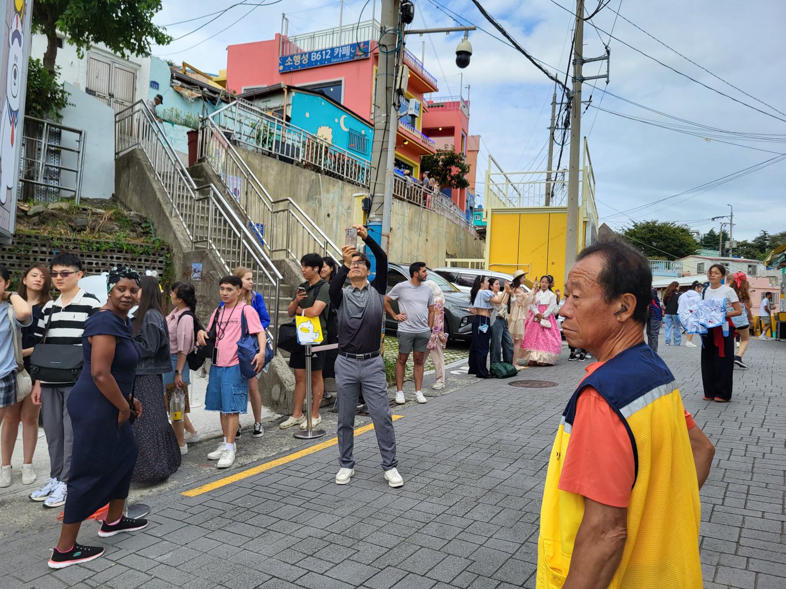 Das Taxi steckte bald hupend in Menschenmassen fest, wir stiegen aus. Vielleicht ist auch Gamcheon die Hauptsehenswürdigkeit. Das Viertel, während des Krieges von Flüchtlingen aus dem Norden erbaut, krallt sich mit seinen kleinen blauen Häusern kilometerweit in den Berg. Ganz oben gibt es die meisten Aussichtspunkte, wunderschön, aber völlig überlaufen. An manchen Aussichtspunkten, wie dem mit dem kleinen Prinzen, bildeten sich lange Schlangen für Fotos, die sogar einen eigenen Ordner erforderten. Durch ein leerstehendes Haus kamen wir eine ruhigere Etage tiefer. Das Haus hatte so niedrige Decken, dass wir nicht aufrecht darin stehen konnten. Damals gab es viel zu wenig Baumaterial und die Menschen brauchten schnell eine Unterkunft.