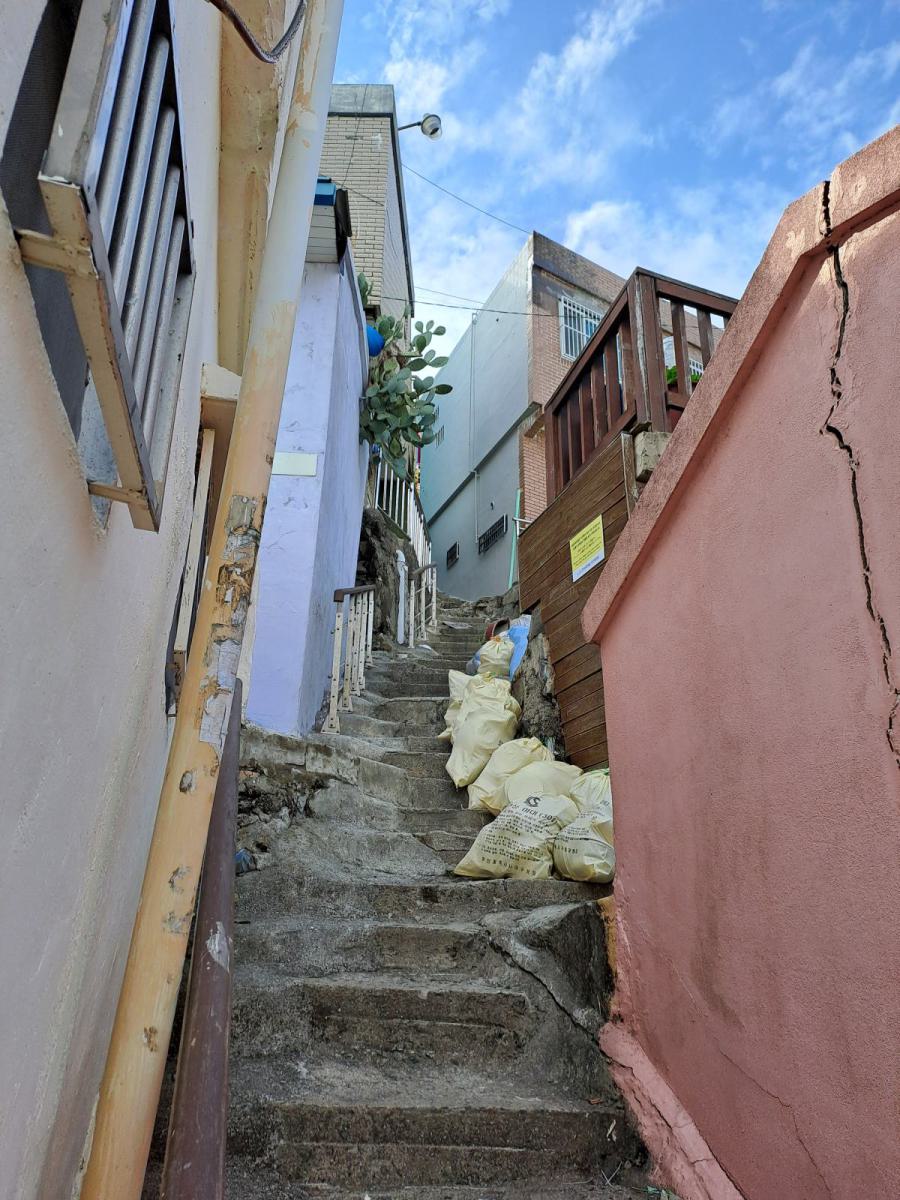 Wir suchten uns einen Weg aus der Masse und wagten uns ein paar Etagen nach unten, hinein in den Irrgarten. Steile Treppen und schmale Pfade führen zwischen den Häusern hindurch, hier und da wird auf den engen Wegen Gemüse angebaut und zahllose Katzen streifen umher. Vereinzelt saßen ältere Leute in den Hauseingängen oder standen in den Gassen bei einem Plausch zusammen. Stromleitungen wurschtelten sich kreuz und quer den Berg hinunter und immer wieder öffnete sich der Blick über die niedrigen Dächer bis zum Meer.