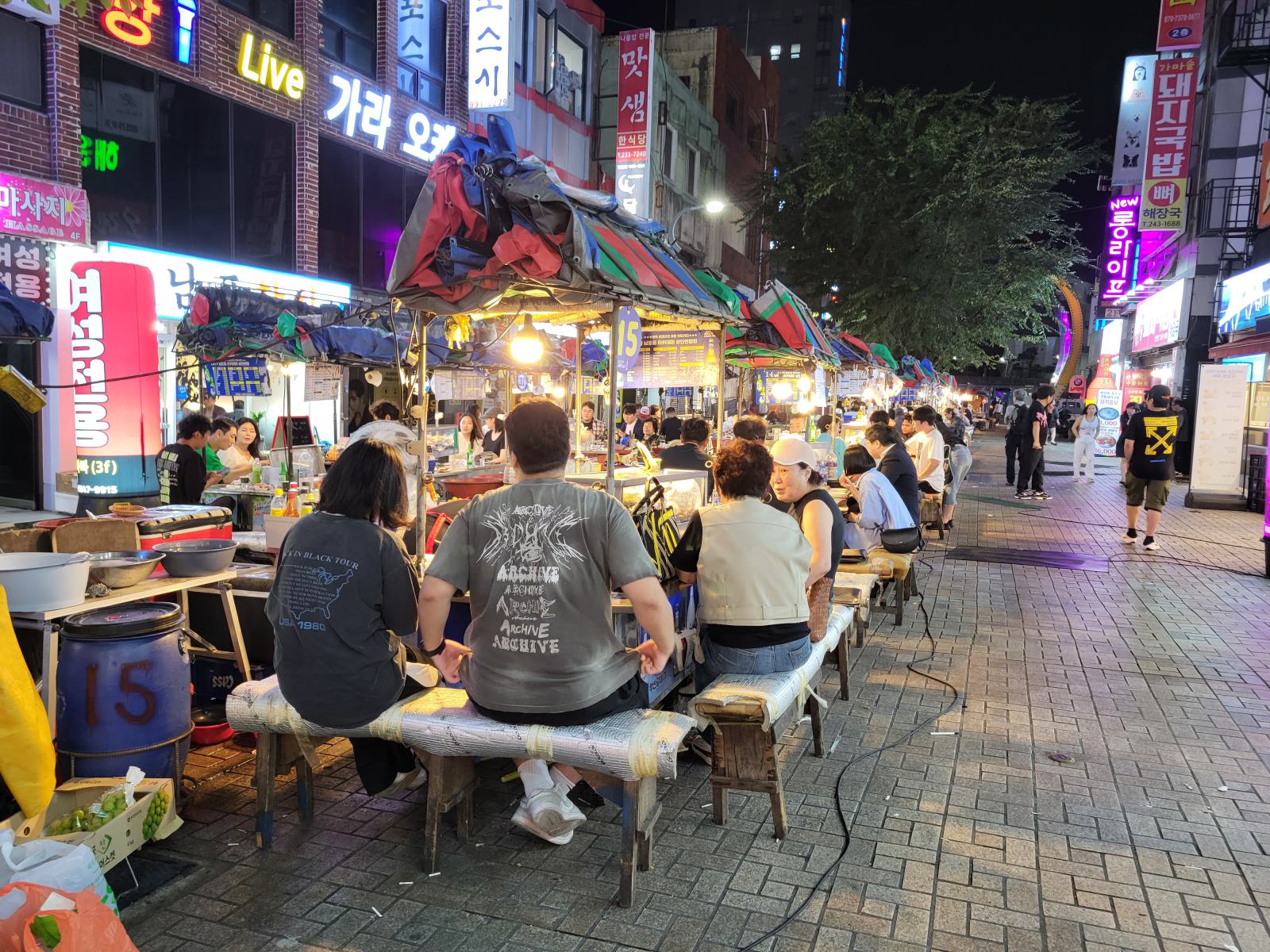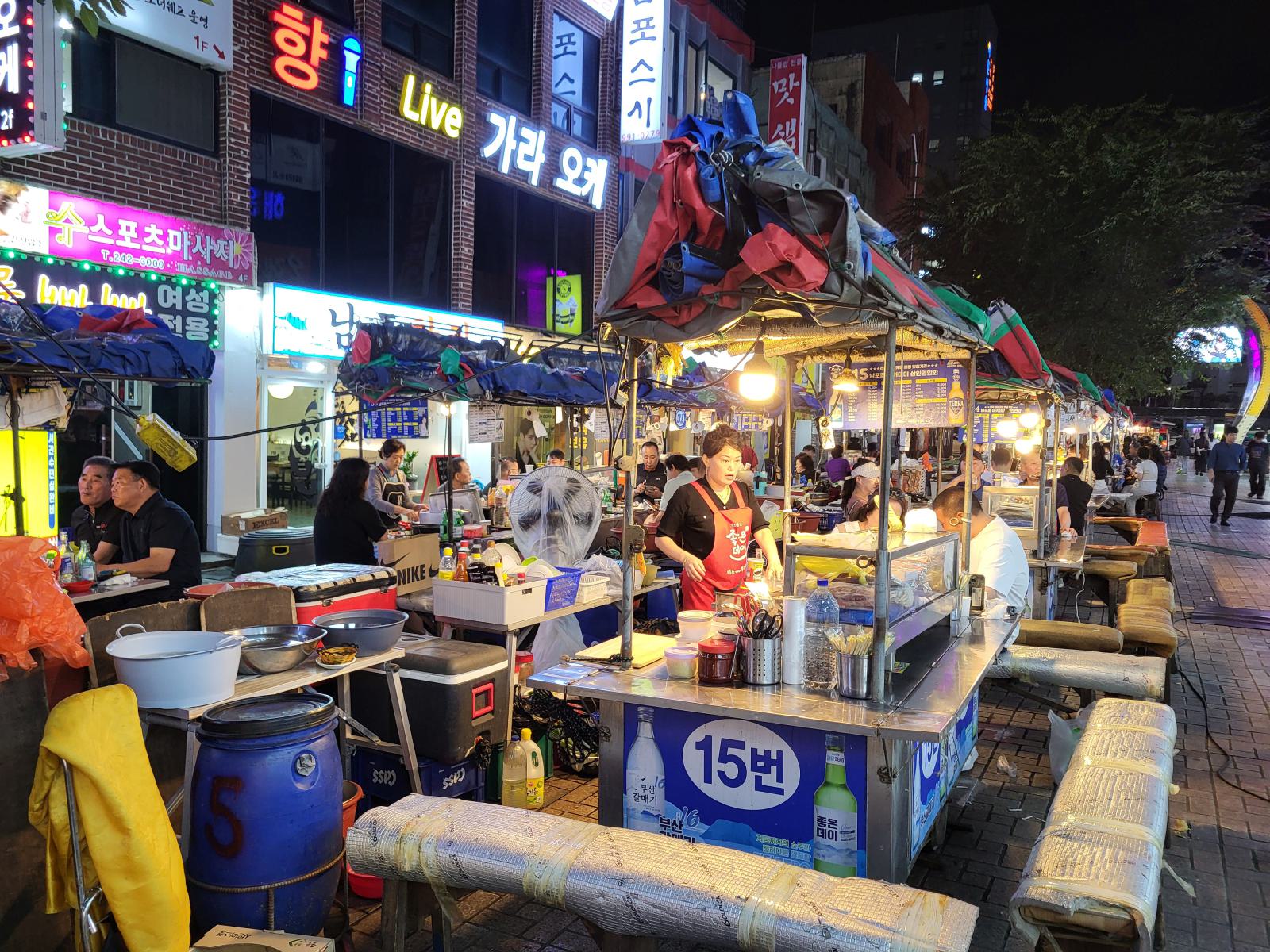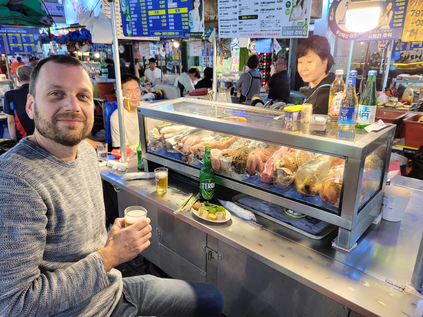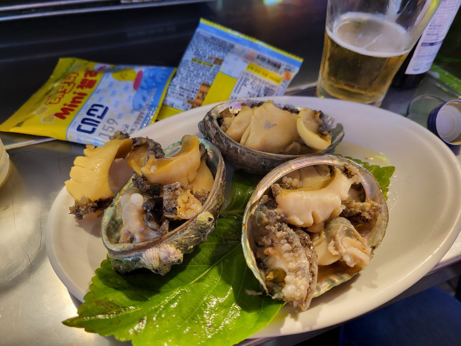 Stattdessen machten wir einen Spaziergang durch die Straßen am Biff Square. Am Abend waren dort eine Reihe weiterer Essensstände aufgebaut und ein kleiner Snack ginge schon. Das traf sich gut, denn die Stände waren zum Trinken gedacht. Das Essen war dafür etwas teurer, wie wir es schon aus Seoul kannten. Wir wählten einen Stand an dem schon ein paar Einheimische für ein Feierabendbier saßen. Die Standbetreiberin kam herum und setzte sich neben uns, um uns, wie zwei kleinen Kindern bei der Essensauswahl zu helfen. Sie sprach kein Englisch aber das ganze Angebot lag in der Theke und sie machte uns verschiedene Vorschläge. Wir entschieden uns für Abalone und gegrillte Seezunge. Als Vorspeise bekamen wir einen Teller Obst mit Chilisoße und ein Rührei, während sie nach und nach die kleinen Gerichte für uns zubereitete.