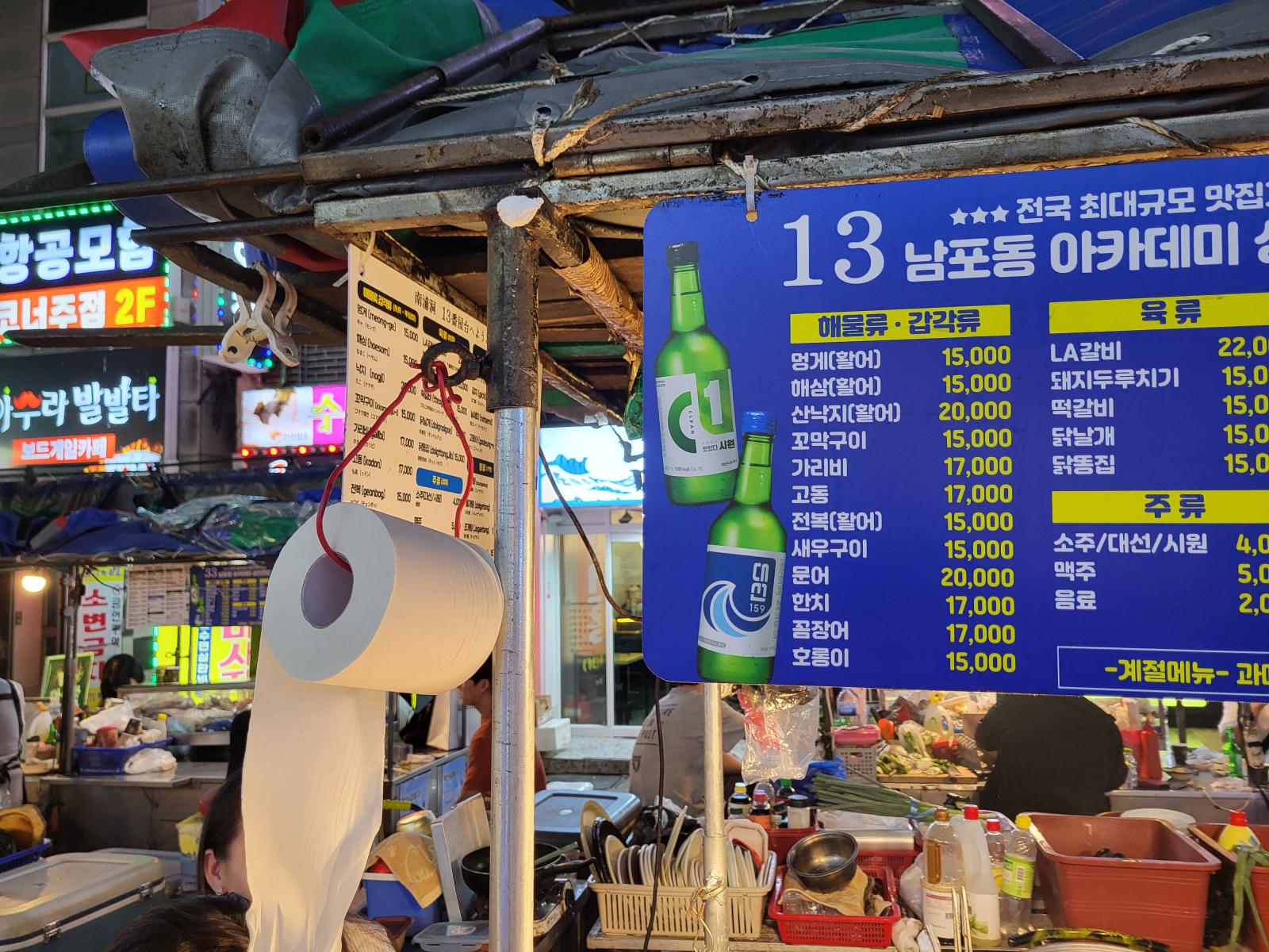 Die Abrechnung funktioniert so, dass alles stehen bleibt, jeder Teller, alle leeren Bierflaschen, dann wird einfach gezählt. Die obligatorische Klorolle als Serviettenersatz darf natürlich auch nicht fehlen.