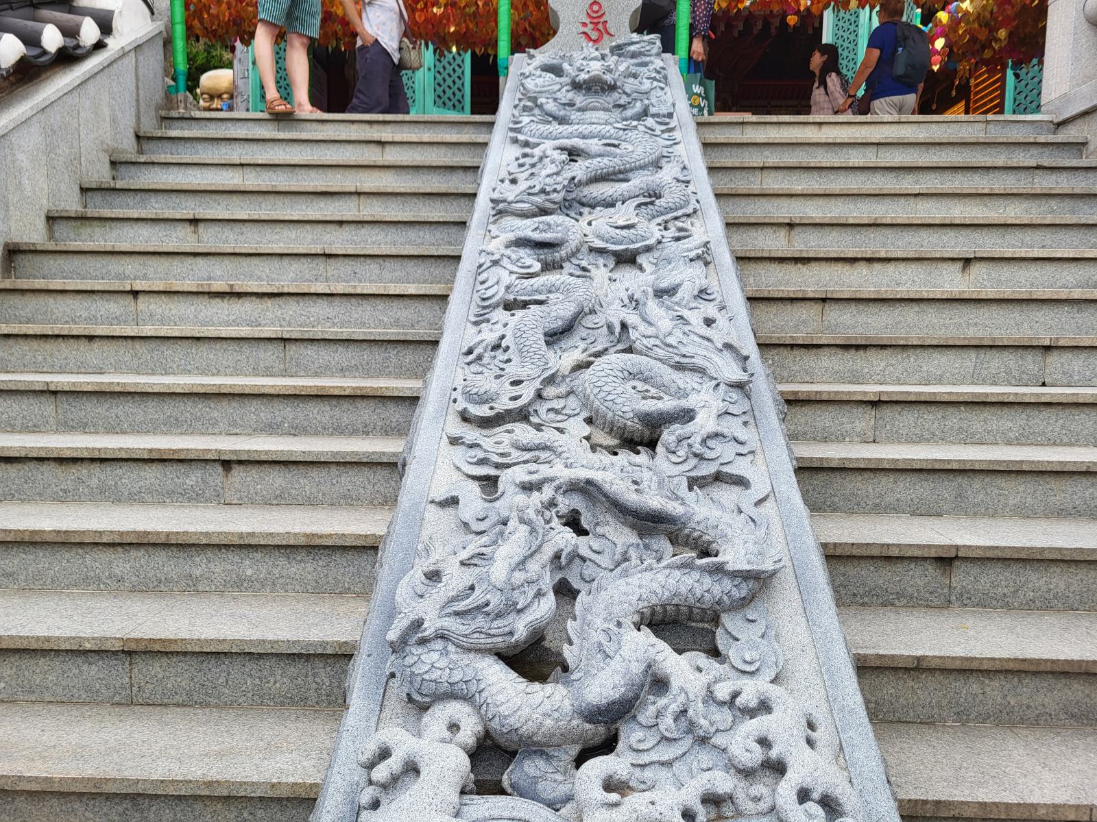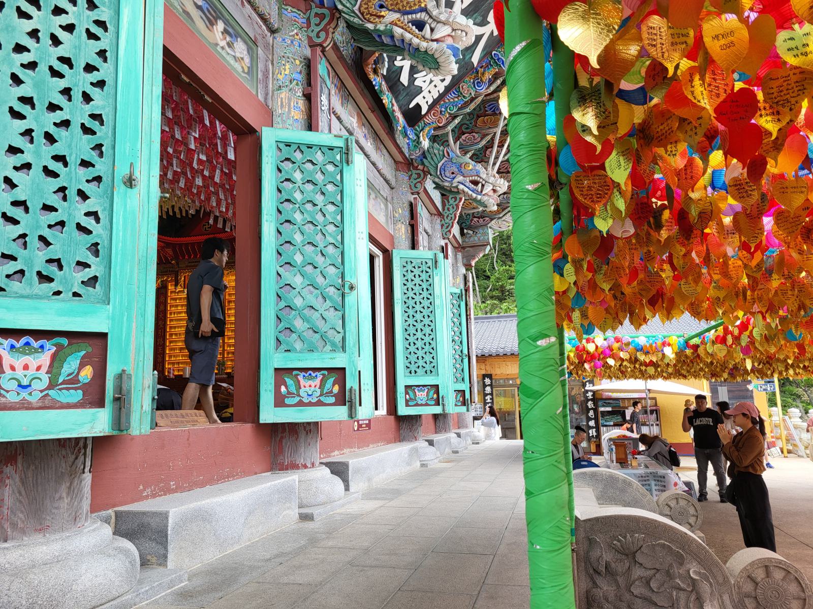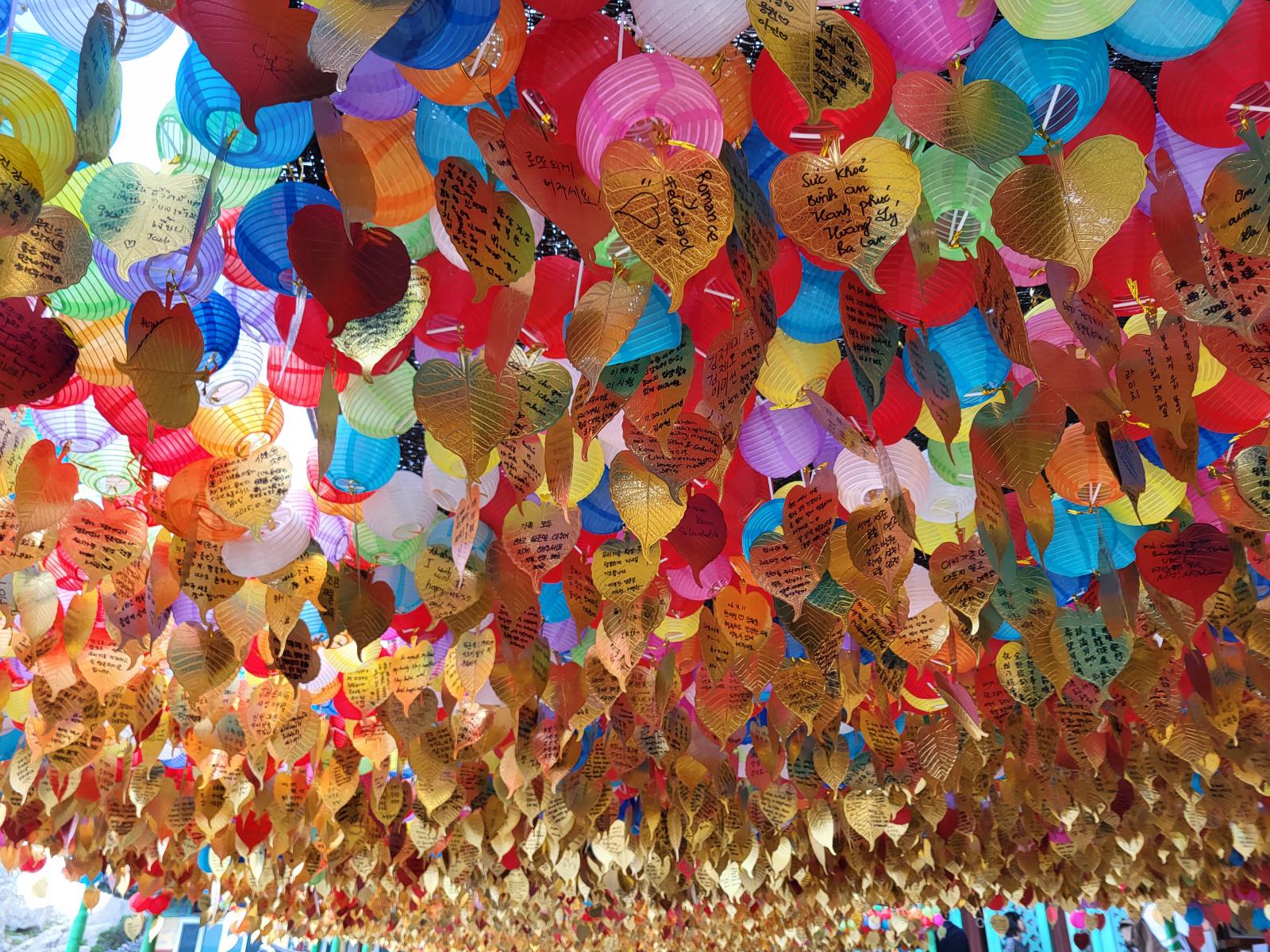Der Weg zum Eingang führt an stapelweise goldenen Blättern mit guten Wünschen vorbei und auf der Brücke versuchten Leute Münzen in ein Becken zu werfen, bejubelt von Steinskulpturen. Hinter einem Himmel aus Lampignons verbirgt sich der Haupttempel mit seinen wunderschönen Wandbildern und hellblauen Dachschnitzereien. Zum großen Buddha führt eine mit Bambus überwucherte Treppe.