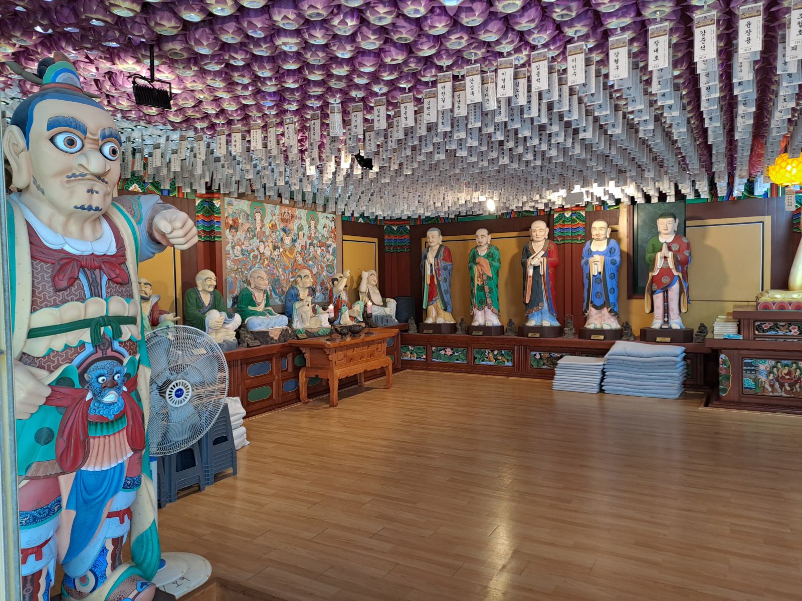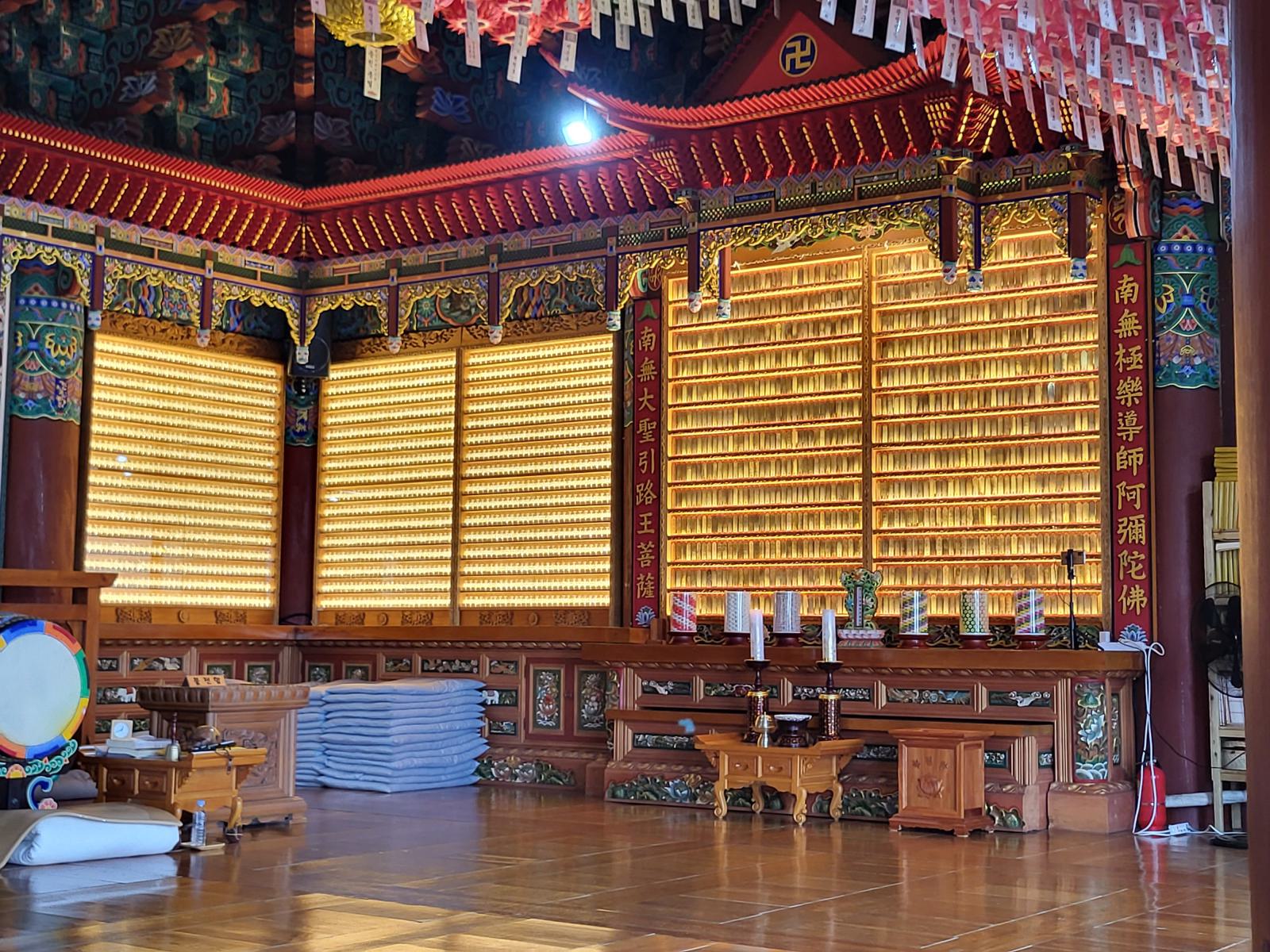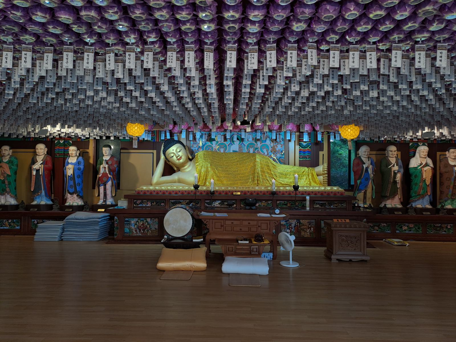 Der Weg zum Eingang führt an stapelweise goldenen Blättern mit guten Wünschen vorbei und auf der Brücke versuchten Leute Münzen in ein Becken zu werfen, bejubelt von Steinskulpturen. Hinter einem Himmel aus Lampignons verbirgt sich der Haupttempel mit seinen wunderschönen Wandbildern und hellblauen Dachschnitzereien. Zum großen Buddha führt eine mit Bambus überwucherte Treppe.