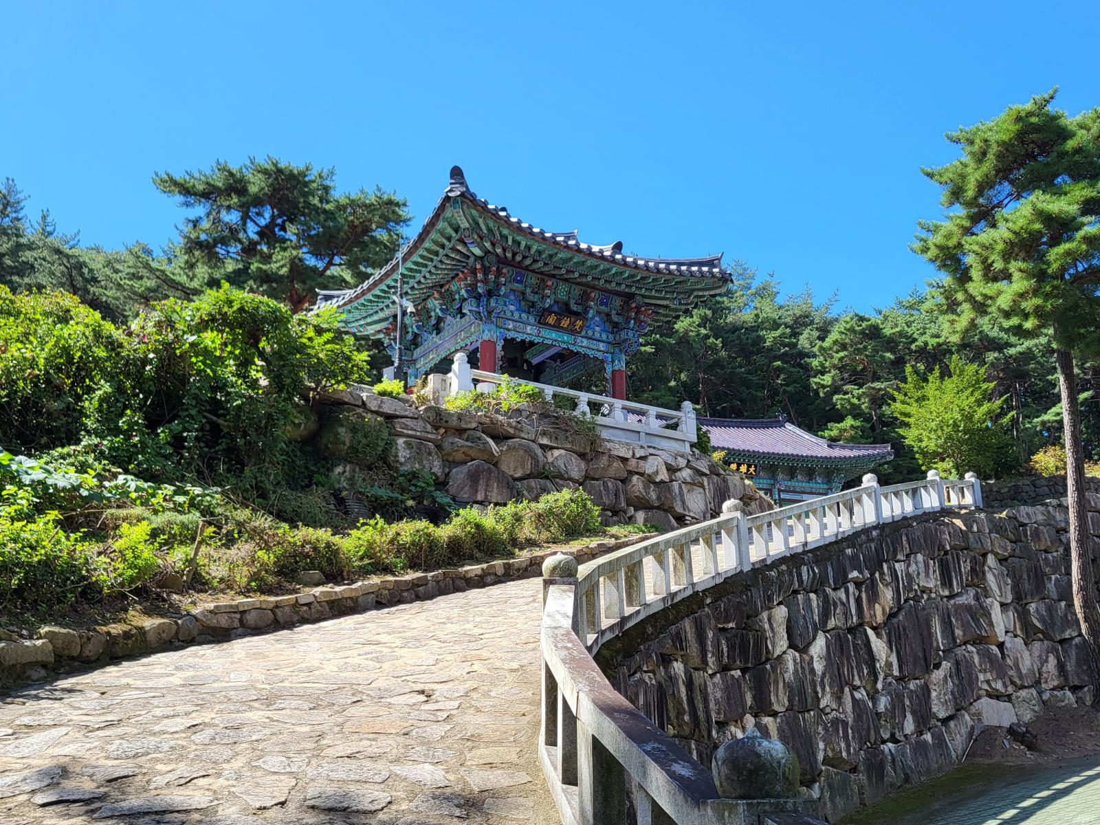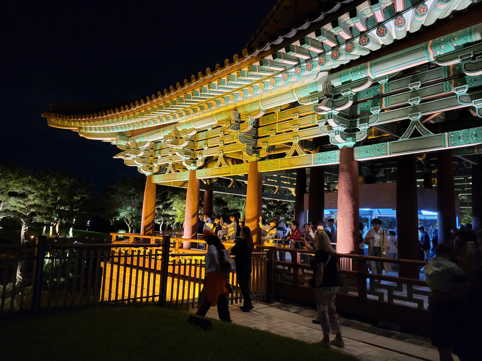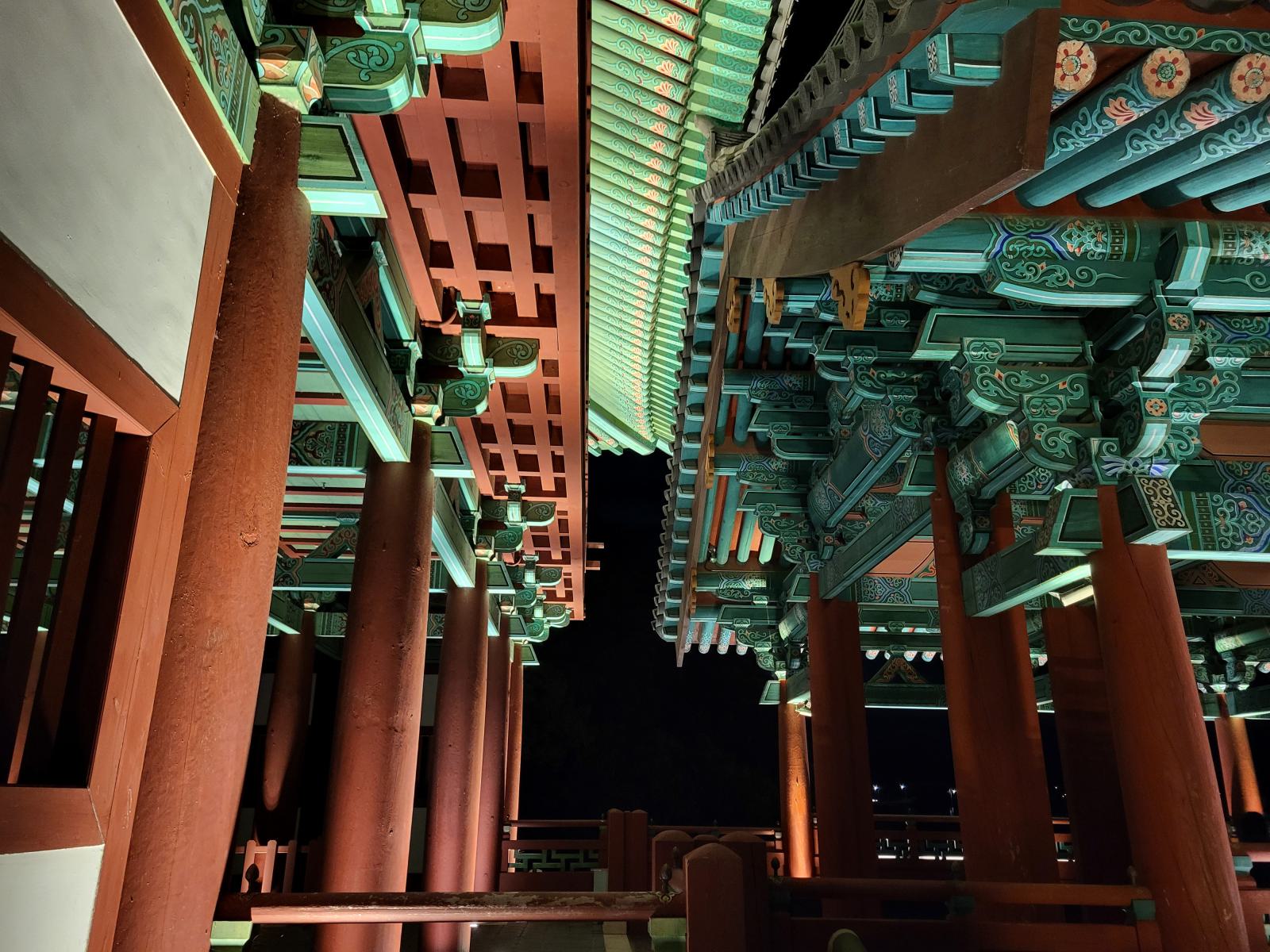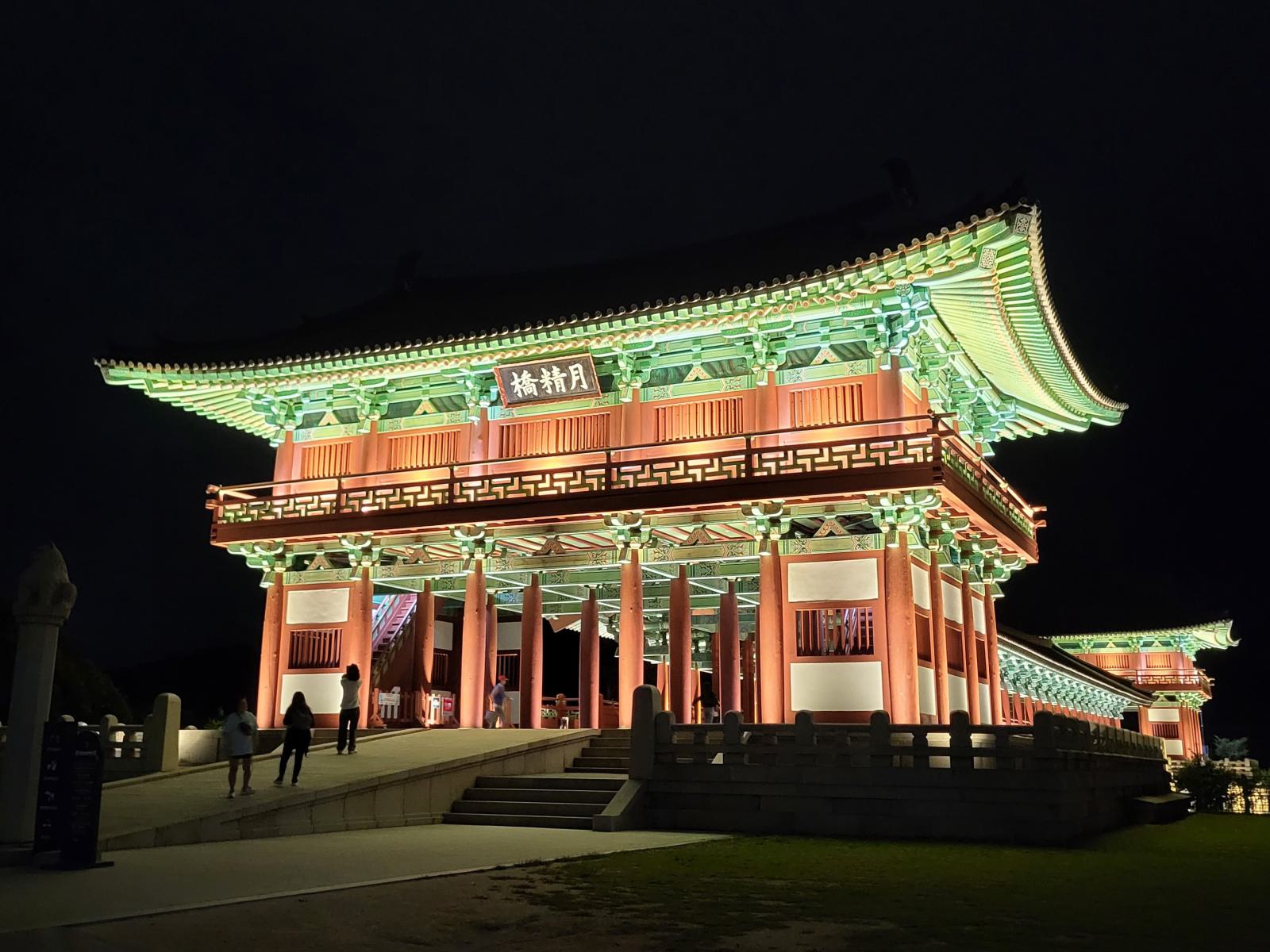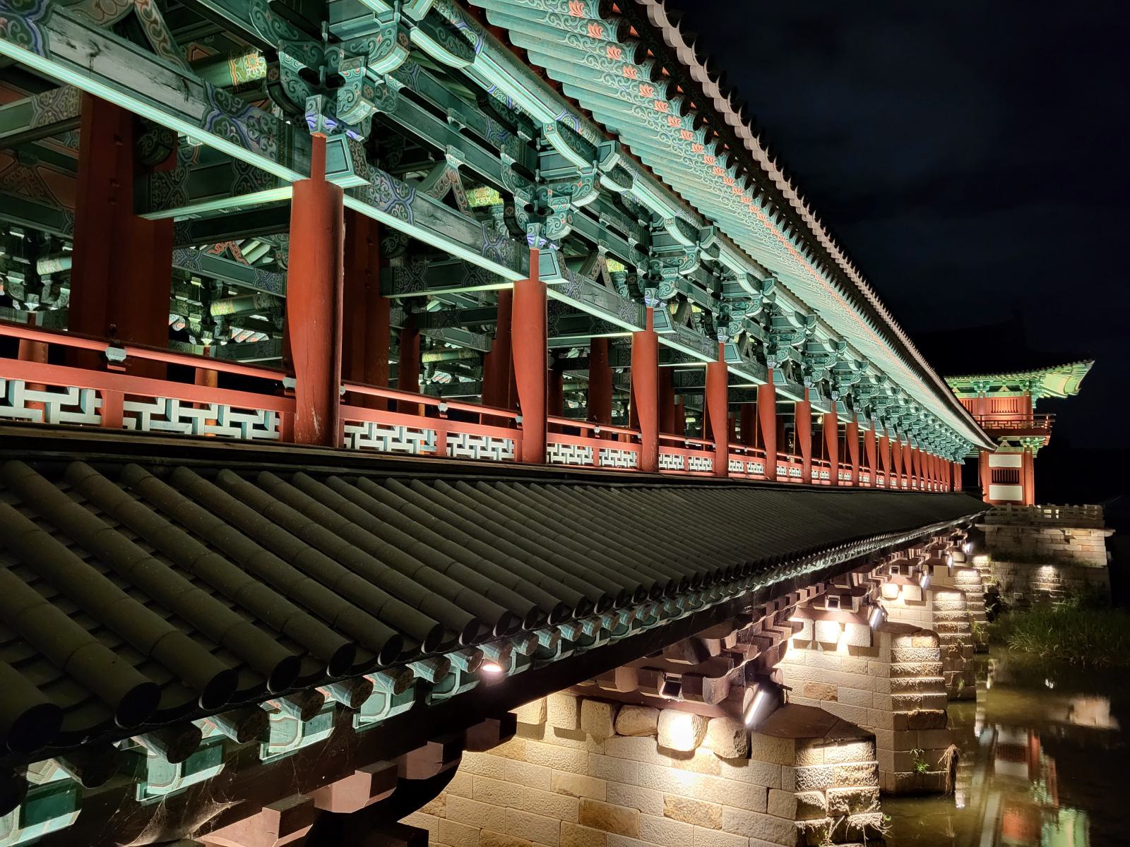 Schon aus dem Bus auf dem Weg nach Busan hatten wir die große beleuchtete Woljeonggyo Brücke gesehen, sie liegt auf der anderen Seite des Parks, einen Spaziergang durch den verwunschen schimmernden Hahnenwald entfernt. Auf beiden Seiten erheben sich hölzerne Türme, mit ihren breiten, geschitzten Galerien, dazwischen überspannt das überdachte Bauwerk den Fluss. Auf der anderen Seite sang eine schicke Frau vom Turm herab.