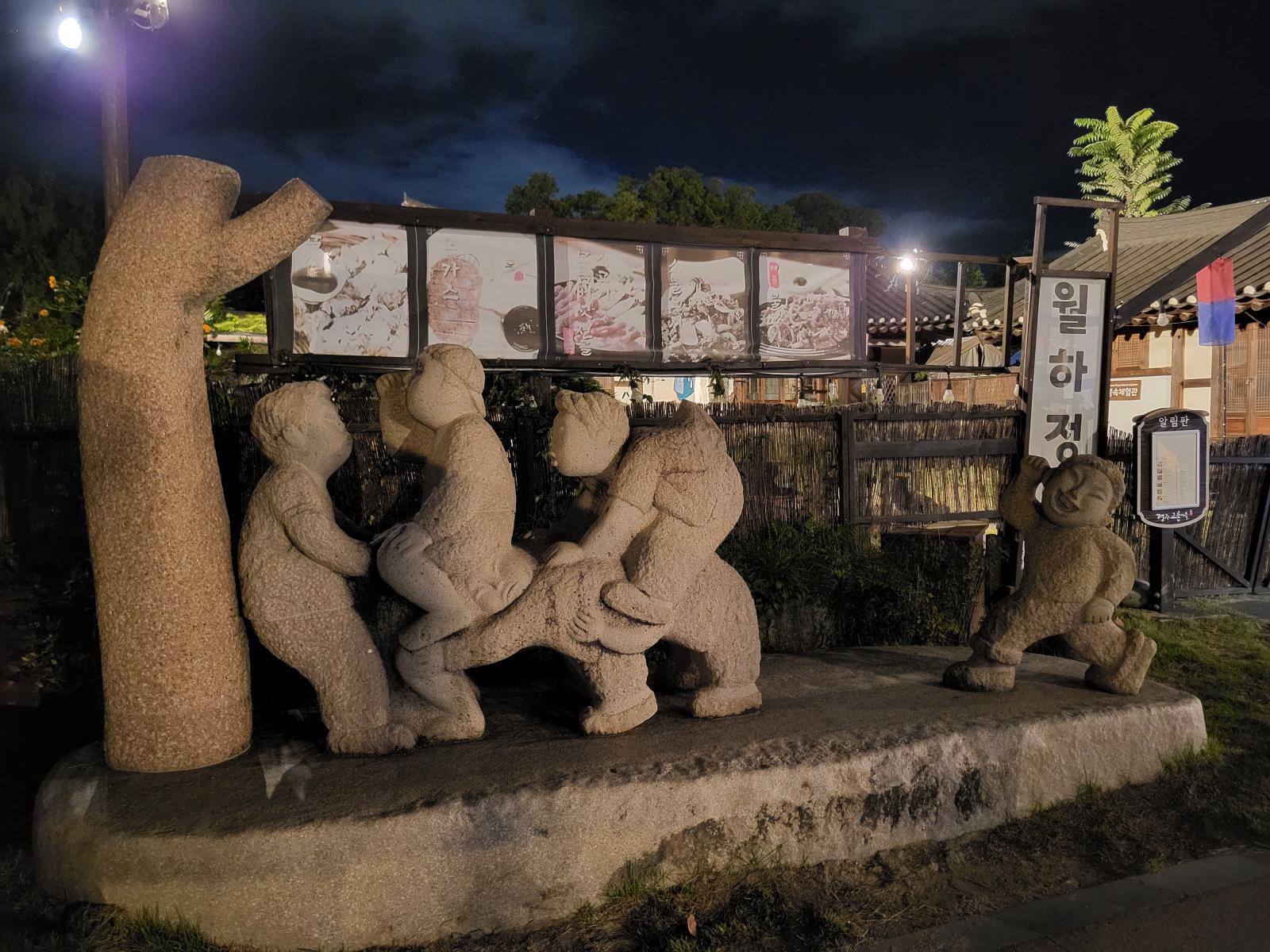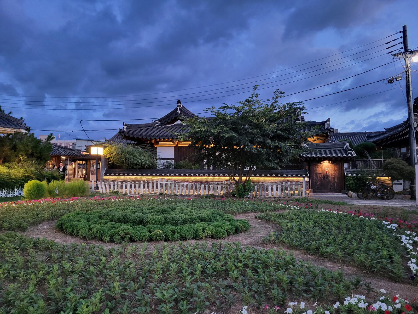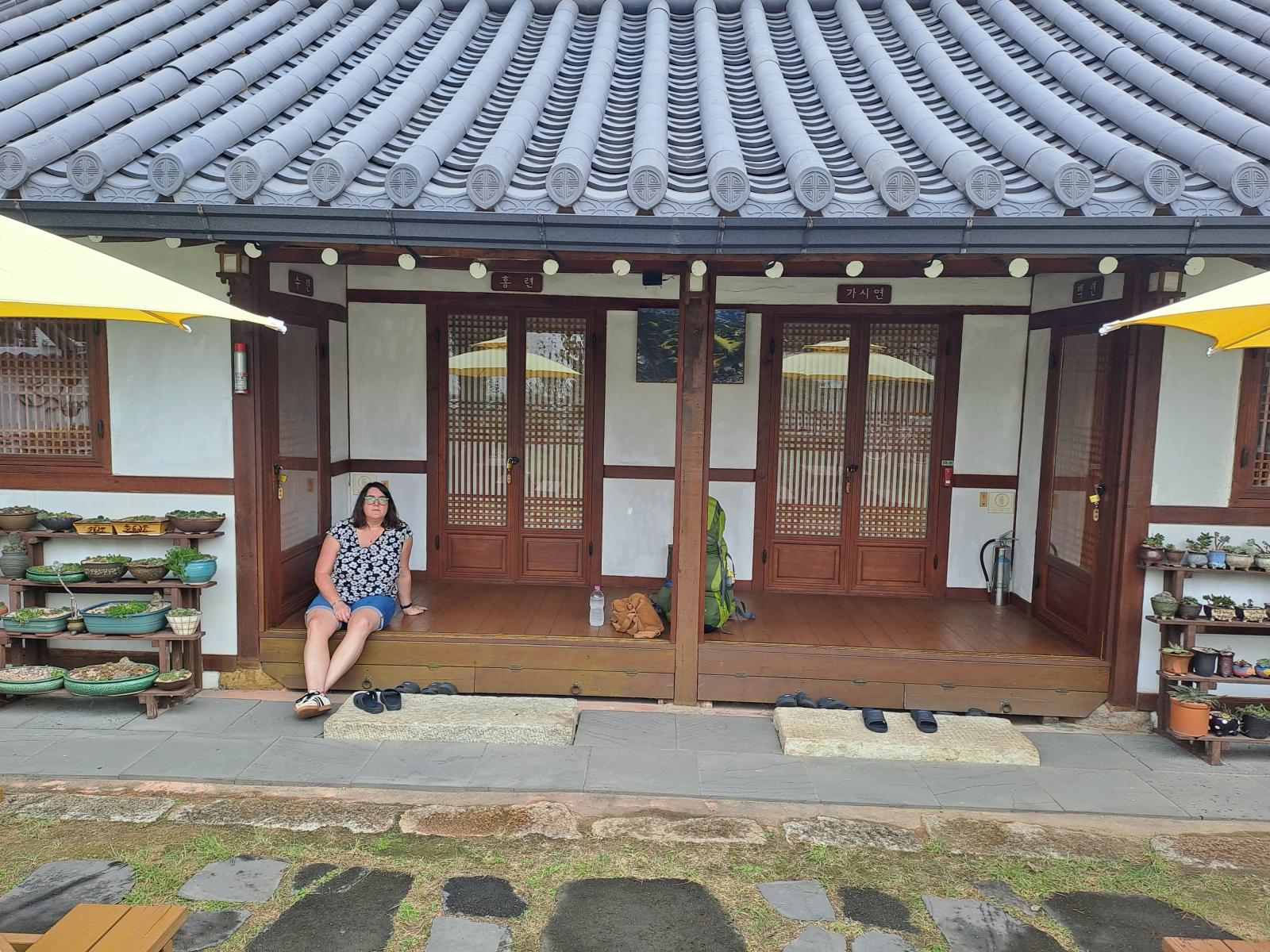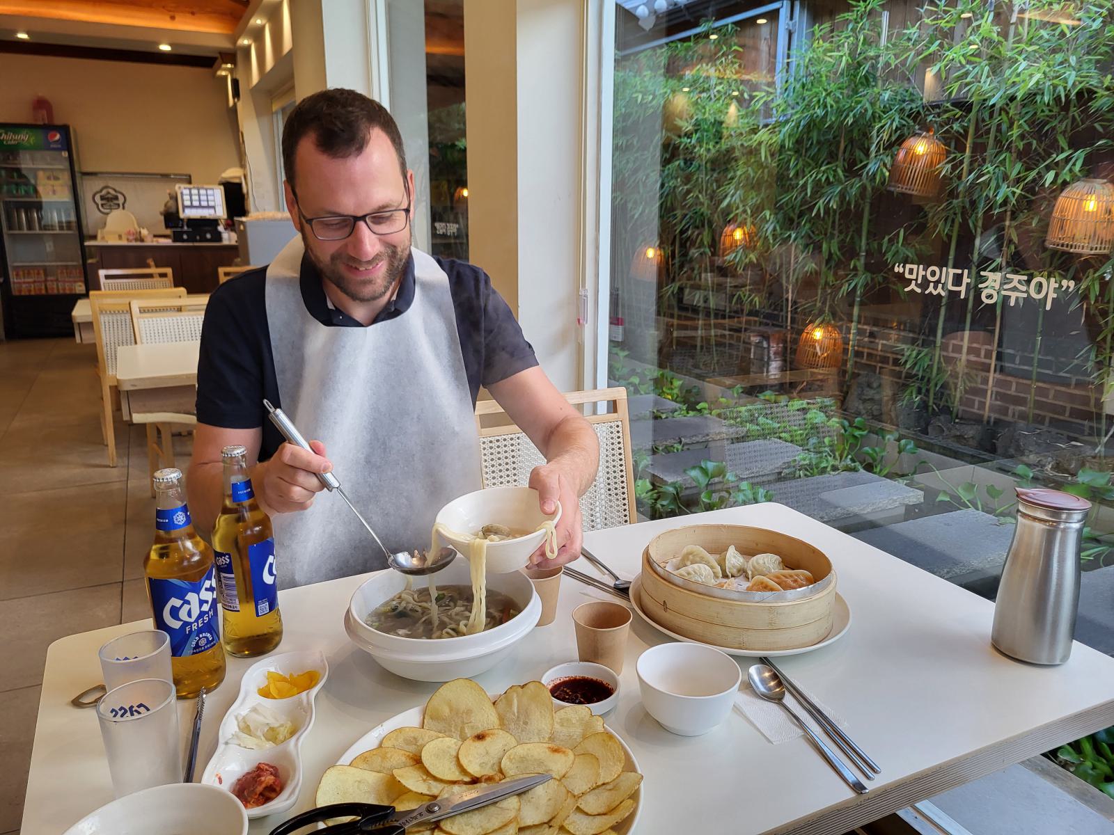 Gyeongju ist eher ländlich, und besteht neben dem Hotel- und Busparkplatzviertel und der kleinen Innenstadt hauptsächlich aus Hanoks, den traditionellen Einfamilienhäusern. Unseres lag etwas versteckt in einer Sackgasse, mit einem wunderschönen Garten. Im Nachbarzimmer wohnte eine koreanische Familie auf einem Wochenendausflug. Wenn wir draußen saßen, schlichen die Kinder neugierig um uns herum und übersetzten uns zusammen mit der Mutter die Waschmaschine. Später schenkten sie uns leckeres regionales Gebäck mit Käsekuchenfüllung. Die koreanische Gastfreundschaft gilt also auch, wenn man selbst Gast ist.