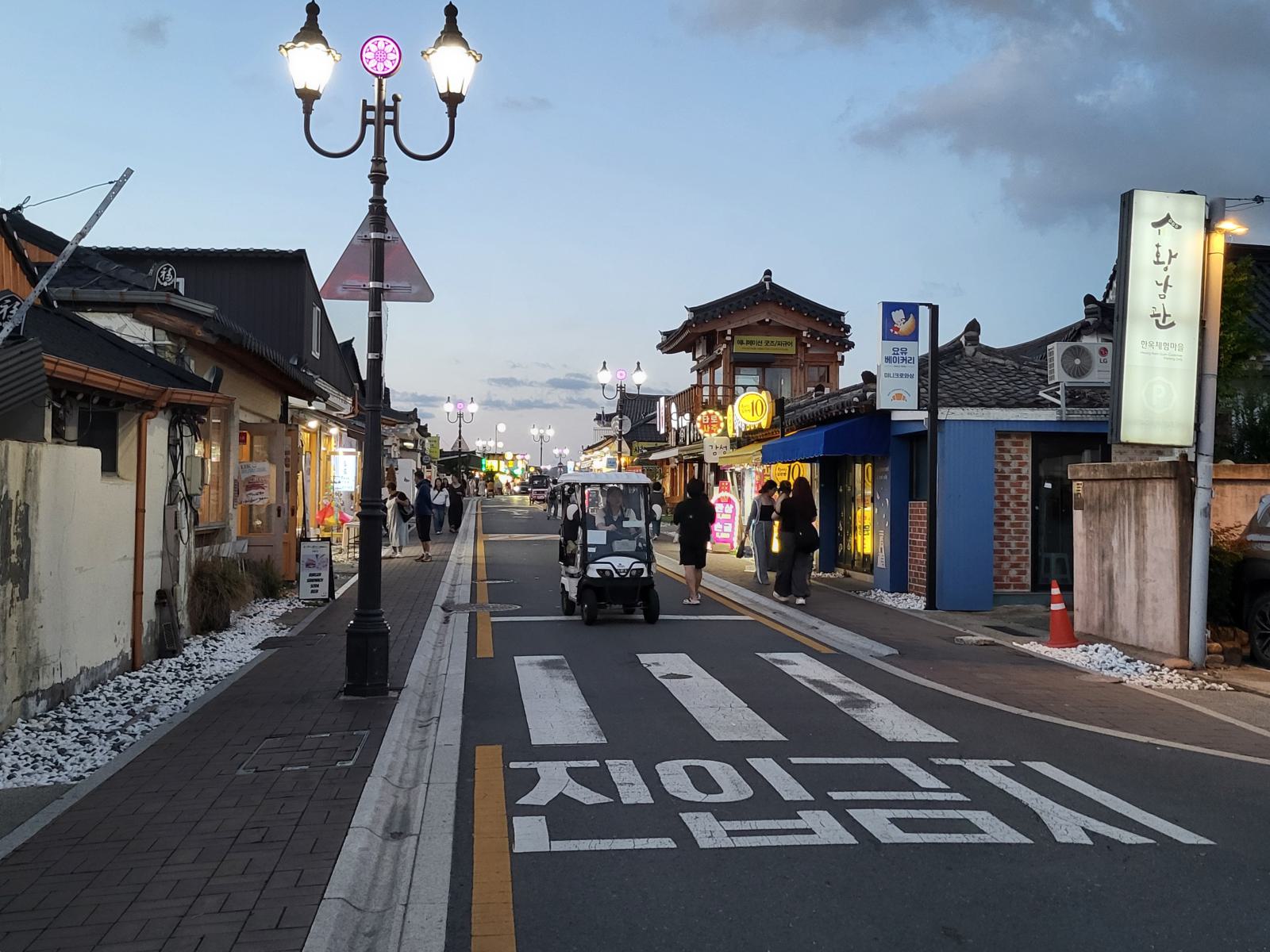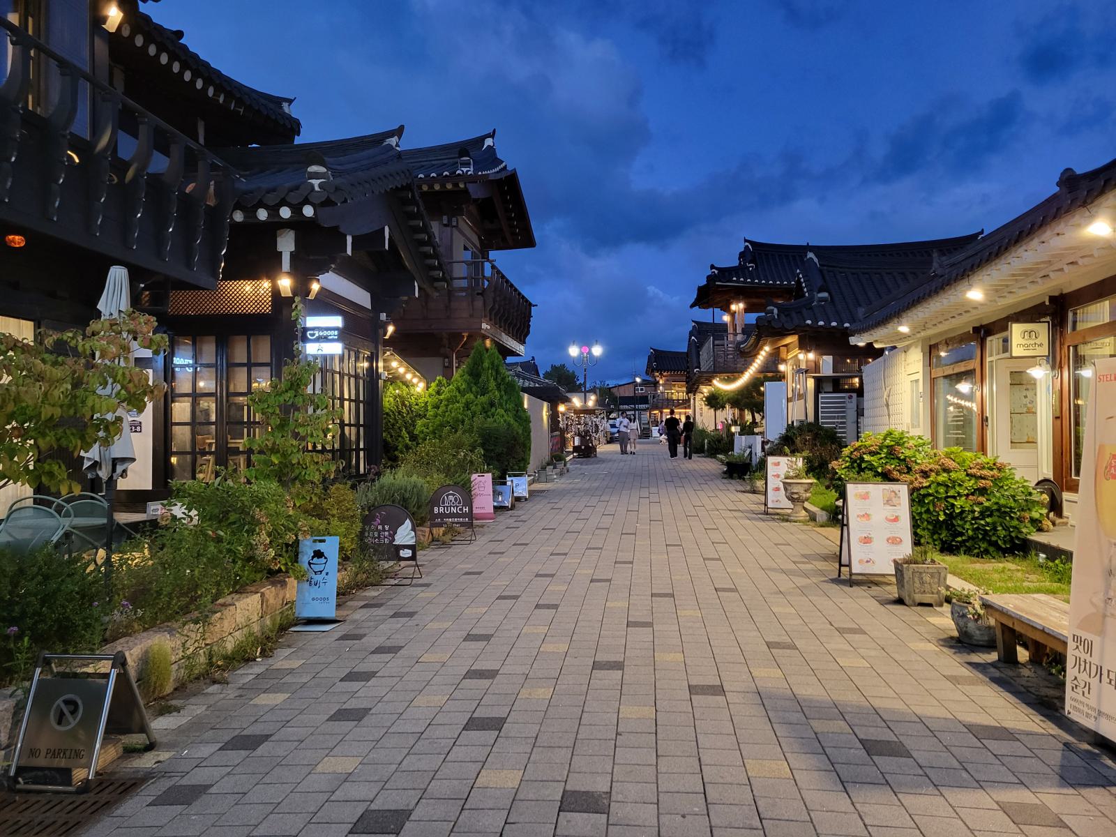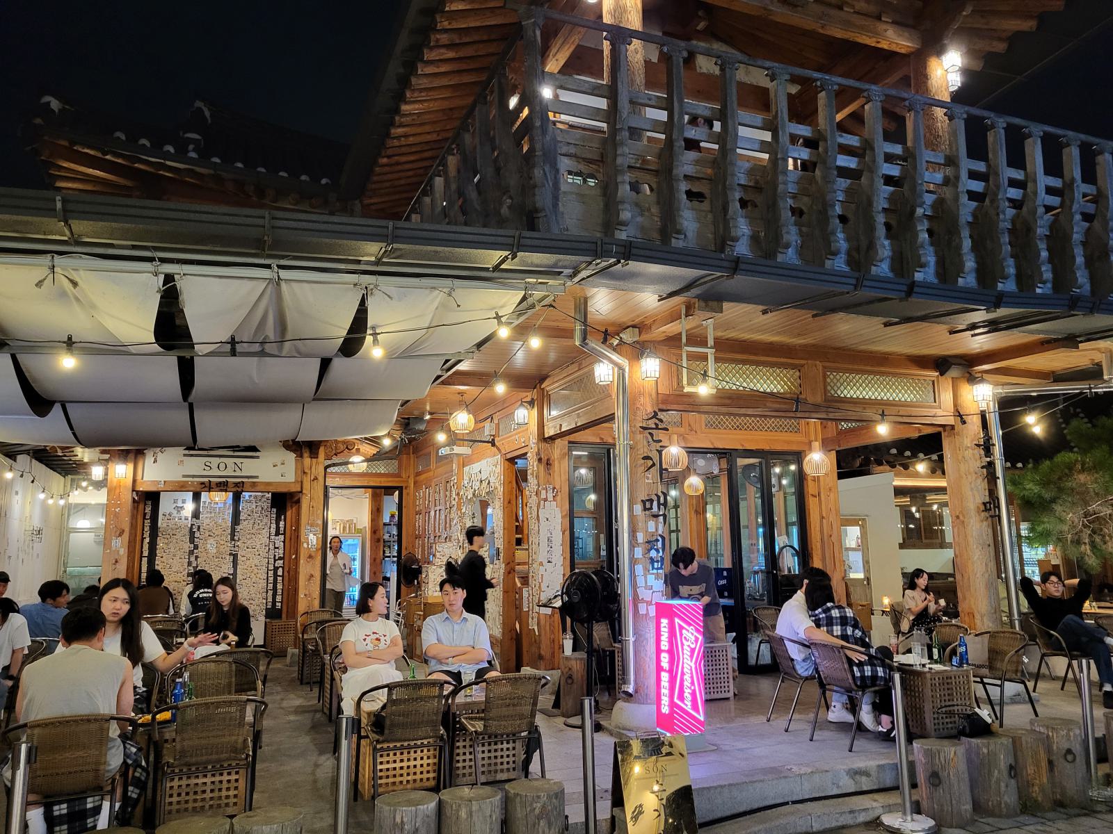 Ein paar Minuten entfernt beginnt das Touriviertel, wir wollten noch was Essen und machten uns auf den Weg. Am Sonntag Abend war hier natürlich ziemlich viel los, Gyeongju ist wegen seiner geschichtlichen Bedeutung ein beliebtes Reiseziel der Einheimischen. Die Straßen sind gesäumt von schicken neuen und alten Holzhäusern, die Restaurants, Bars und Souvinirgeschäfte beheimaten. Für einen Restaurantbesuch hatten wir zu lange im Garten gesessen und entschieden uns gleich für eine Kneipe.