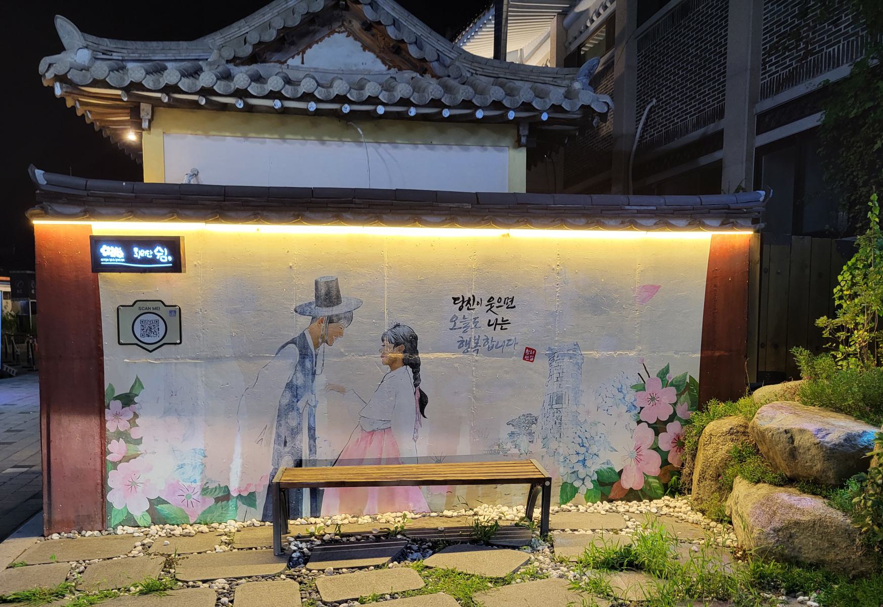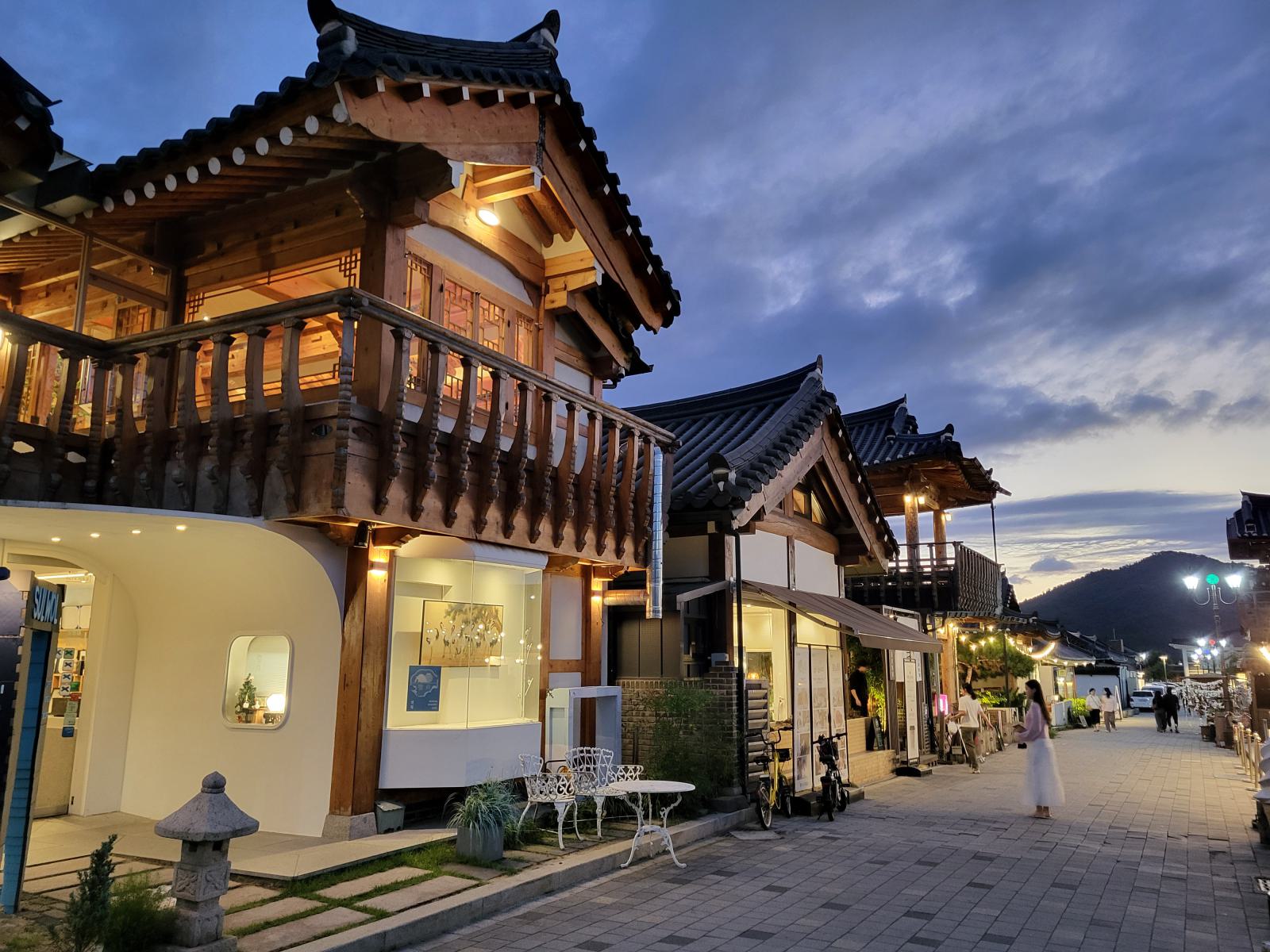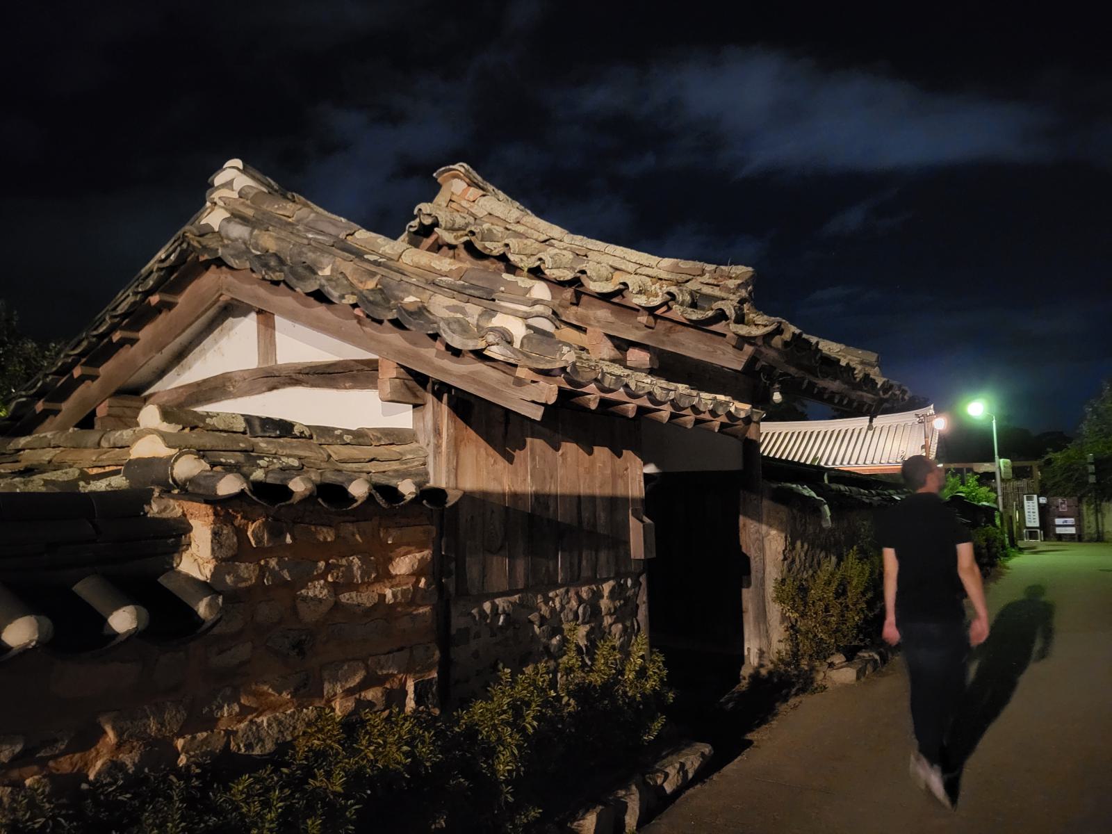 Ein paar Minuten entfernt beginnt das Touriviertel, wir wollten noch was Essen und machten uns auf den Weg. Am Sonntag Abend war hier natürlich ziemlich viel los, Gyeongju ist wegen seiner geschichtlichen Bedeutung ein beliebtes Reiseziel der Einheimischen. Die Straßen sind gesäumt von schicken neuen und alten Holzhäusern, die Restaurants, Bars und Souvinirgeschäfte beheimaten. Für einen Restaurantbesuch hatten wir zu lange im Garten gesessen und entschieden uns gleich für eine Kneipe.