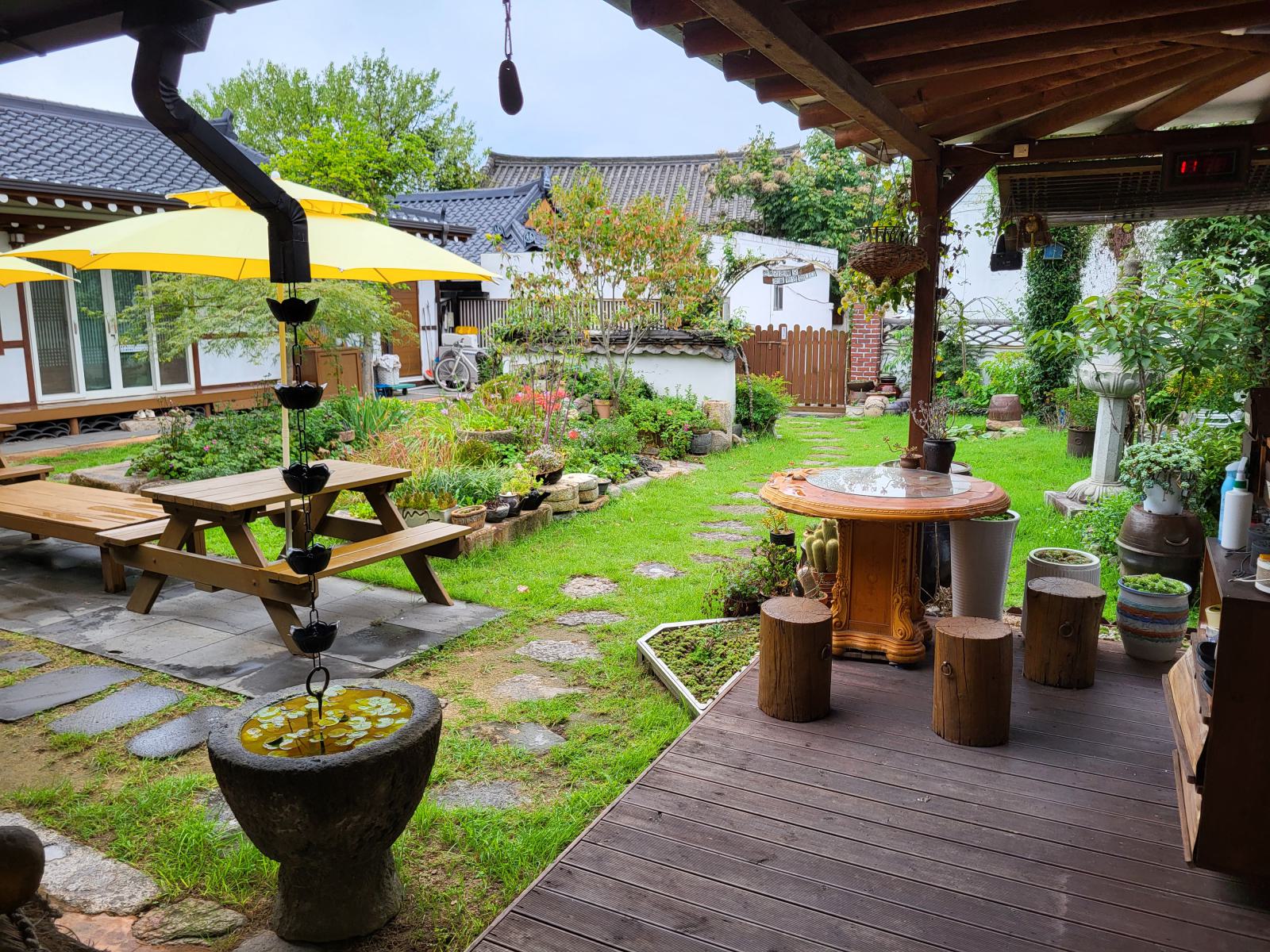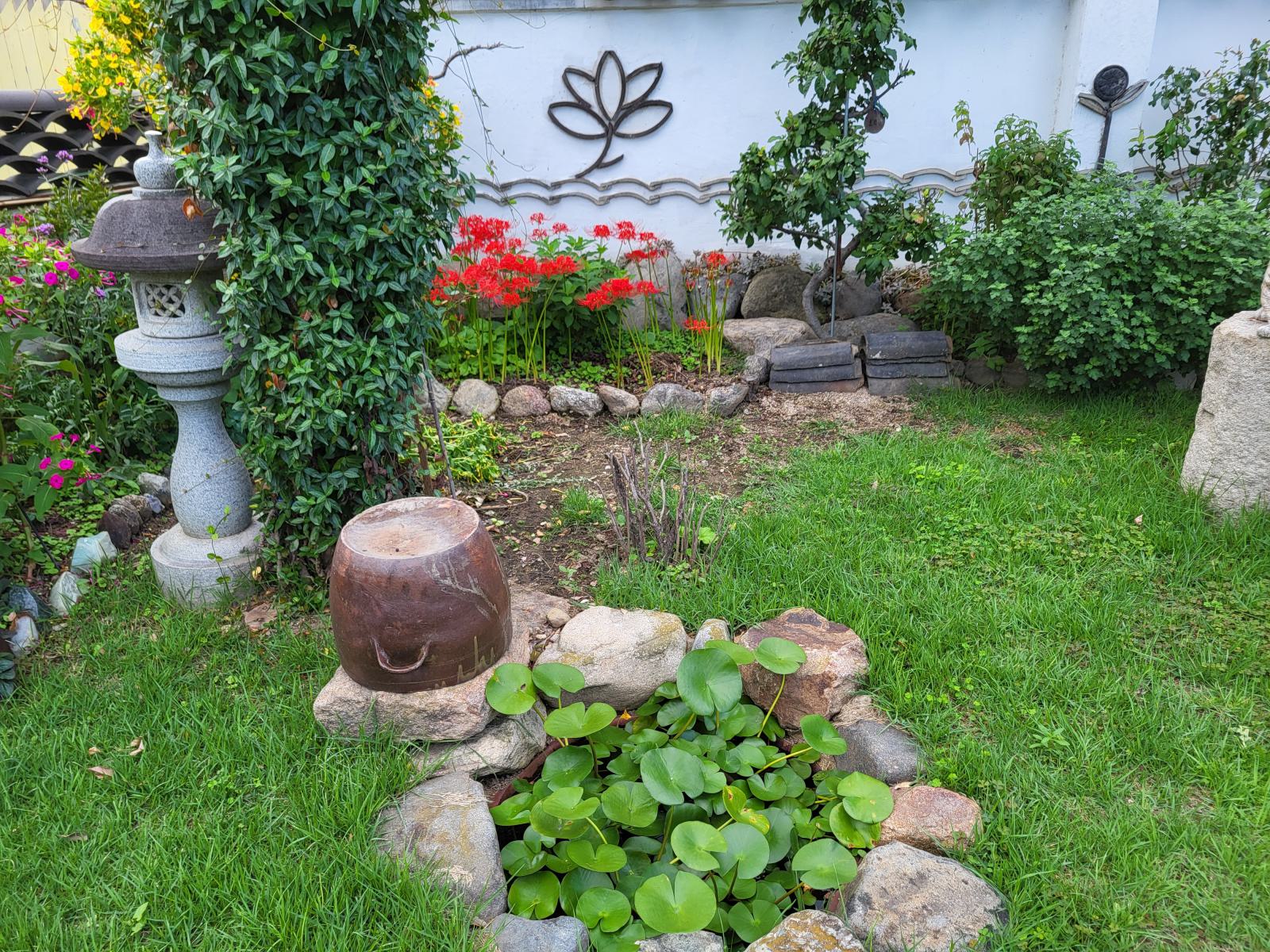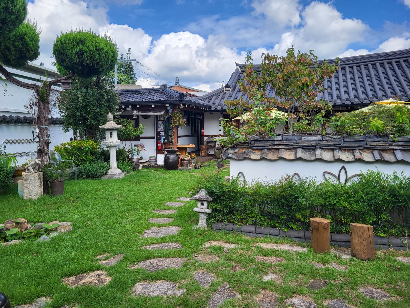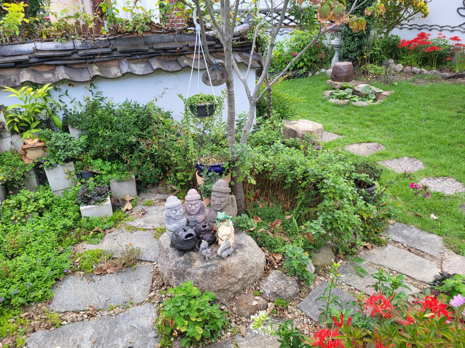 Draußen saßen wir zwischen Wildblumenbeeten, Seerosentümpeln, Steinfiguren und -laternen. Ab und zu kam die Besitzerin vorbei und erkundigte sich, ob es uns gefällt. Morgens stellte sie uns Obst und Toast mit Spam in die Küche, Koreaner haben eine seltsame Vorliebe für dieses Frühstücksfleisch.