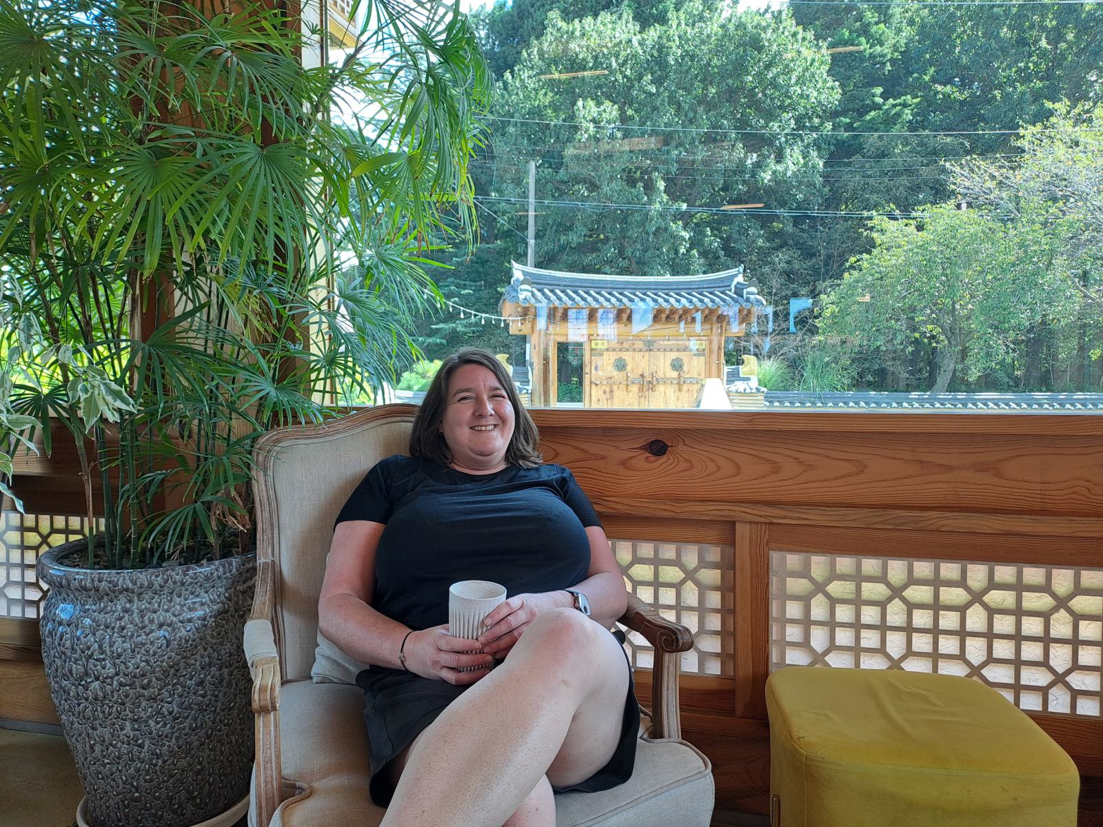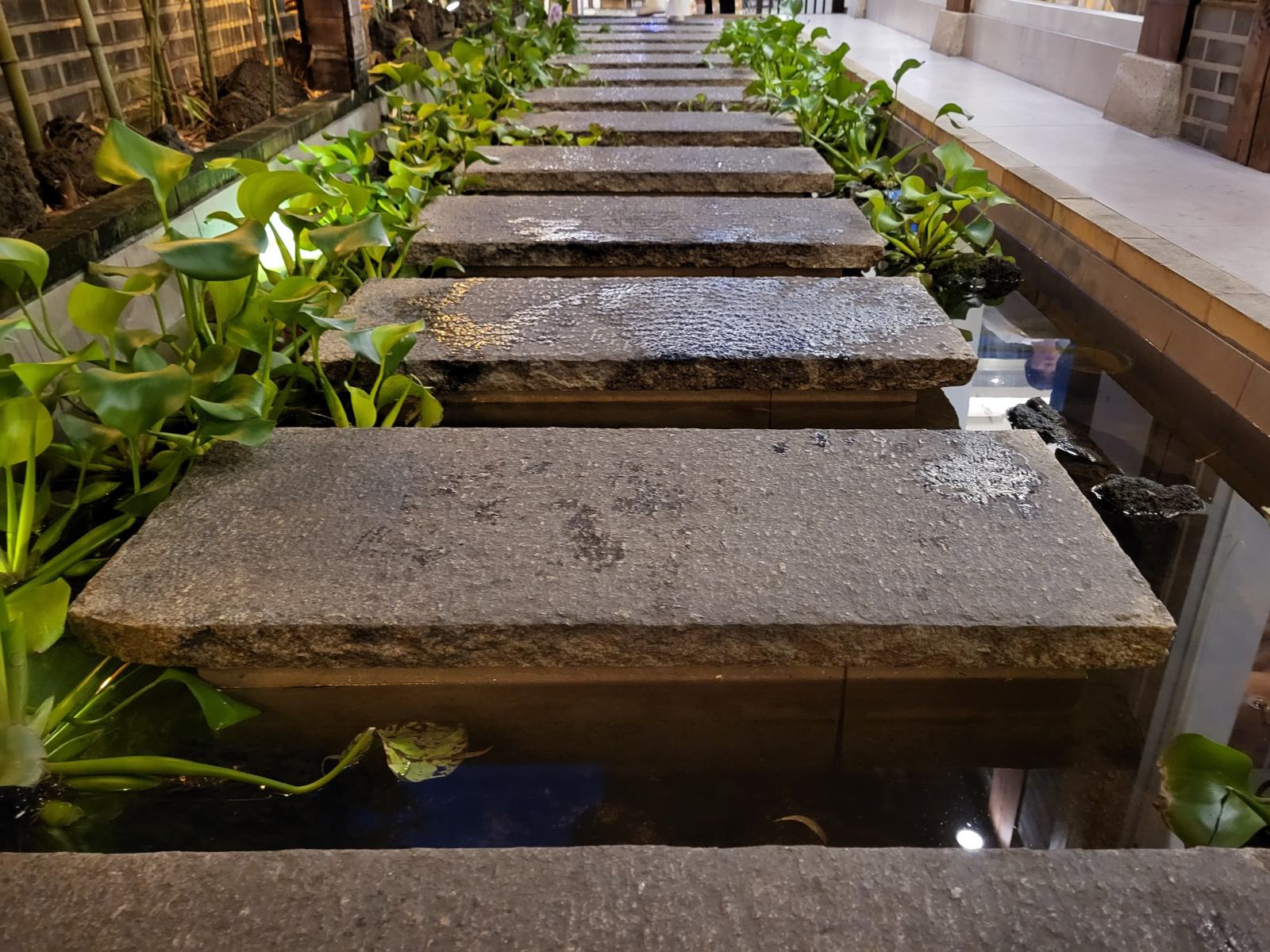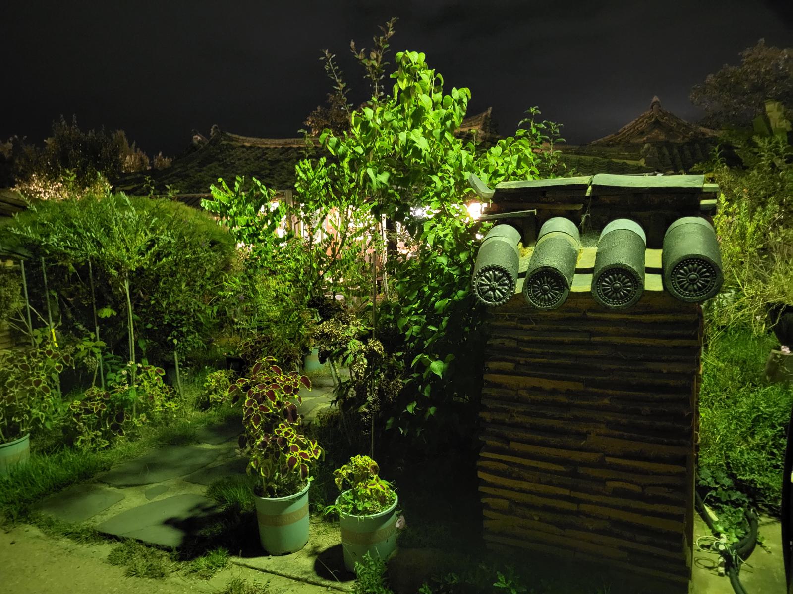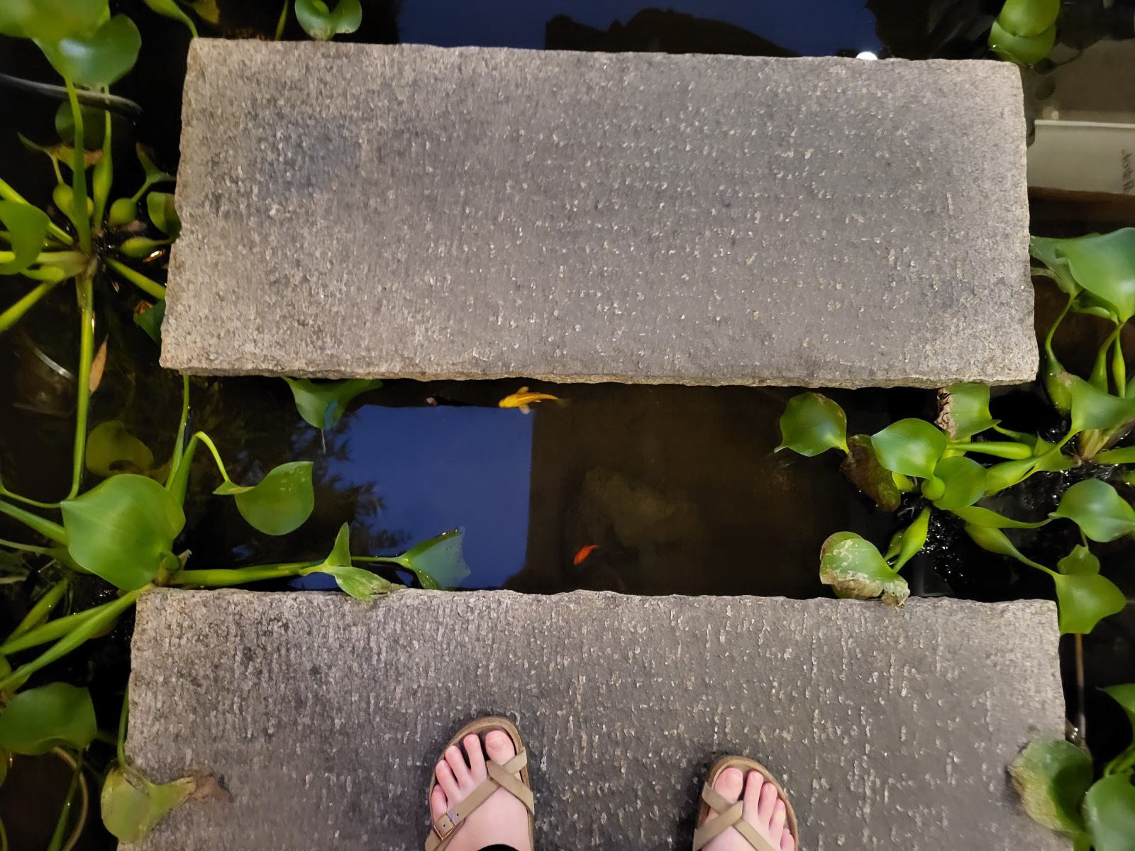 Draußen saßen wir zwischen Wildblumenbeeten, Seerosentümpeln, Steinfiguren und -laternen. Ab und zu kam die Besitzerin vorbei und erkundigte sich, ob es uns gefällt. Morgens stellte sie uns Obst und Toast mit Spam in die Küche, Koreaner haben eine seltsame Vorliebe für dieses Frühstücksfleisch.