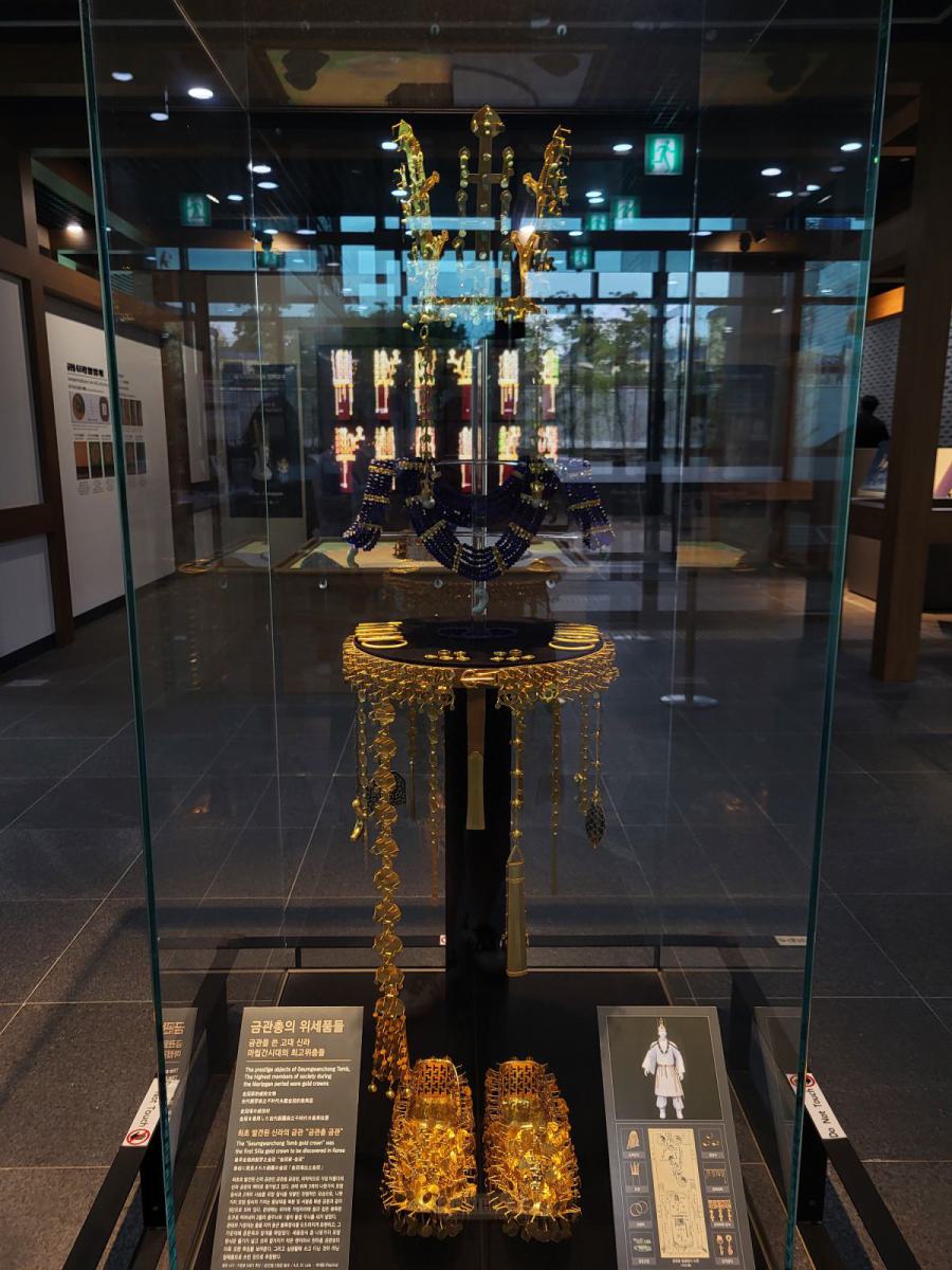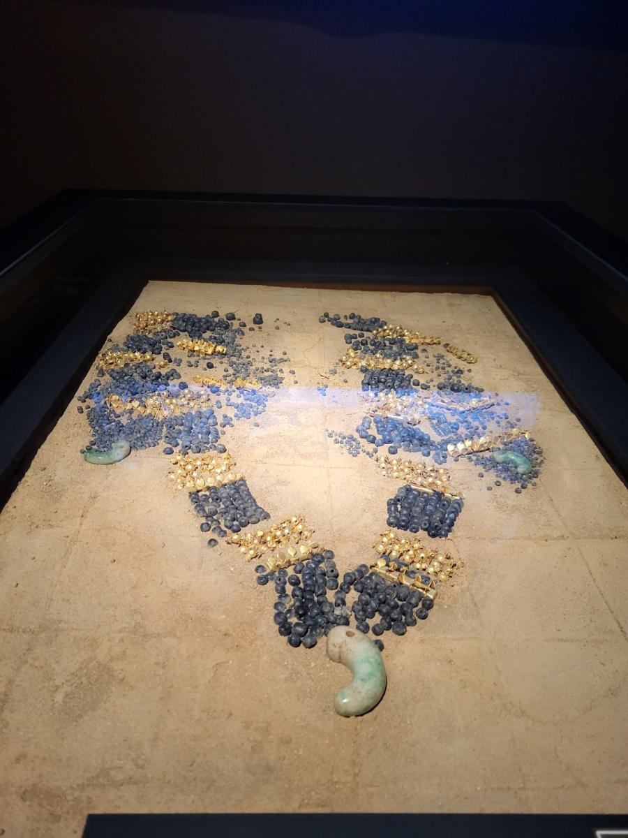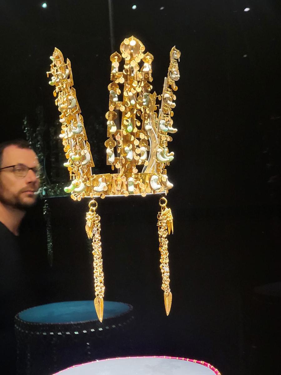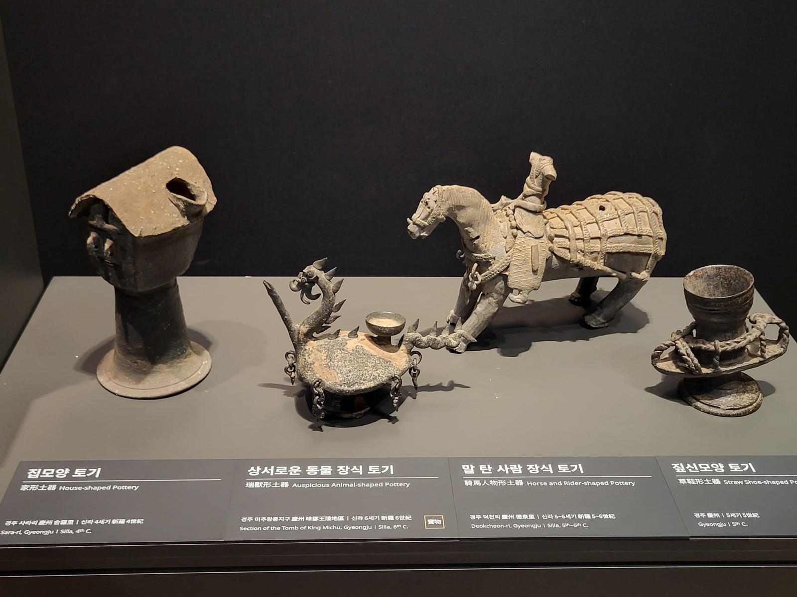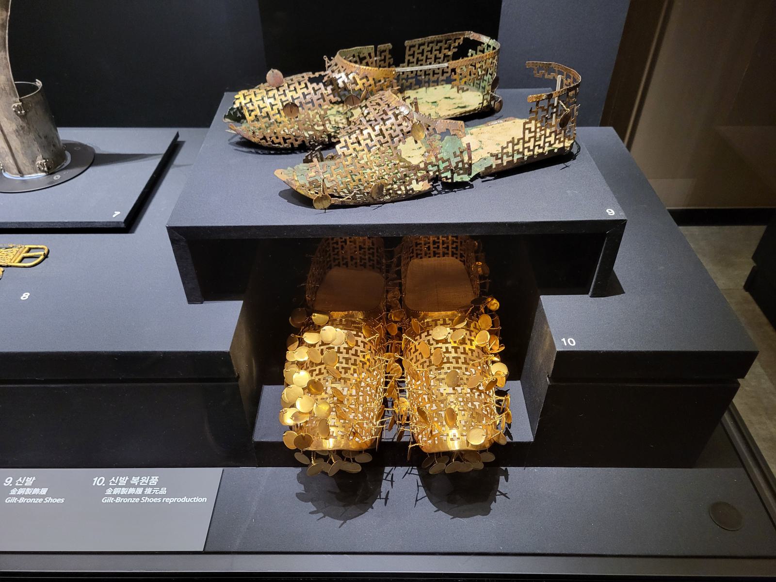Dann kamen wir zu den wahnsinnig eindrucksvollen Grabbeigaben, goldene Kronen und Schuhe, allerlei Schmuck, Figuren und Lampen. Über die tausend Jahre kam davon eine Menge zusammen. Durchweg beliebt war das Entenmotiv, das einem Pferd ähnelte. Außerdem gab es ein paar exotische Beigaben, die über die Seidenstraße gekommen waren, darunter hauptsächlich Glas aus Europa.