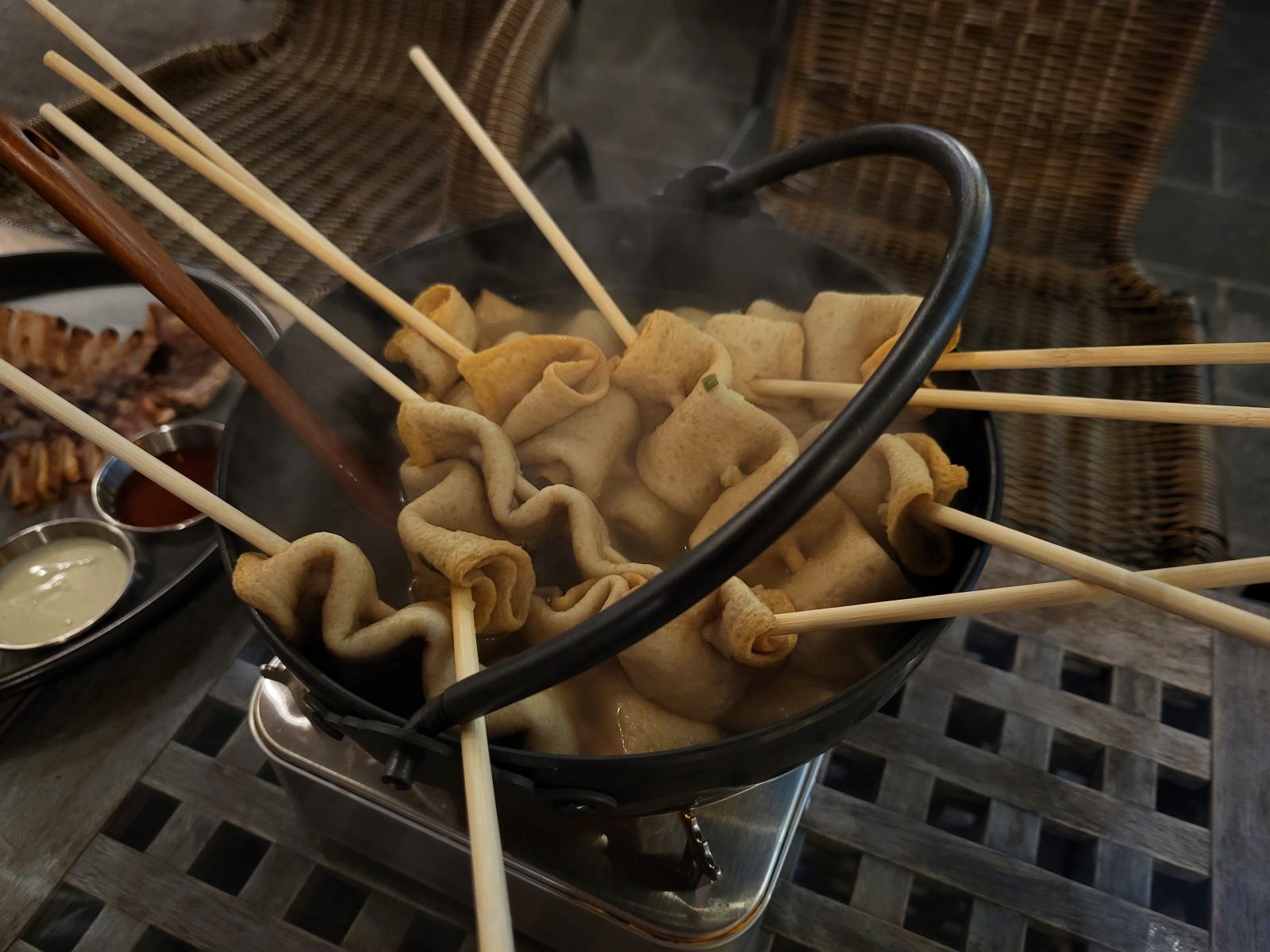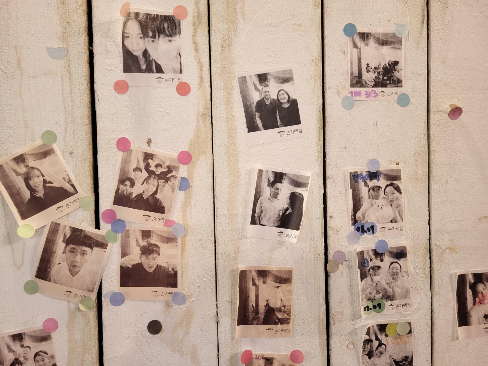 Das Kneipenessen steht Restaurantessen qualitativ in nichts nach. Wir bestellten halbgetrockneten Tintenfisch mit Knoblauchsauce und einen Topf Fishcake. Nur die Pommes mit Käse-Buttercreme und Knoblauchpulver waren etwas fragwürdig. Aus dem halboffenen Untergeschoss konnten wir das Treiben auf der Straße beobachten und wurden außerdem Teil des Ladens. Um die Kamera mit Aufkleberdrucker kamen wir nicht herum, das war dem Kellner wichtig. Wir könnten den Aufkleber auch mit nach Hause nehmen, aber es wäre ihm lieber, wenn wir ihn an die Wände zu denen der anderen Gäste kleben würden.