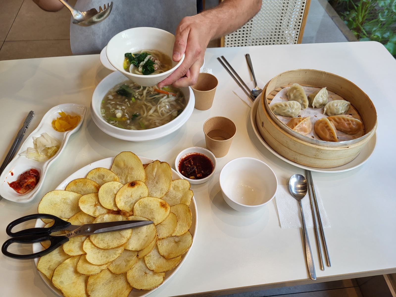 Am Abend starteten wir den dritten Versuch mit dem Nudellokal und wurden sofort freudig reingewunken. Ja, das war hier schon sehr lecker, wir bestellten eine große Suppe, Teigtaschen mit Kimchi und knusprigen Kartoffelauflauf. Dann erkundeten wir die Sehenswürdigkeiten der Stadt bei Nacht, ein ganz anderes Erlebnis.