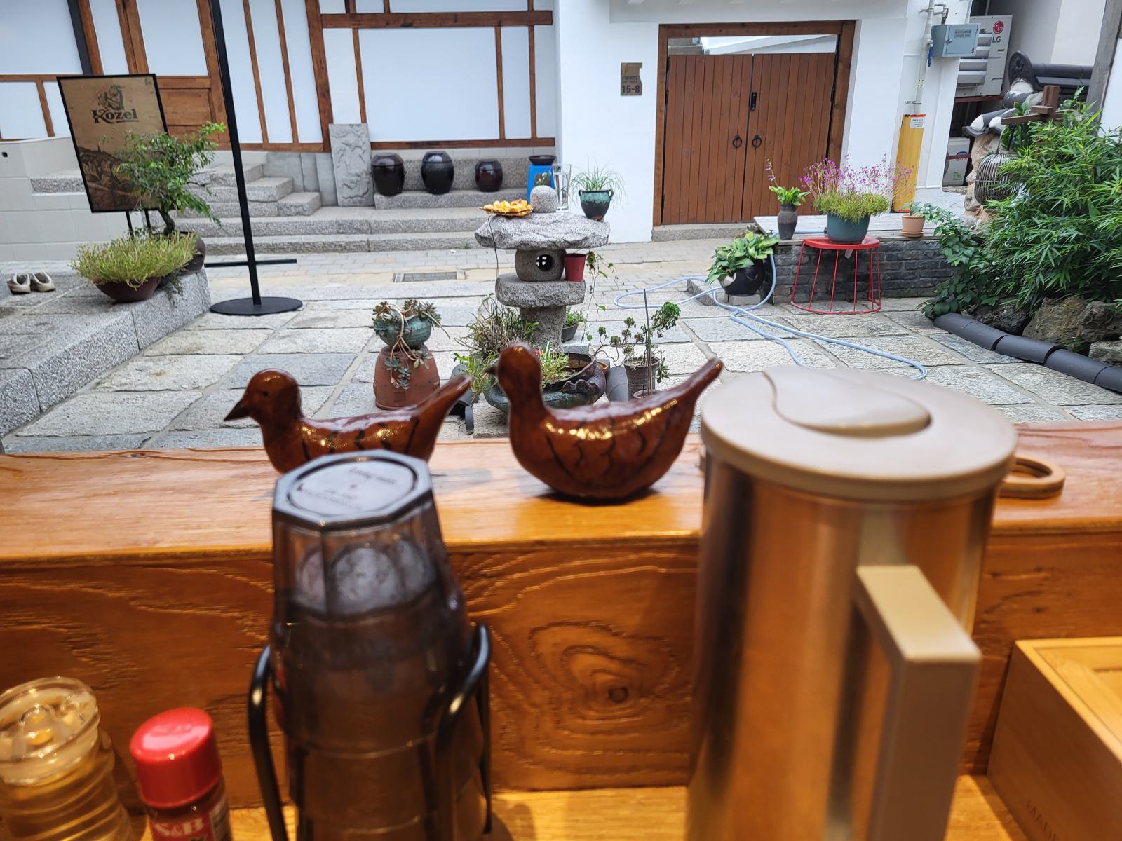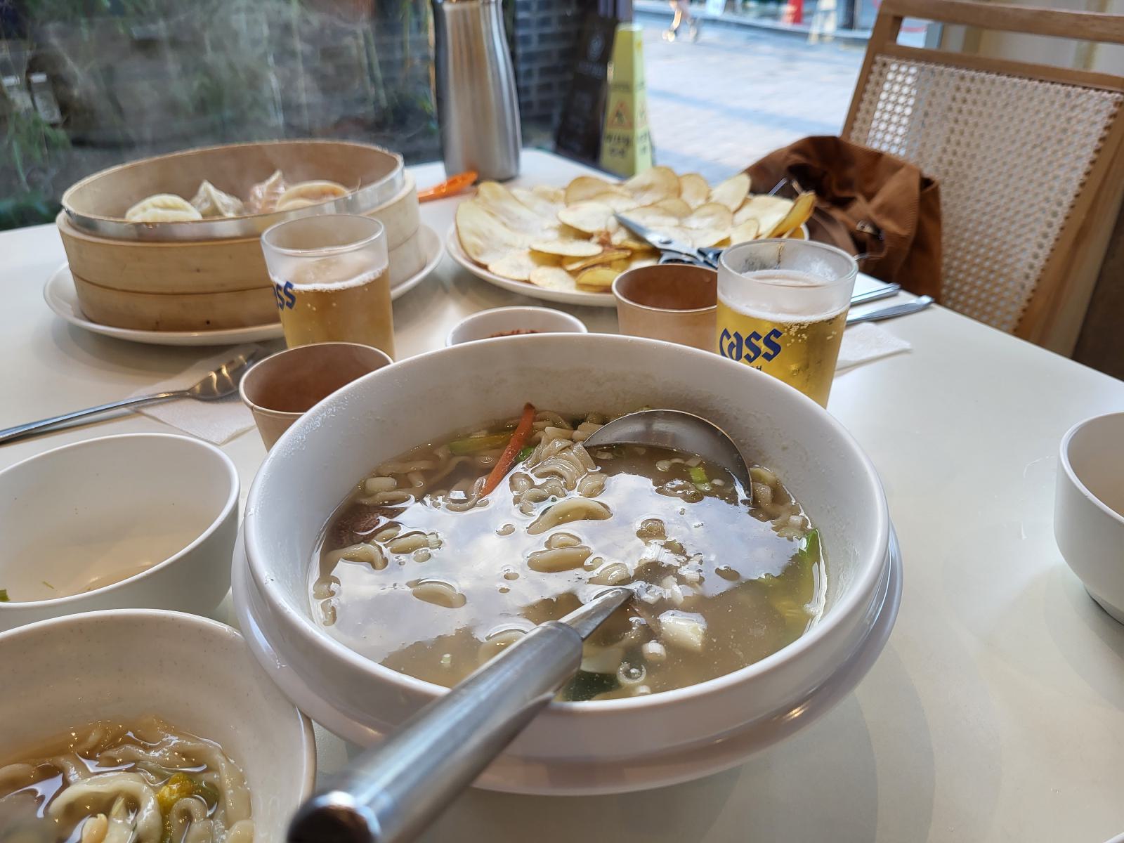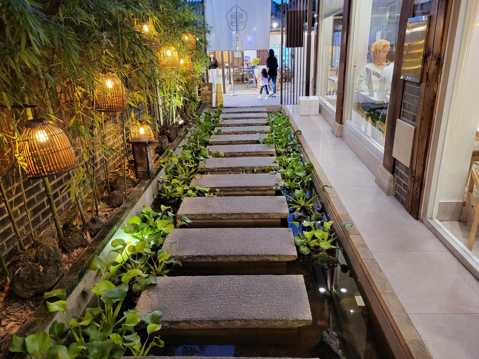 Schon wieder Zeit zum Essen. Gestern Abend hatten wir uns an einem Nudellokal versucht, keine Chance, selbst die Warteschlange war ausgebucht. Heute sollten 6 Tische vor uns dran kommen. Also entschieden wir uns für einen idyllischen Ramenladen, wo wir unsere Suppe im Fenster essen konnten. Dann schlenderten wir durch die verworrenen Gassen der Altstadt zurück zum Hanok und und ließen den Abend mit Grillenzirpen und Makgeolli im Garten ausklingen.