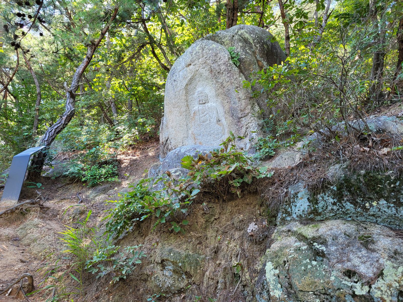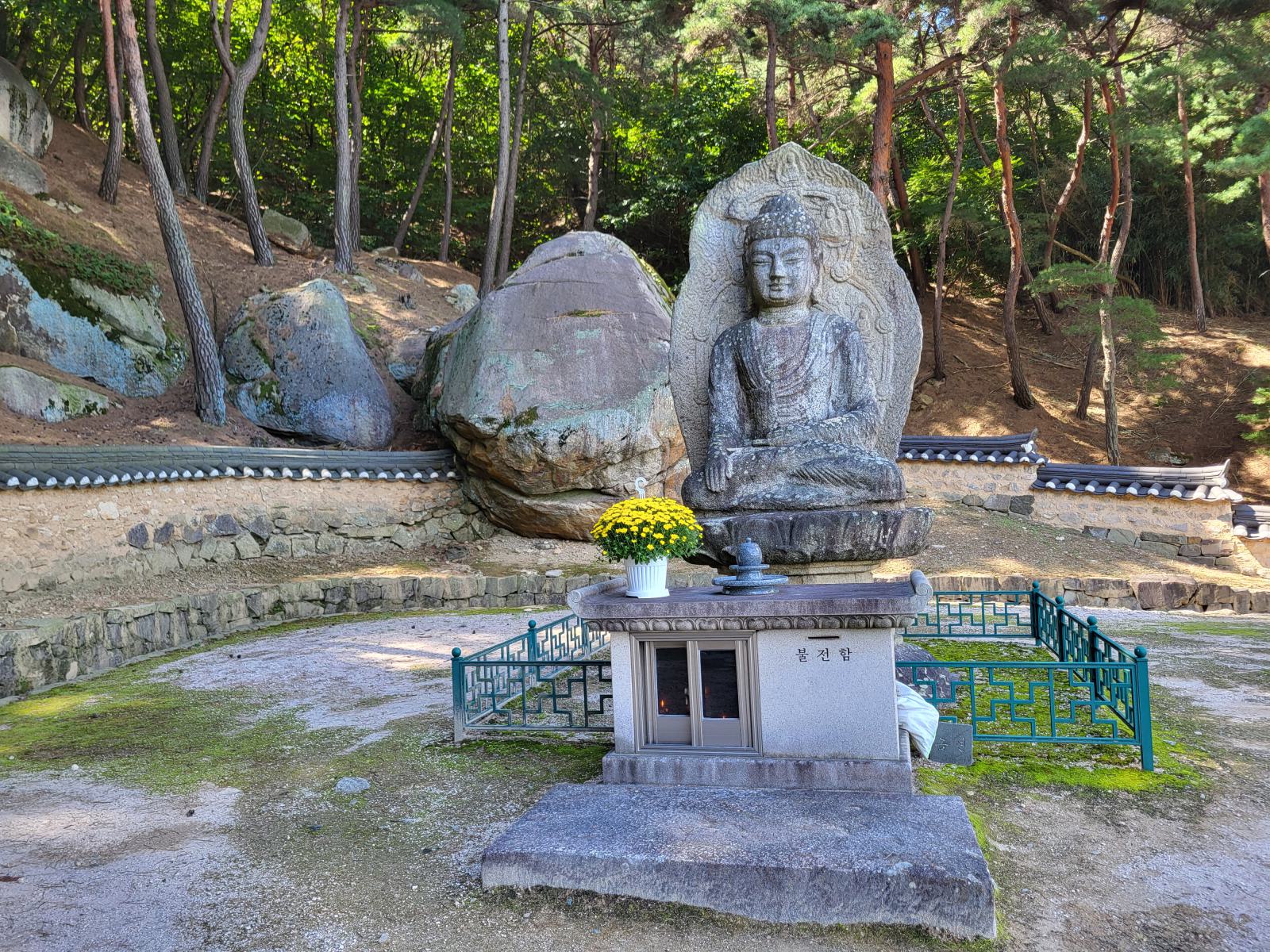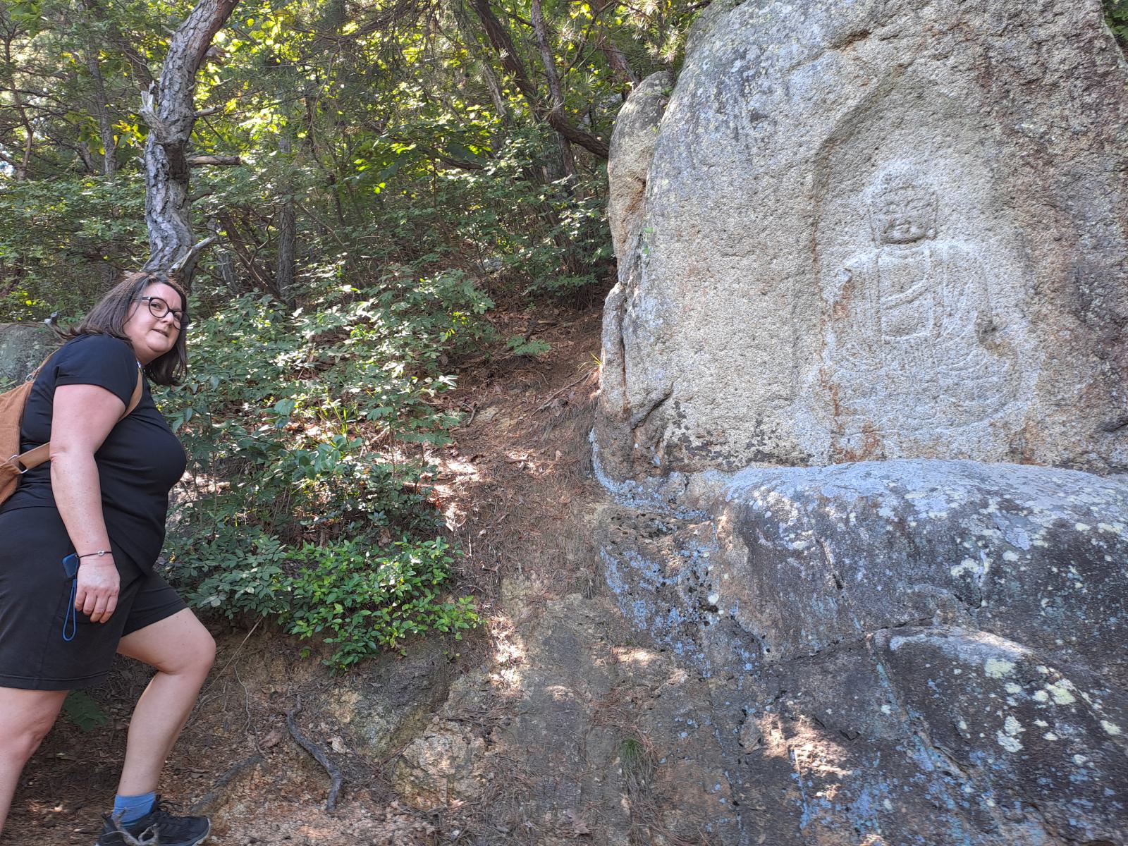Von den alten Buddhas im Museum neugierig geworden, wollten wir uns die spirituellen Orte in den umliegenden Bergen ansehen. Mit dem Bus fuhren wir zum Fuß des Namsan und stiegen im Nirgendwo zwischen Reisfeldern und Gewächshäusern aus. Hinter einem kleinen Bauerndorf mit Kürbisfeldern und rustikalen Häusern ging es steil den Berg hoch, ein Steinbuddha war dort ausgeschildert. Oben angekommen wunderten wir uns, um den Buddha herum war eine idyllische Tempelanlage gebaut wurden, in der wir die Skulptur ganz oben zwischen großen Felsen fanden. Von hier hatten wir eine wahnsinns Aussicht auf Berge und grüne Felder.