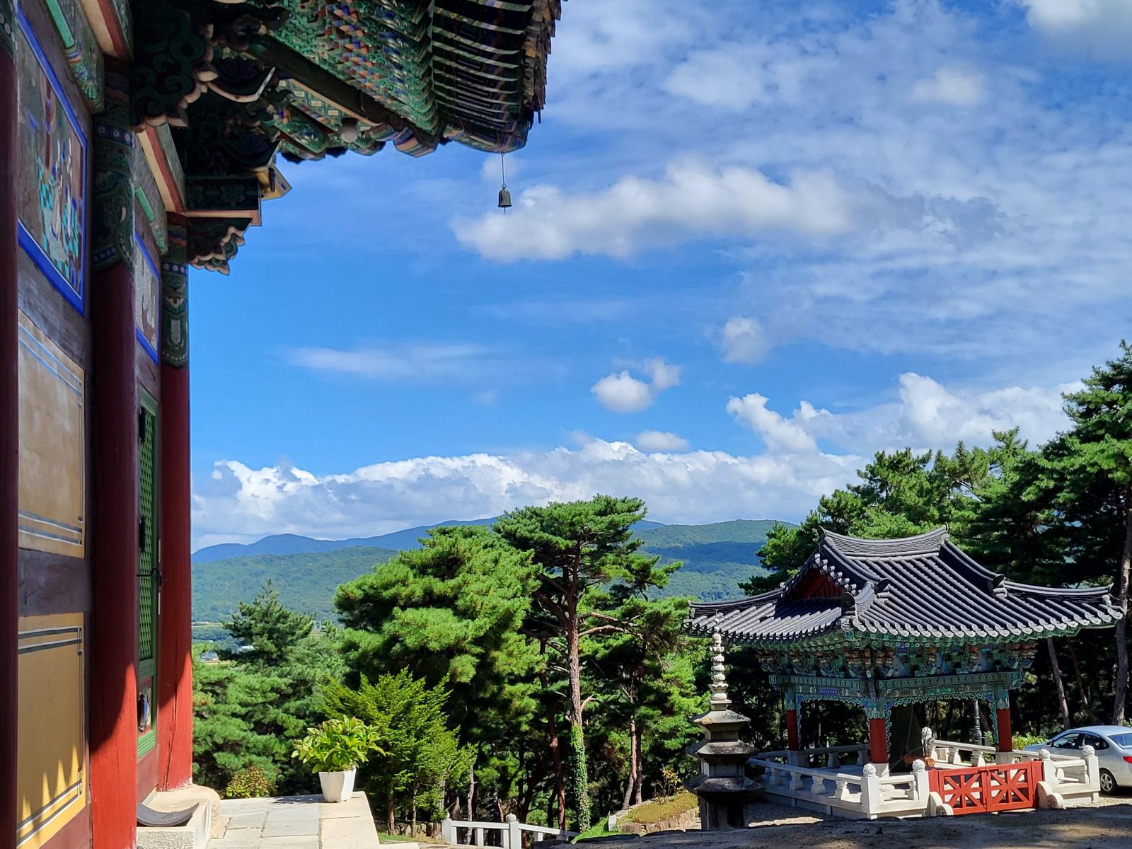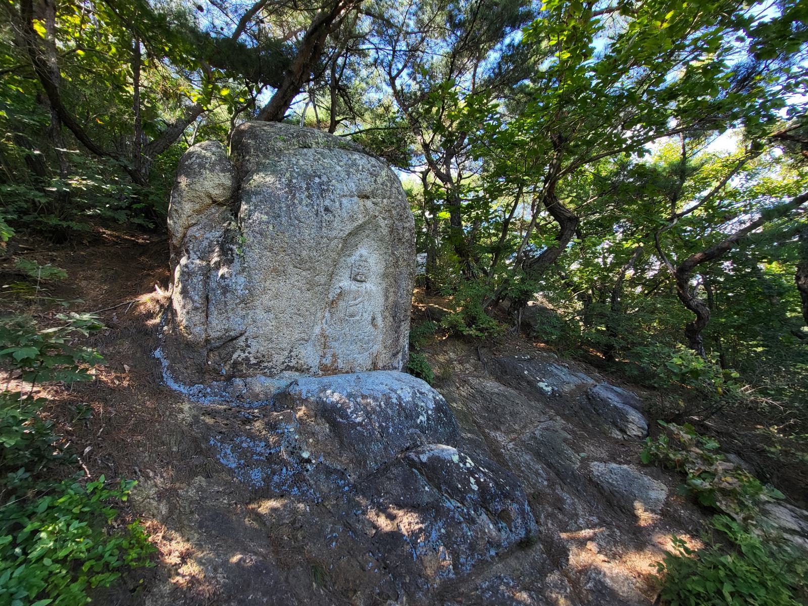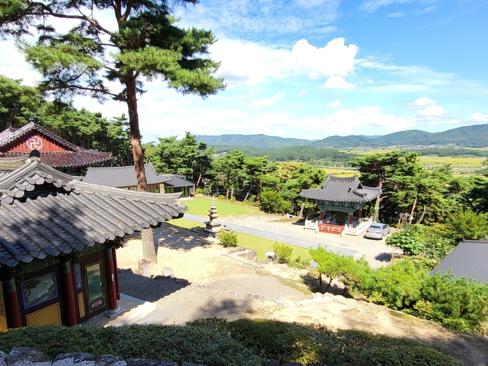 Von den alten Buddhas im Museum neugierig geworden, wollten wir uns die spirituellen Orte in den umliegenden Bergen ansehen. Mit dem Bus fuhren wir zum Fuß des Namsan und stiegen im Nirgendwo zwischen Reisfeldern und Gewächshäusern aus. Hinter einem kleinen Bauerndorf mit Kürbisfeldern und rustikalen Häusern ging es steil den Berg hoch, ein Steinbuddha war dort ausgeschildert. Oben angekommen wunderten wir uns, um den Buddha herum war eine idyllische Tempelanlage gebaut wurden, in der wir die Skulptur ganz oben zwischen großen Felsen fanden. Von hier hatten wir eine wahnsinns Aussicht auf Berge und grüne Felder.