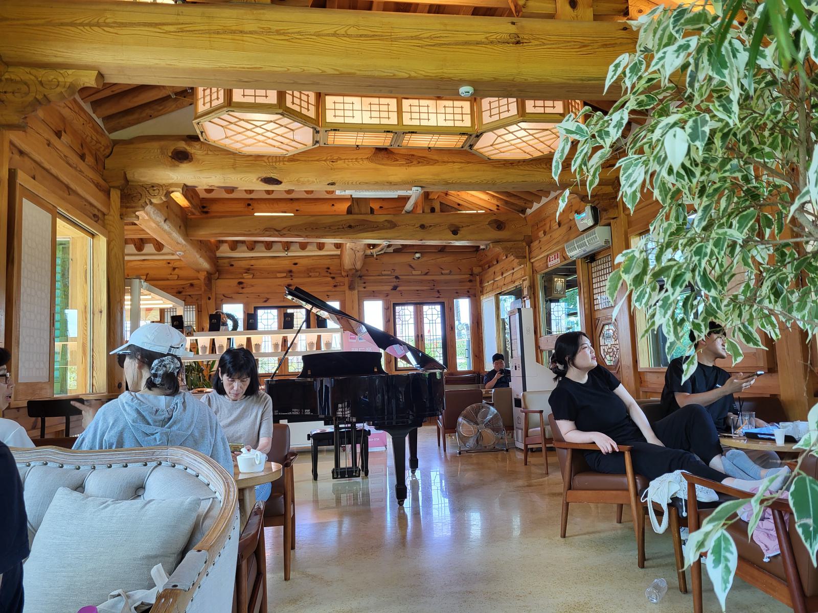 Jetzt hatten wir uns eine Pause verdient und, wie praktisch, an der Bushaltestelle gab es ein einsames Café. Drin warteten gemütliche alte Couchen, klassischer Musik und Eiskaffee vor großen Fenstern mit Blick auf Reis und Wald.