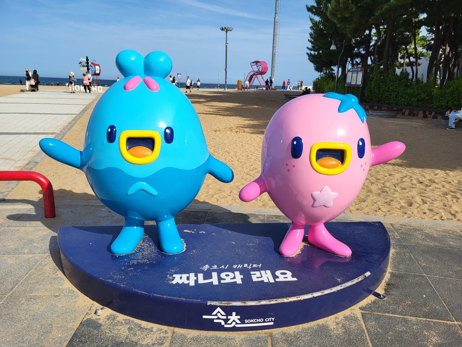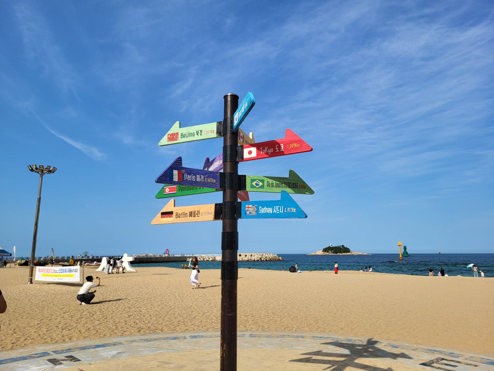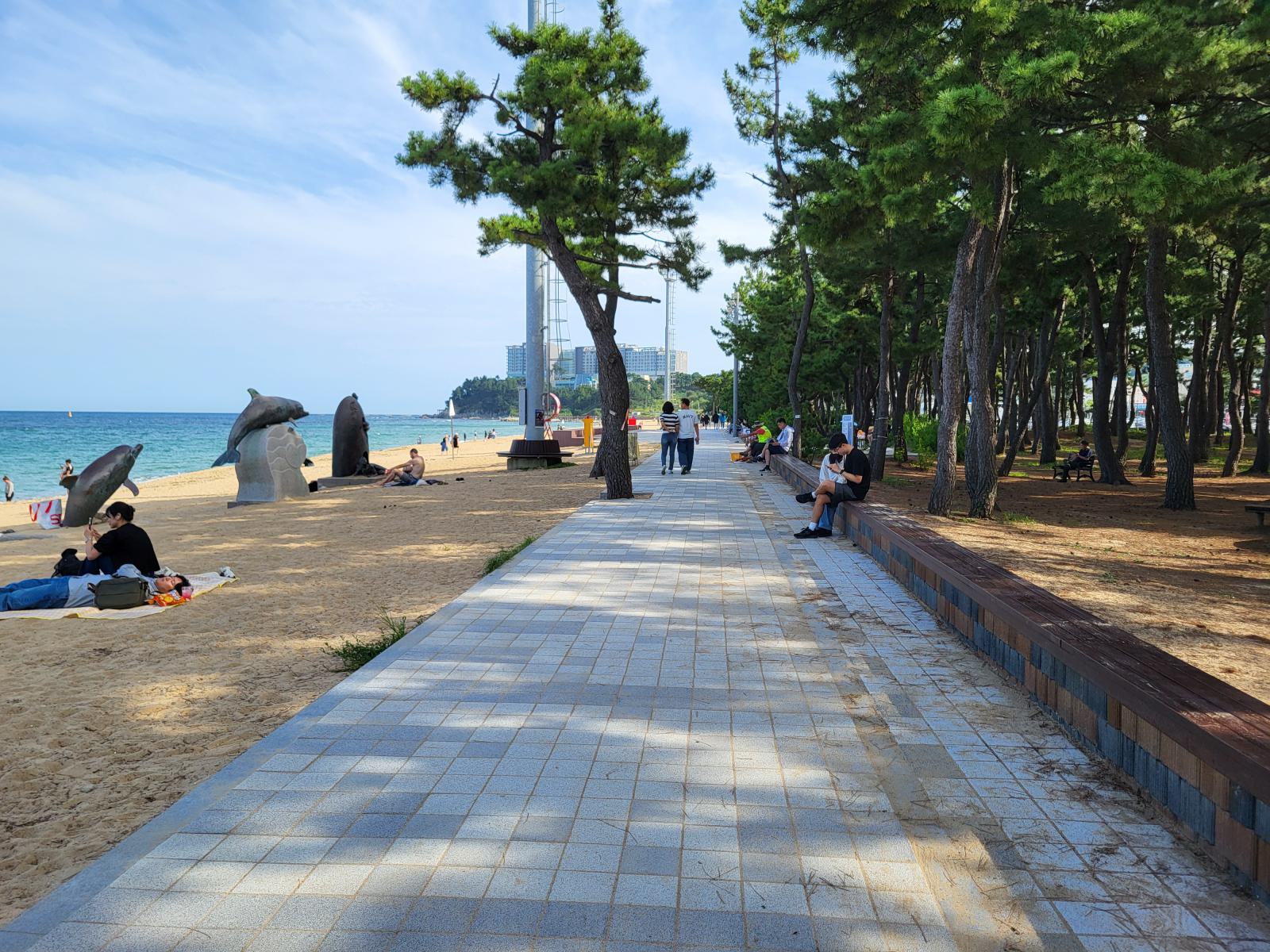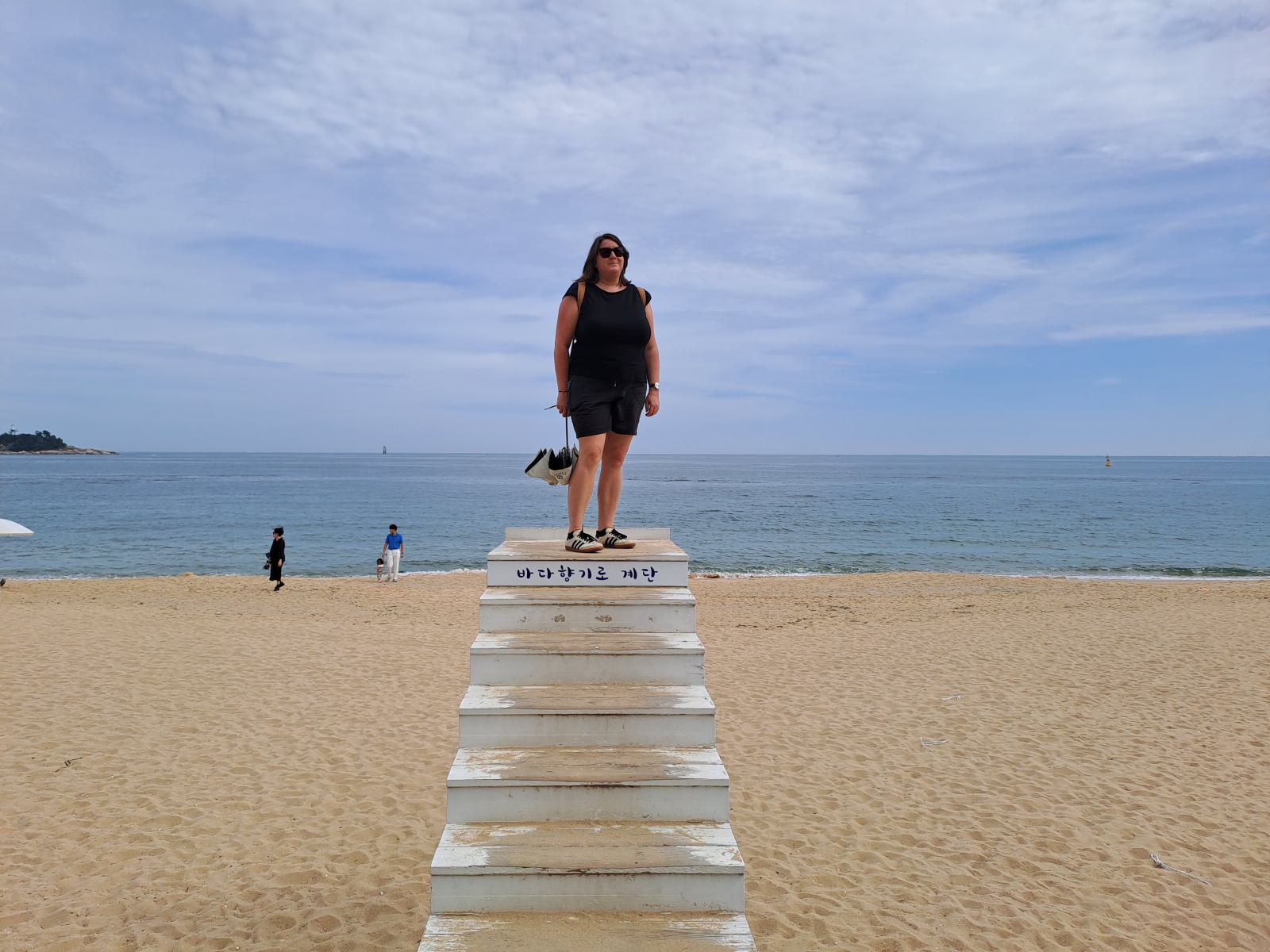 Bevor unser Bus am nächsten Tag nach Busan fuhr, hatten wir noch etwas Zeit für einen weiteren Spaziergang zwischen Sandstrand und Pinienwäldchen und um die vielen Skulpturen im Sand anzuschauen. Wir tarnten uns mit Sonnenschirm als Einheimische. Am Ende der Promenade wird der Strand felsiger und ein Holzsteg führt weiter am Wasser entlang.