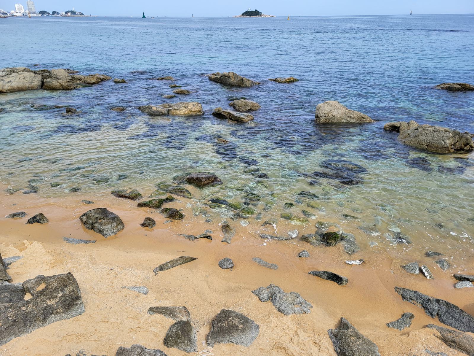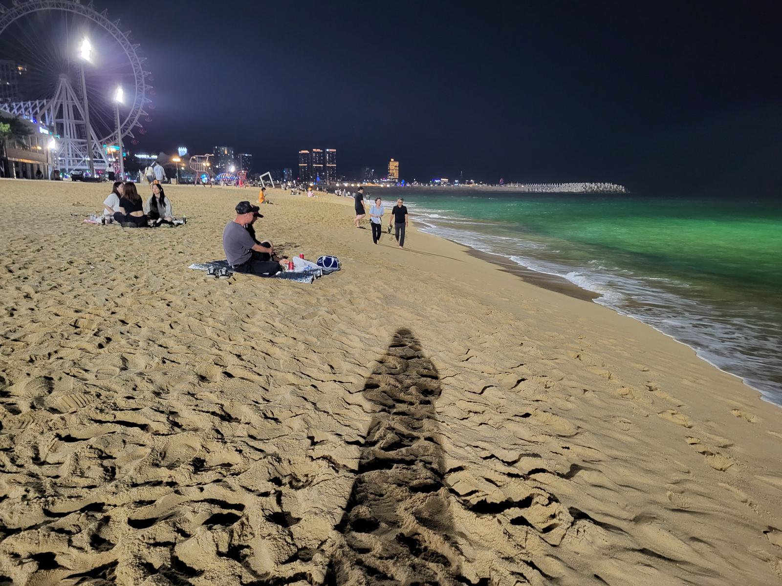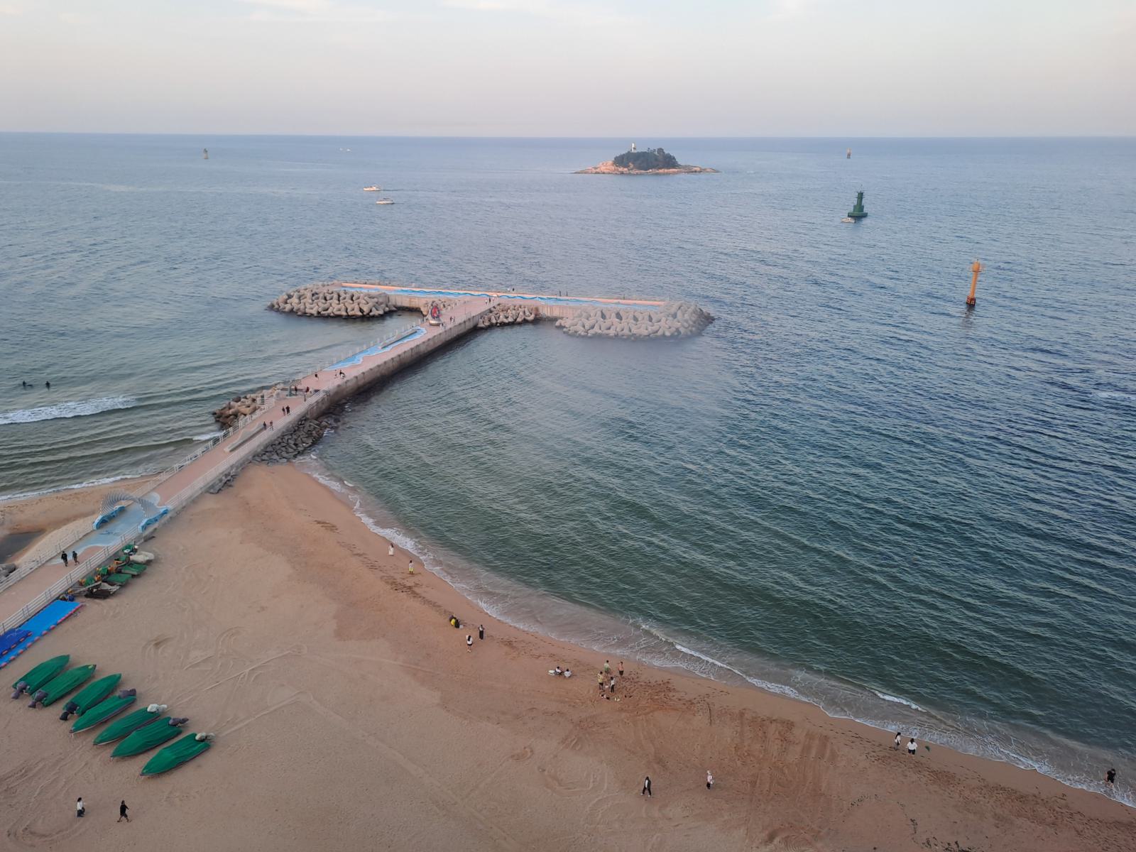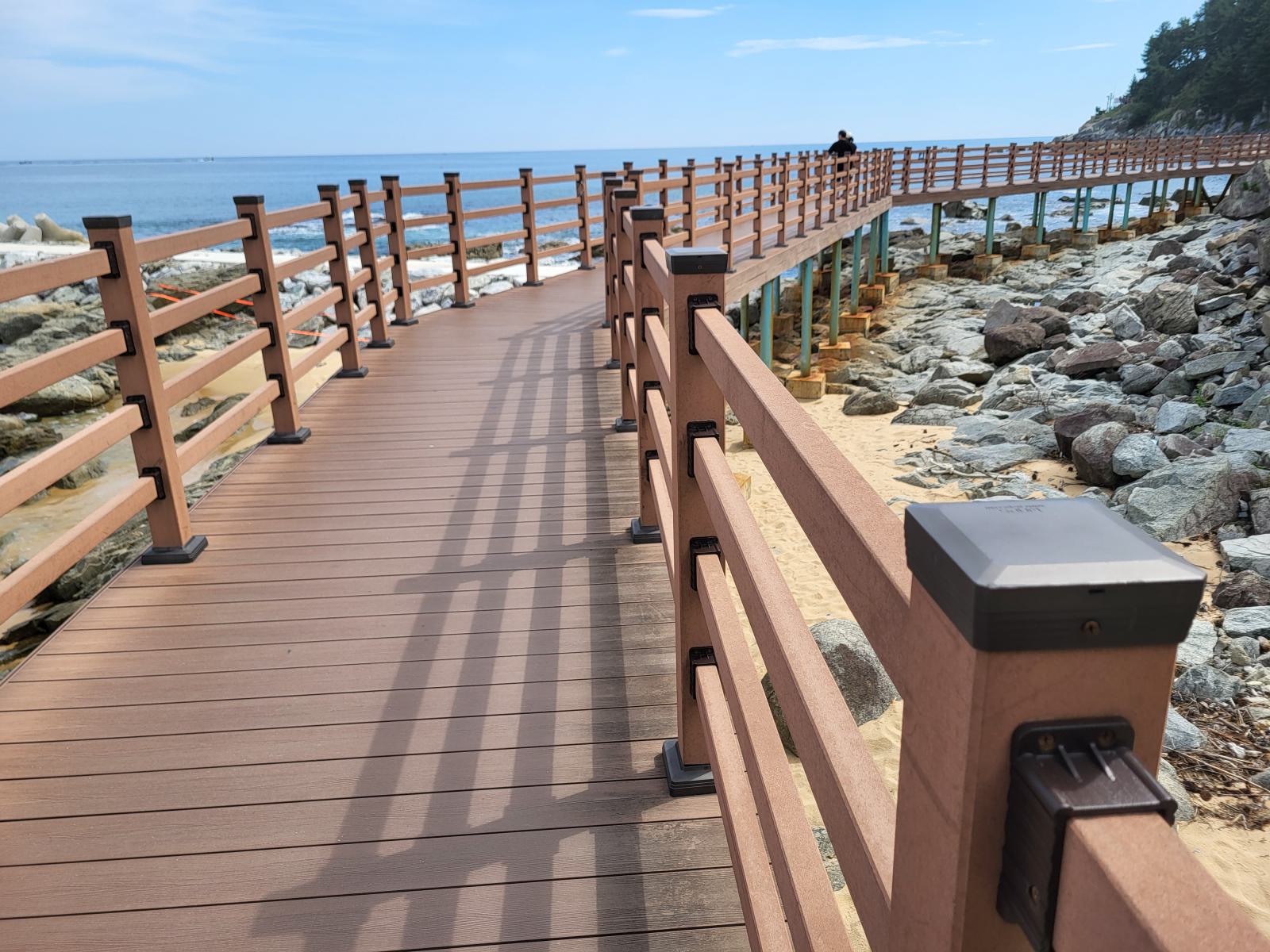 Bevor unser Bus am nächsten Tag nach Busan fuhr, hatten wir noch etwas Zeit für einen weiteren Spaziergang zwischen Sandstrand und Pinienwäldchen und um die vielen Skulpturen im Sand anzuschauen. Wir tarnten uns mit Sonnenschirm als Einheimische. Am Ende der Promenade wird der Strand felsiger und ein Holzsteg führt weiter am Wasser entlang.