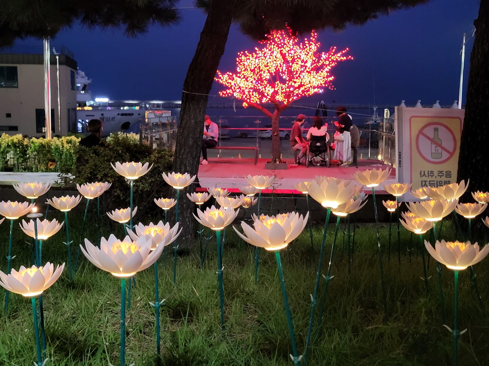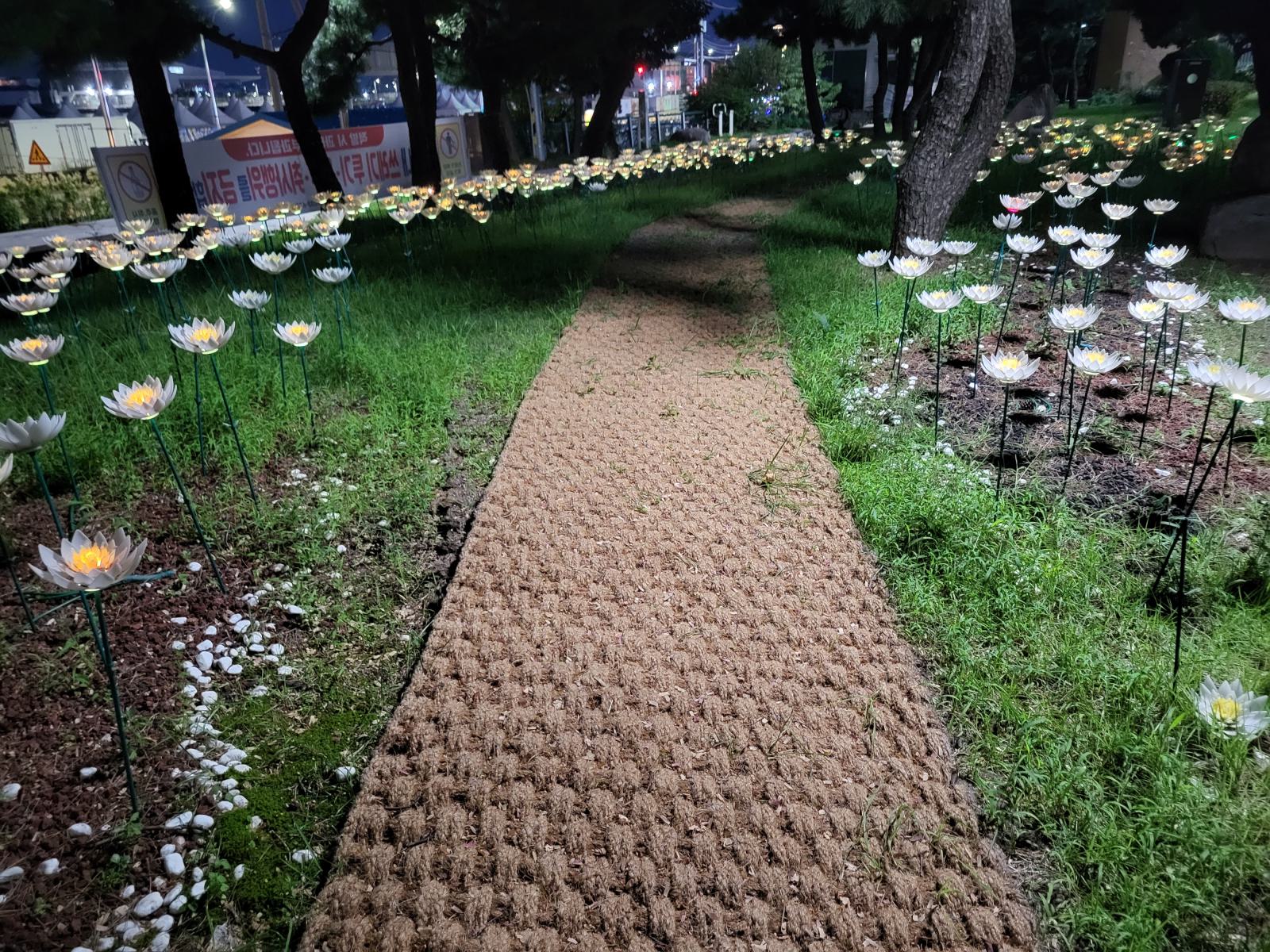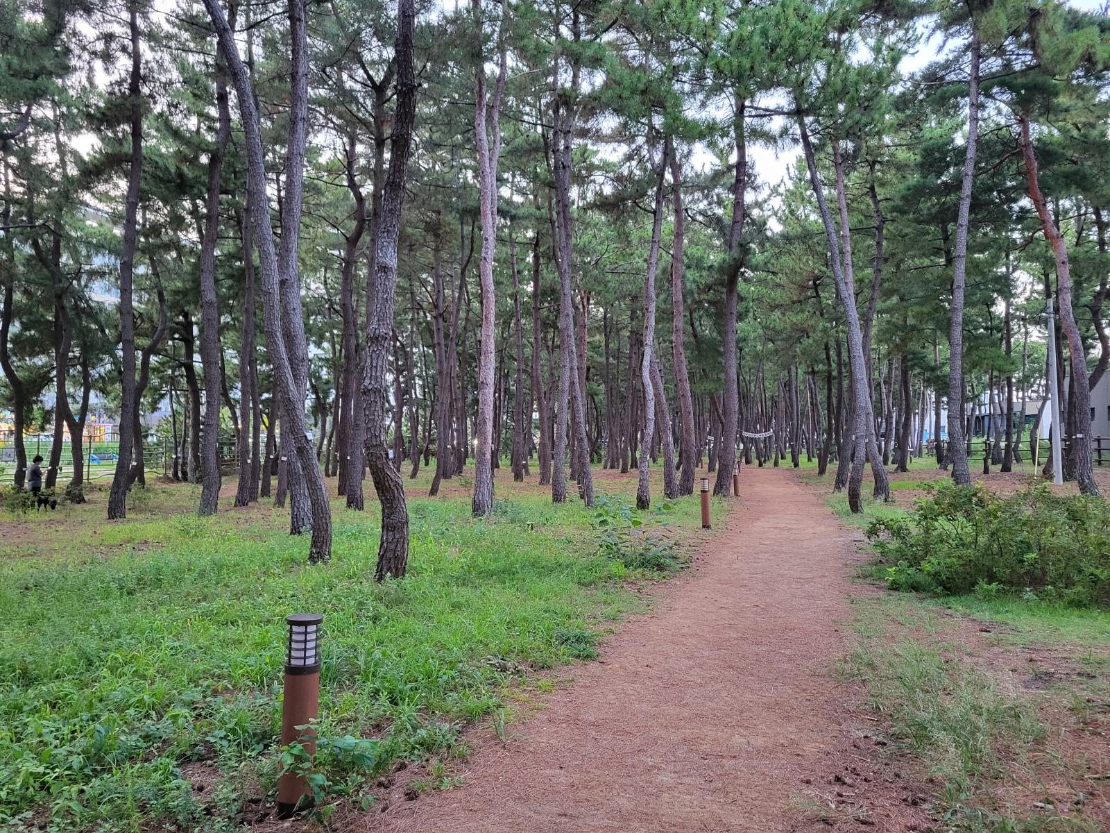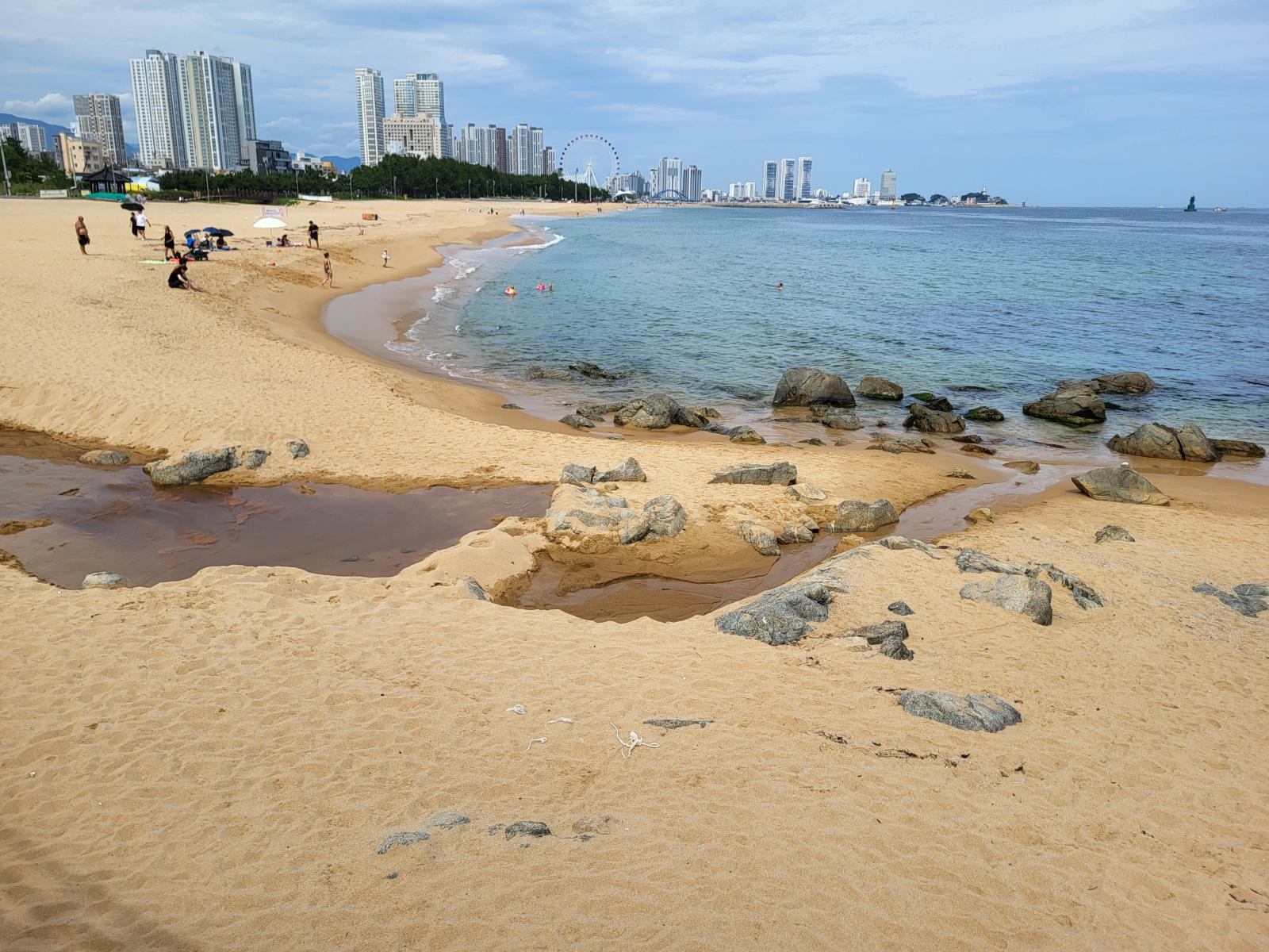 Bevor unser Bus am nächsten Tag nach Busan fuhr, hatten wir noch etwas Zeit für einen weiteren Spaziergang zwischen Sandstrand und Pinienwäldchen und um die vielen Skulpturen im Sand anzuschauen. Wir tarnten uns mit Sonnenschirm als Einheimische. Am Ende der Promenade wird der Strand felsiger und ein Holzsteg führt weiter am Wasser entlang.