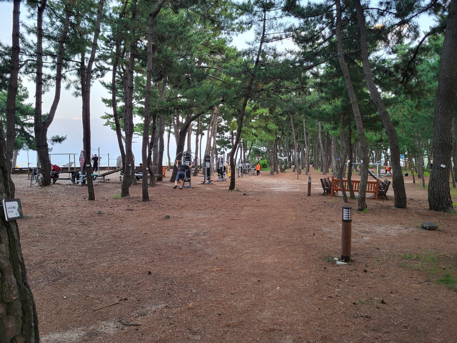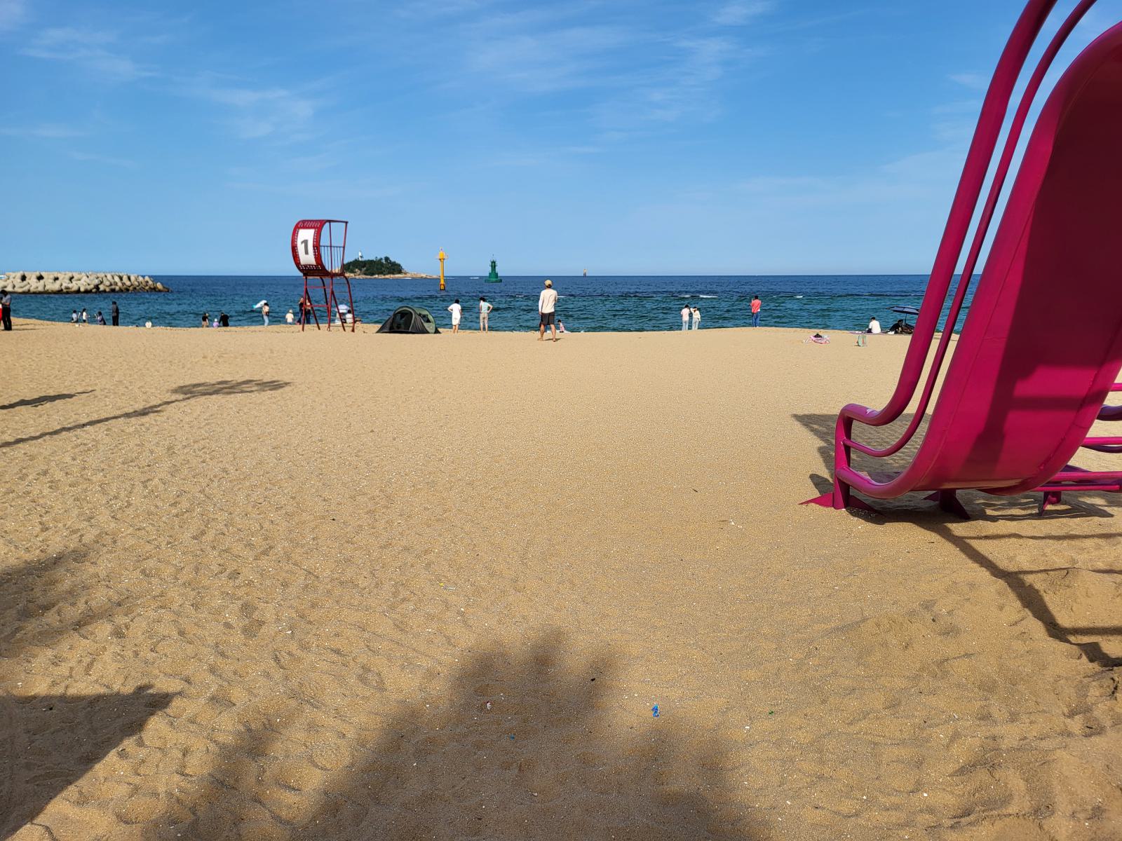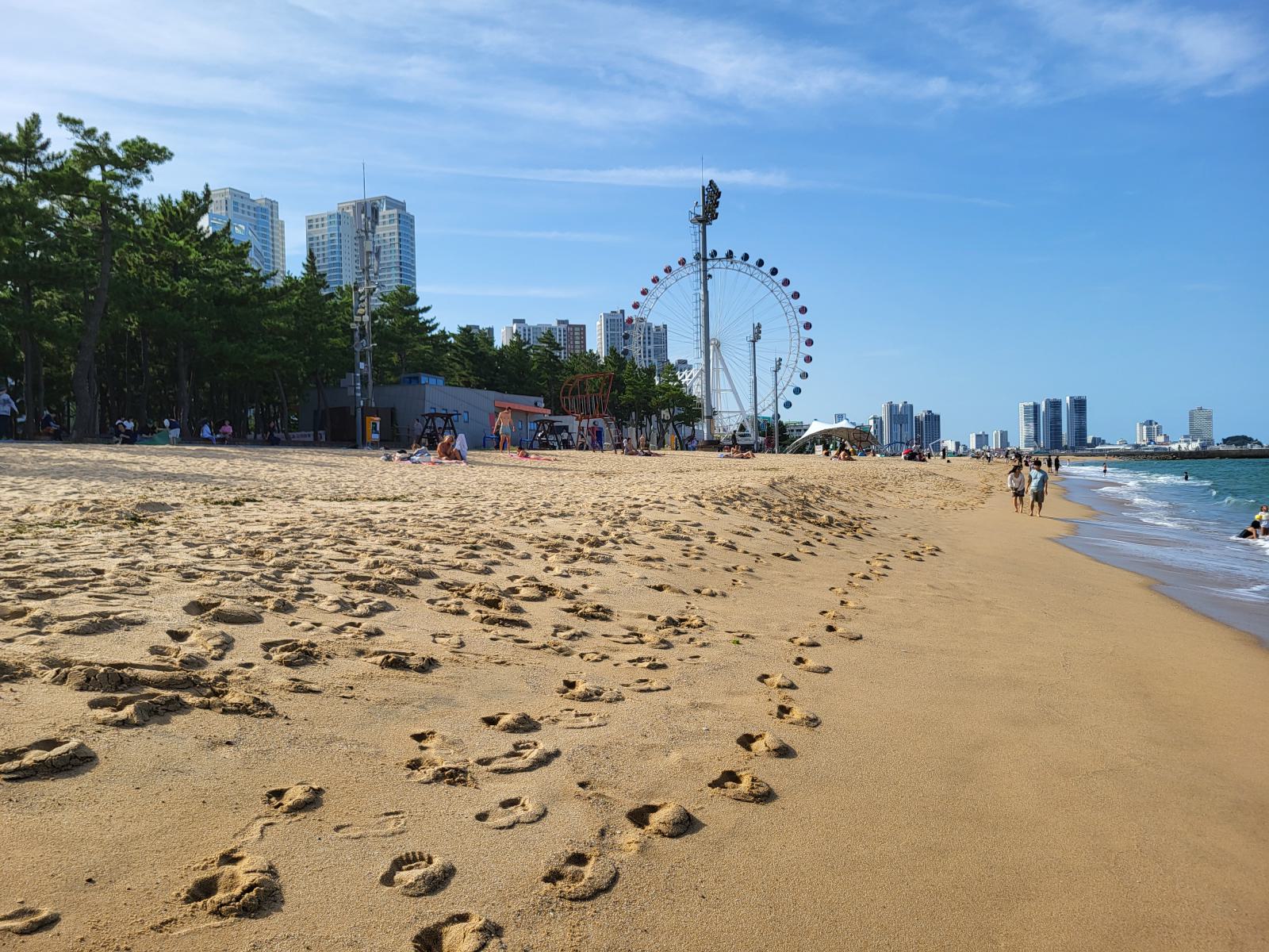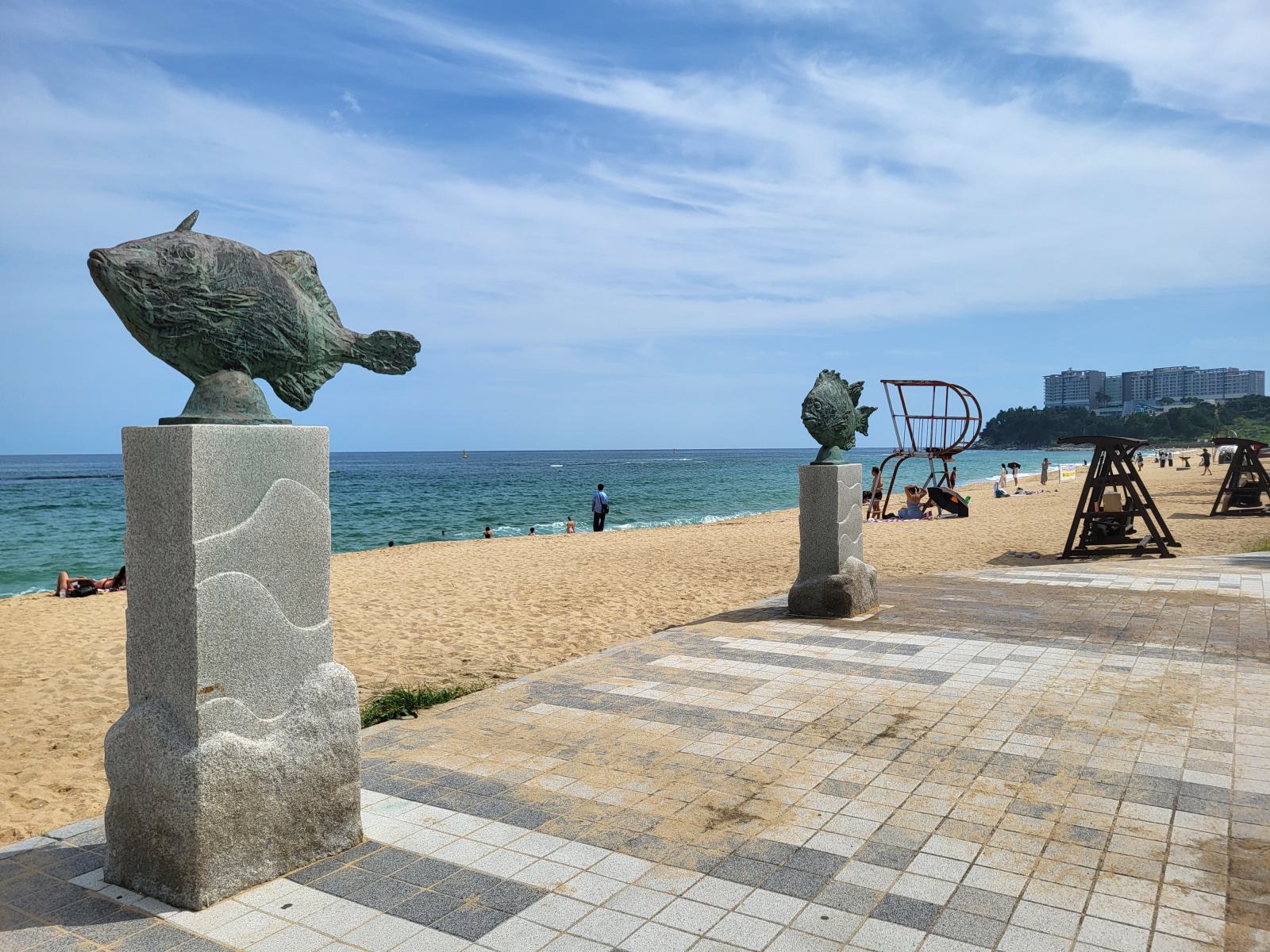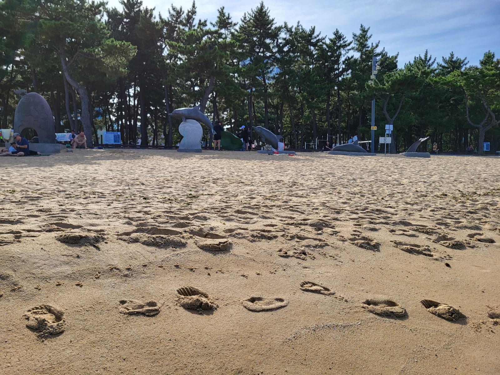 Im Schatten einer Skulptur breiteten wir unsere Decke aus und ab ins Wasser. Nichts passierte und wir sahen auch noch andere Leute in den Wellen. Glück gehabt. Der Strand war ziemlich schön, etwas tiefer, etwas Wellen und hinter einem breiten Sandstreifen fängt das kleine Pinienwäldchen an. Die meisten Koreaner badeten in voller Bekleidung, um keine Sonne abzubekommen, viele ließen sich auf großen Schwimmreifen durch die Wellen treiben.