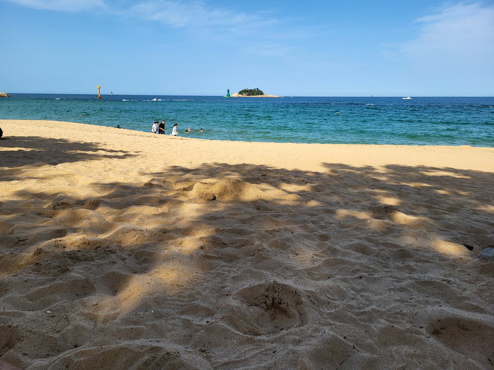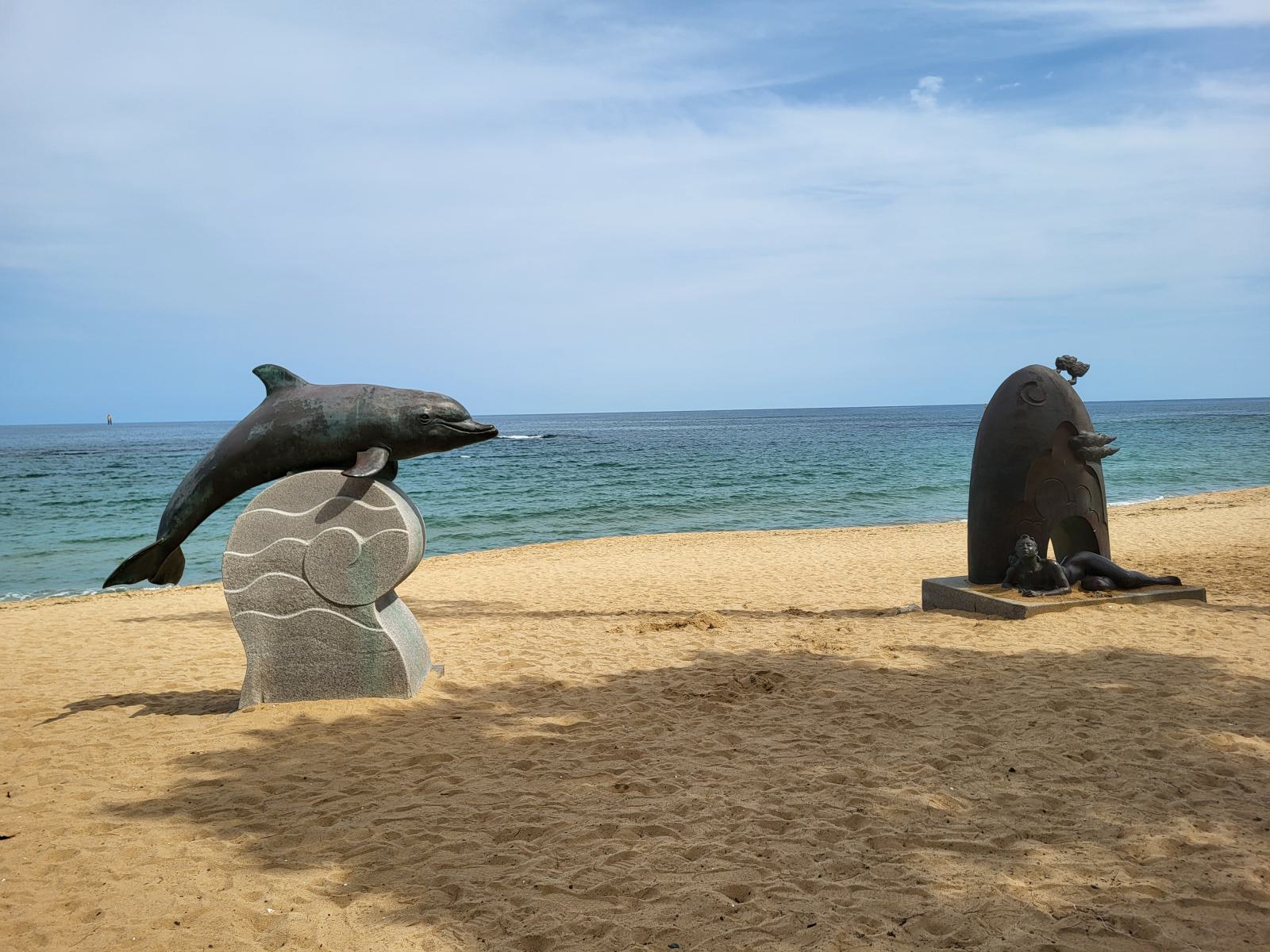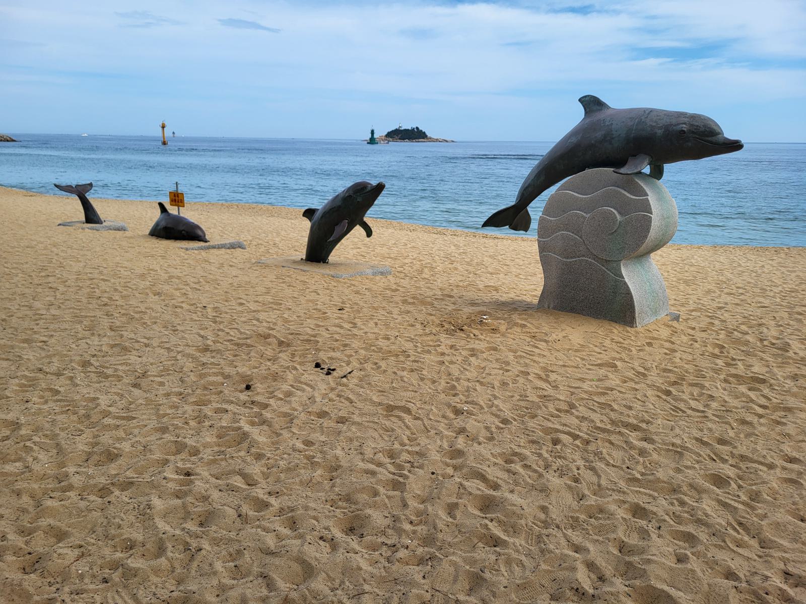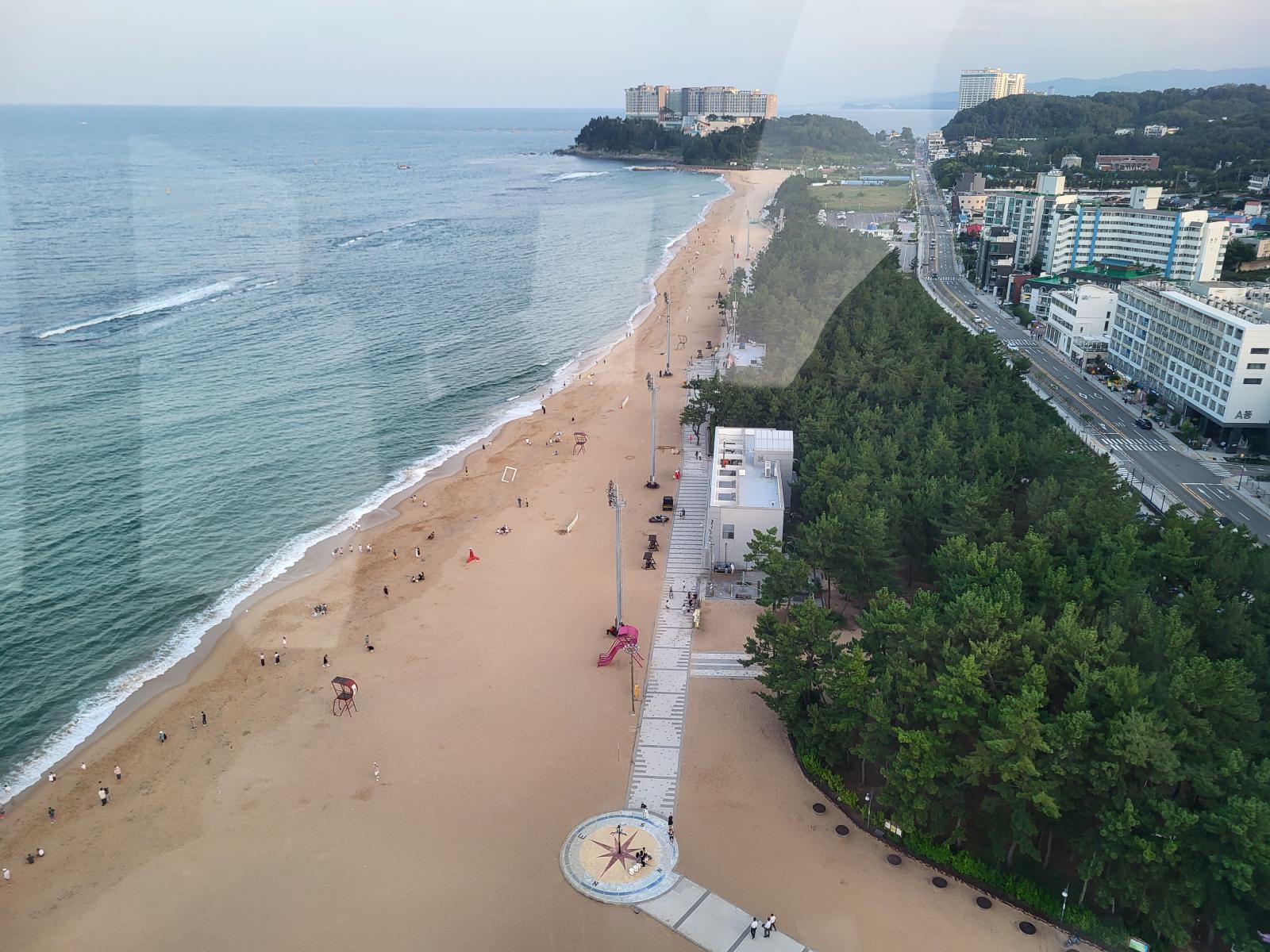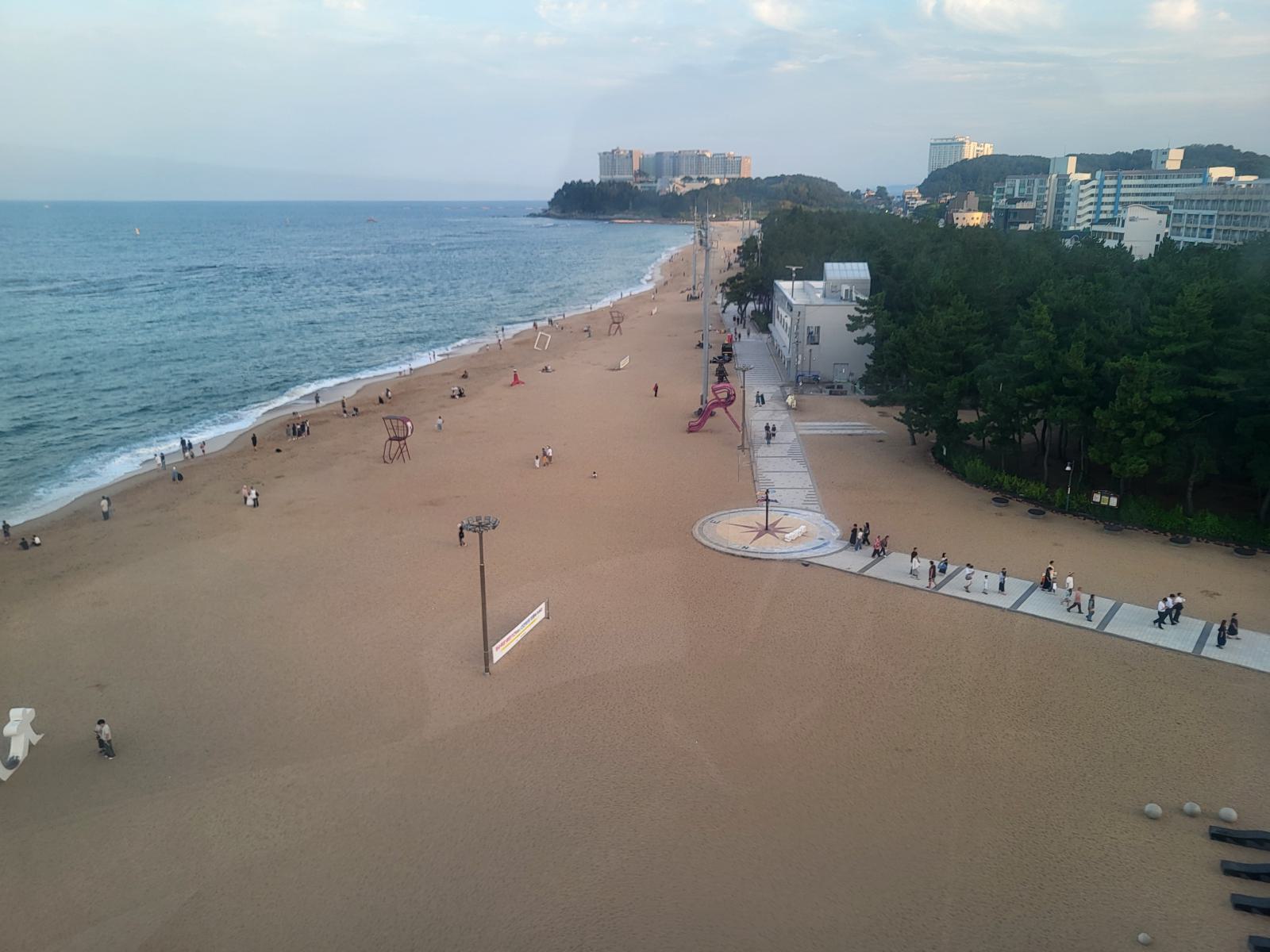 Im Schatten einer Skulptur breiteten wir unsere Decke aus und ab ins Wasser. Nichts passierte und wir sahen auch noch andere Leute in den Wellen. Glück gehabt. Der Strand war ziemlich schön, etwas tiefer, etwas Wellen und hinter einem breiten Sandstreifen fängt das kleine Pinienwäldchen an. Die meisten Koreaner badeten in voller Bekleidung, um keine Sonne abzubekommen, viele ließen sich auf großen Schwimmreifen durch die Wellen treiben.