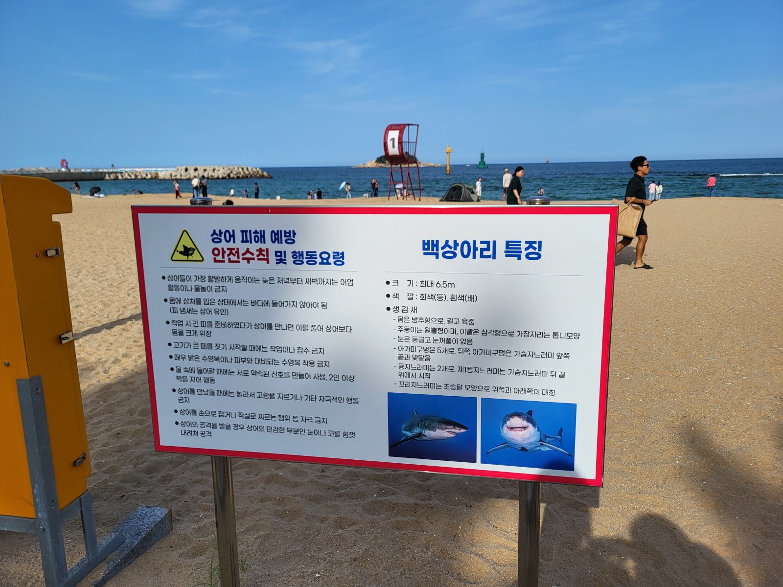 Nach ein paar Stunden hatten wir genug Wasser und Sonne und pusteten uns mit den Druckluftspendern an der Promenade frei vom Sand. An der Promenade gibt es außerdem mehrere Dusch- und Toilettenhäuschen. Weiter vorn entdeckten wir eine Tafel, wie man einen Hai erkennt und was man dann tun soll. Zu spät, zum Glück war uns keiner begegnet.
