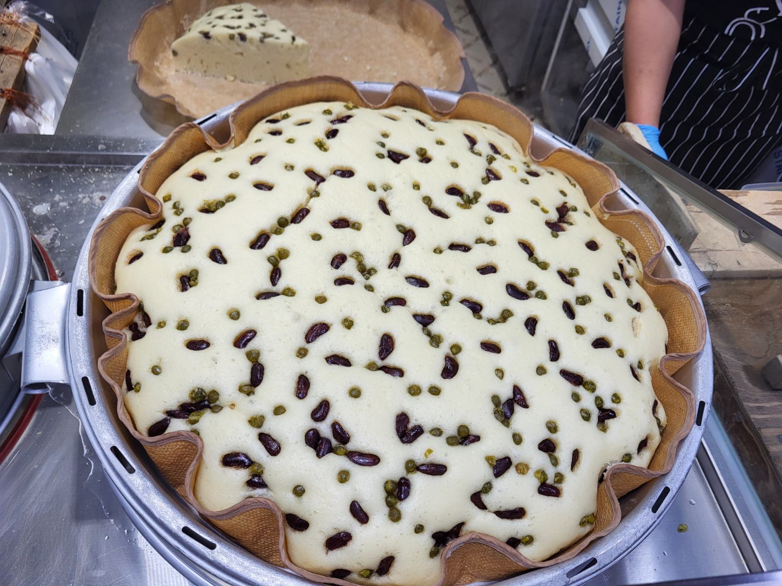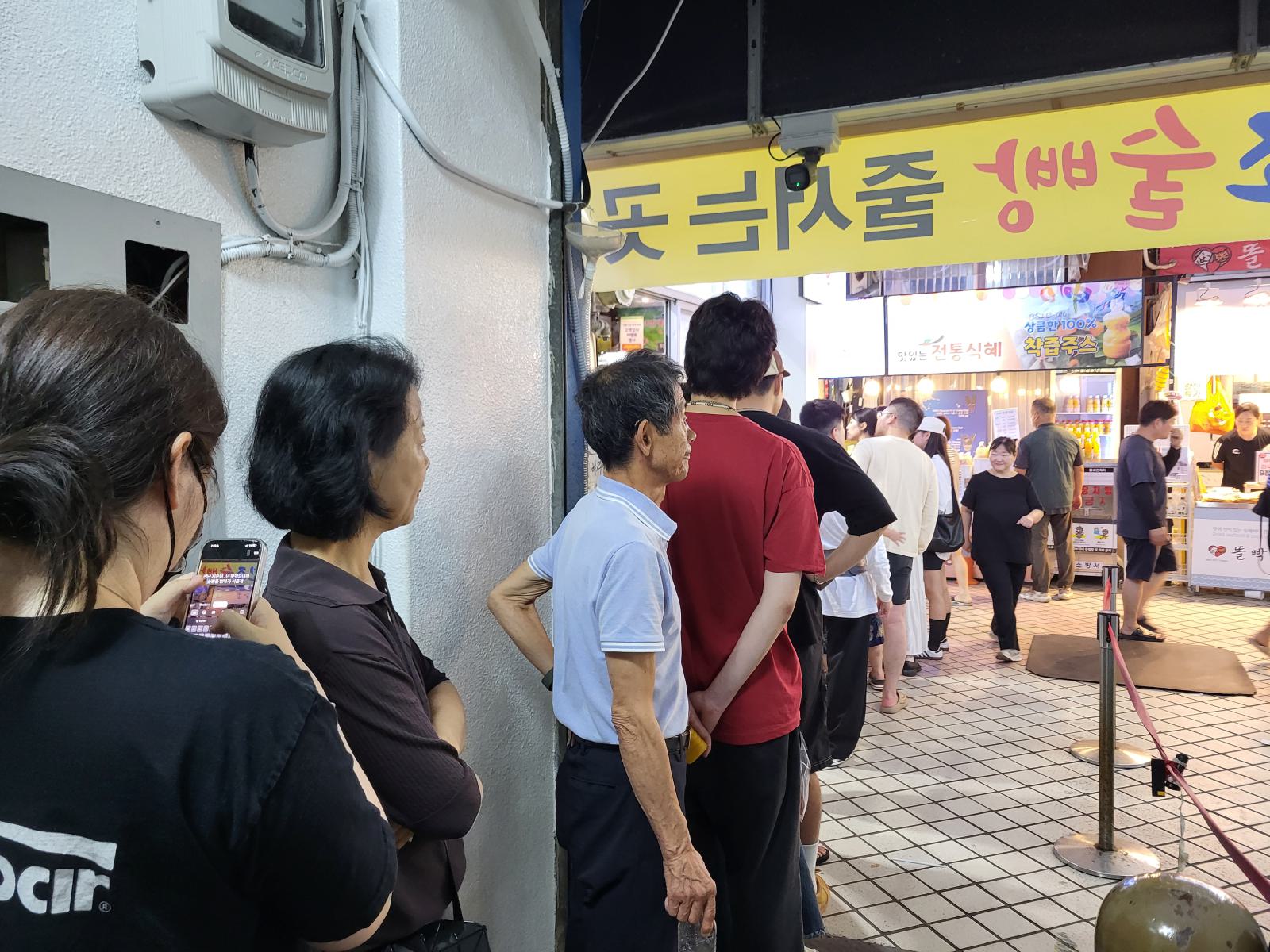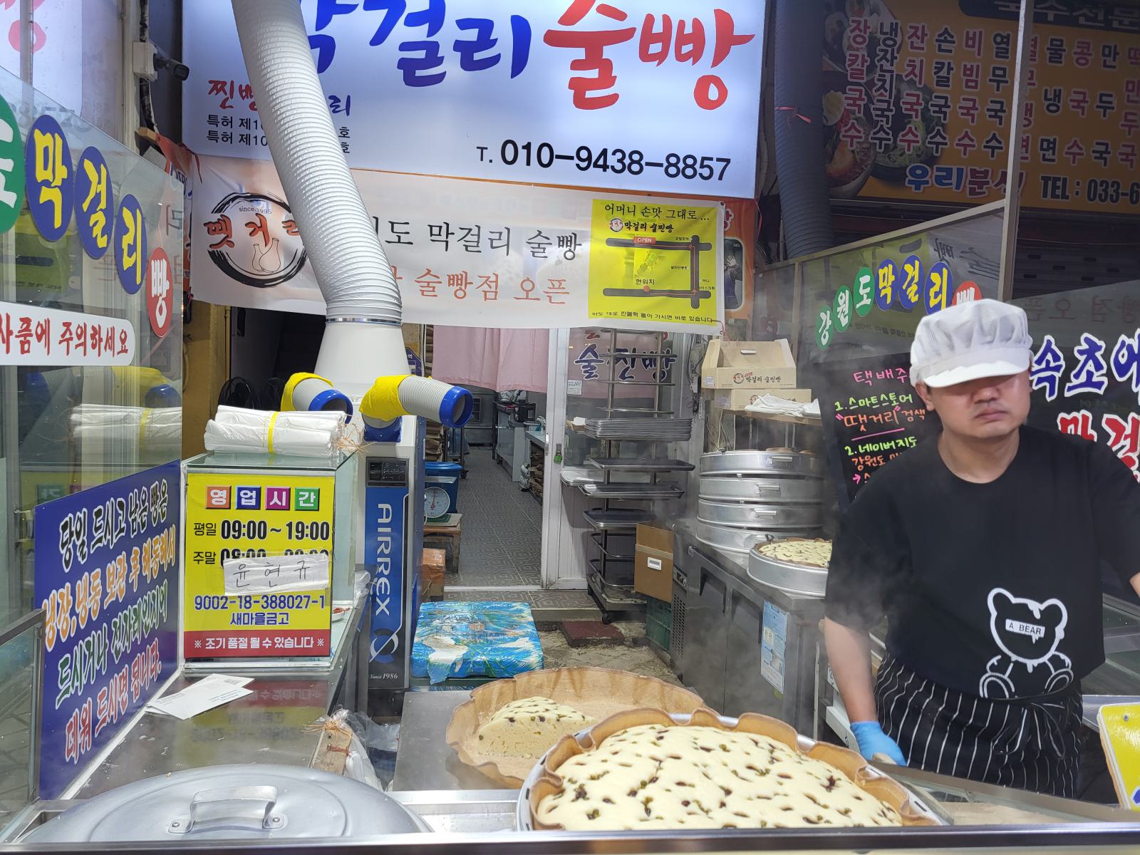 Eine weitere Spezialität in Sokcho ist Sulpang, ein riesiges Gebäckstück aus Weizen und Makgeolli statt Hefe, mit Erbsen und roten Bohnen verziert. Wir sahen einen Stand mit einer kleinen Schlange. Der muss gut sein. Als wir uns anstellen wollten, merkten wir, dass die Schlange noch um die Ecke rum ging und ganz schön lang war. So konnten wir beobachten, wie die runden Kuchen mit gut anderthalb Metern Durchmesser einer nach dem anderen aus dem Dämpfer geholt und in Achtel geschnitten wurden. Oje, ein Stück für eine Großfamilie. Noch warm bekamen wir unseres in einer Tüte gereicht, schwer und weich wie ein Kissen. Geschmacklich? Ganz ok, aber etwas langweilig. Entweder stehen Koreaner einfach total gern Schlange oder es gibt hier sonst kein Hefegebäck.