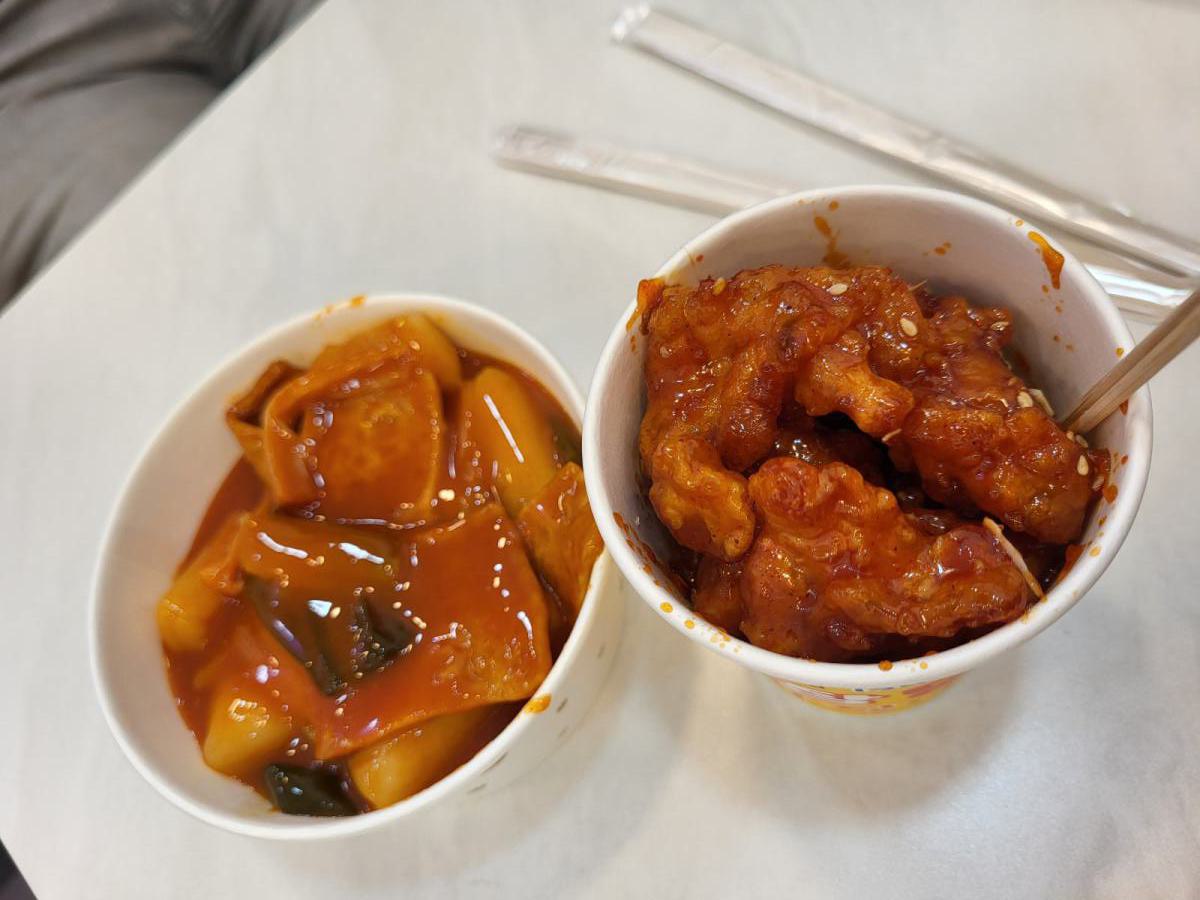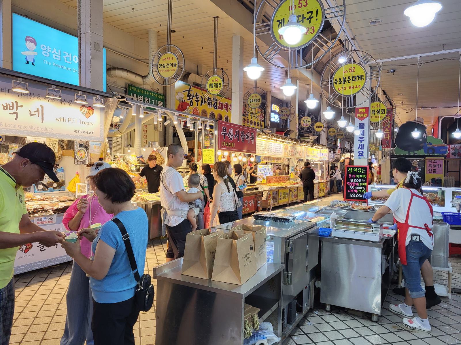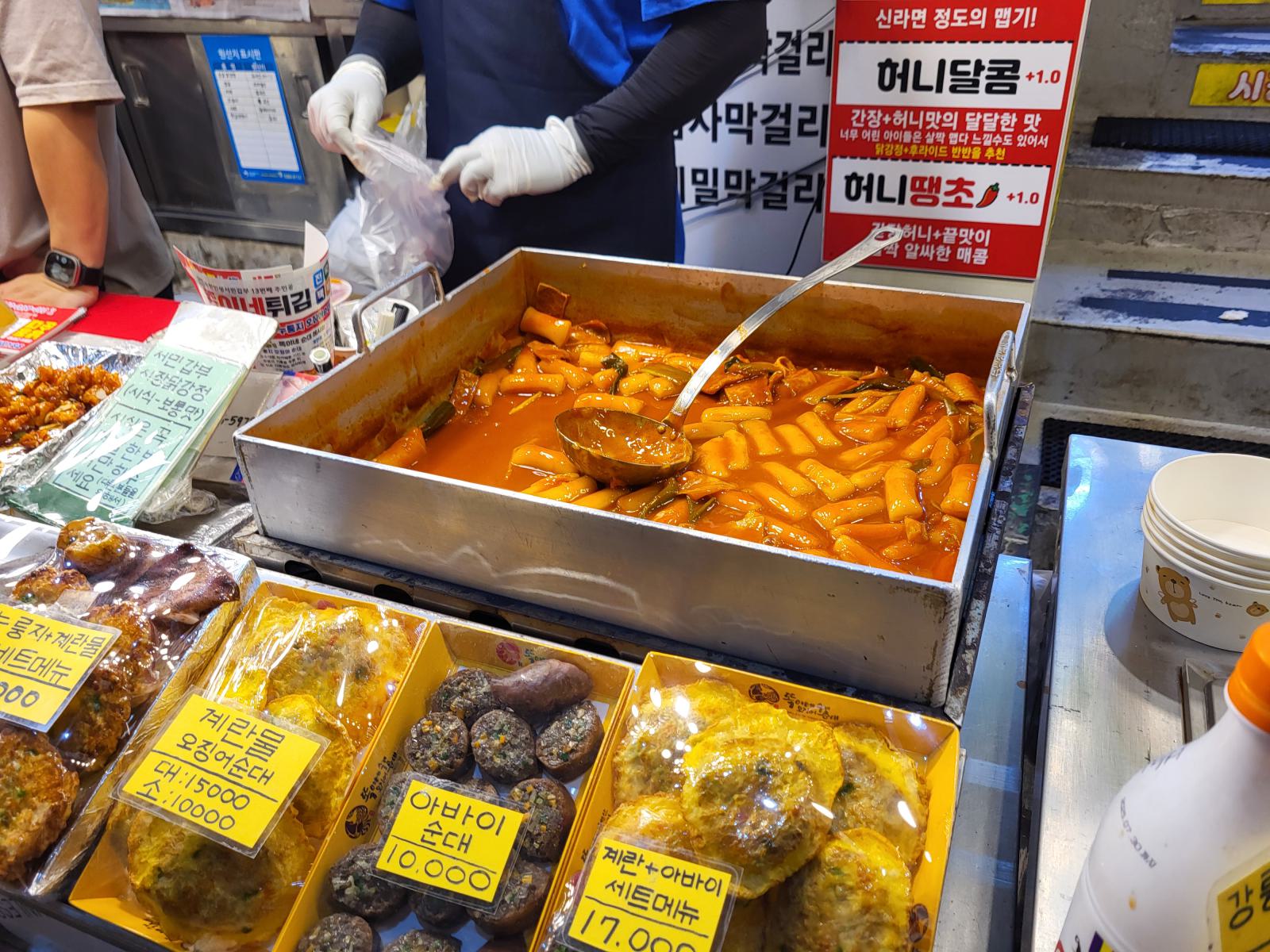 Am Abend landeten wir wieder auf dem Fischmarkt. Wir kauften Bustickets und kamen auf dem Weg zurück von der anderen Seite rein. Um den Fischmarkt kommt man einfach nicht drum herum. In den engen Gassen rings um den Markt dampften große Kessel, aber wir futterten uns heute lieber durch die Hallen. Tteokbokki, das sind Reiskuchen in scharfer Soße, und frittiertes Hähnchen standen auf dem Speiseplan. Hinter den meisten Essensstände gibt es sogar frostig klimatisierte Sitzbereiche.