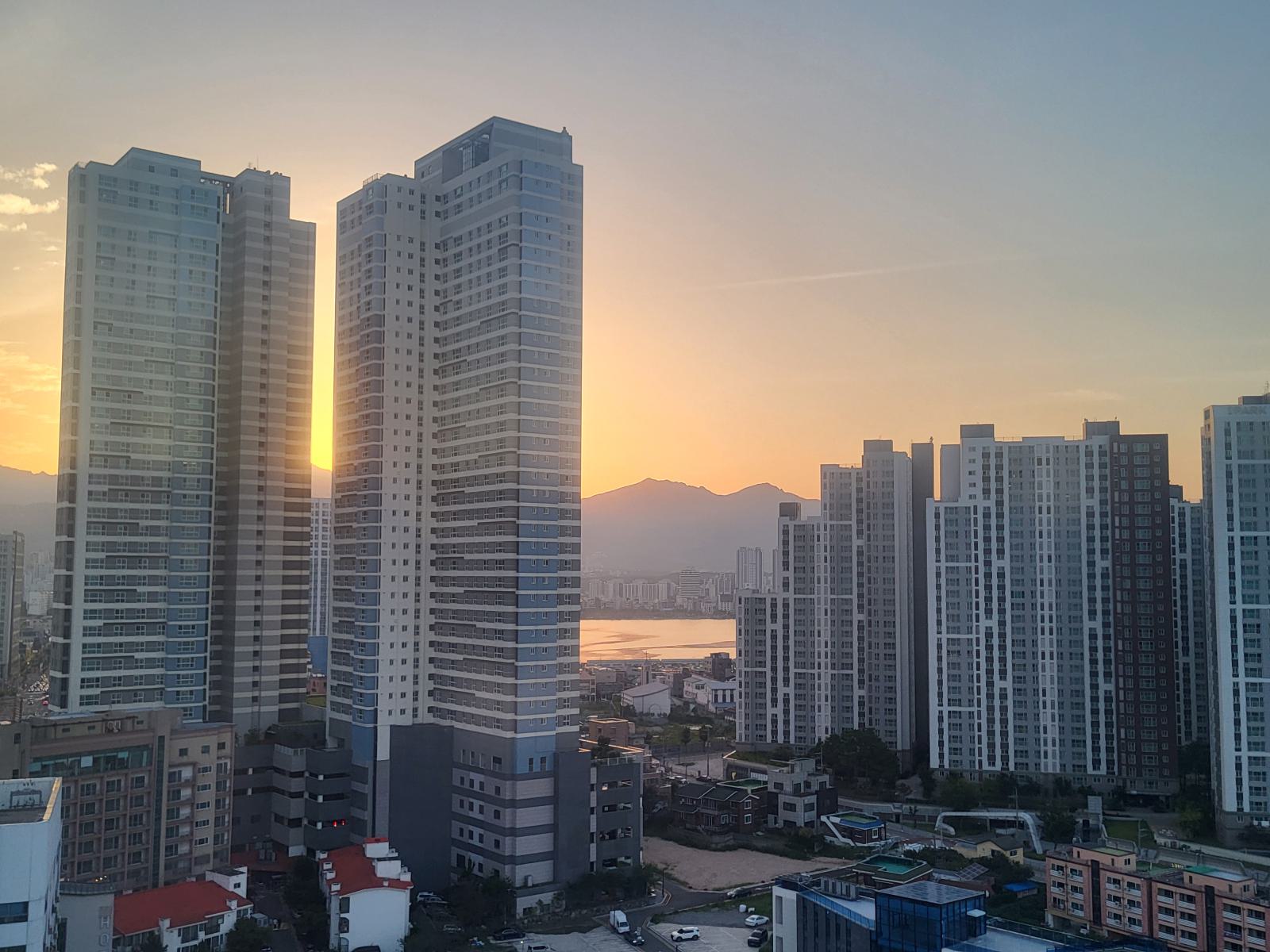 Am Morgen war die Aufregung groß, es war heiß und sonnig, der perfekte Badetag. Aber was ist nun mit diesen seltsamen koreanischen Strandregeln? Ich spähte vom Balkon. Sind da Leute im Wasser? Vielleicht. Also versuchten wir unser Glück. Unten vor der Tür standen zwei Männer in Badehosen in einer Dusche mitten im Parkhaus, die wir vorher noch nie gesehen hatten und pulten sich Sand aus den Zehen. Die kamen vom Strand, ich starrte sie an.